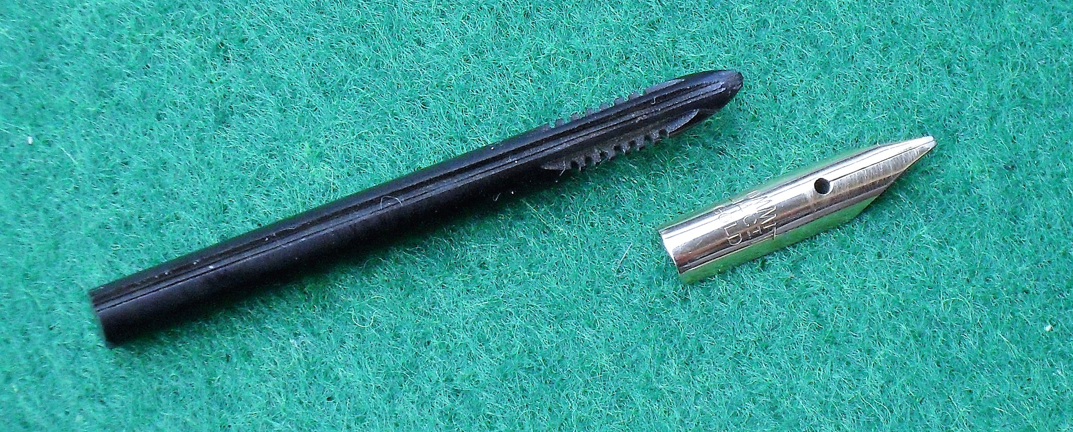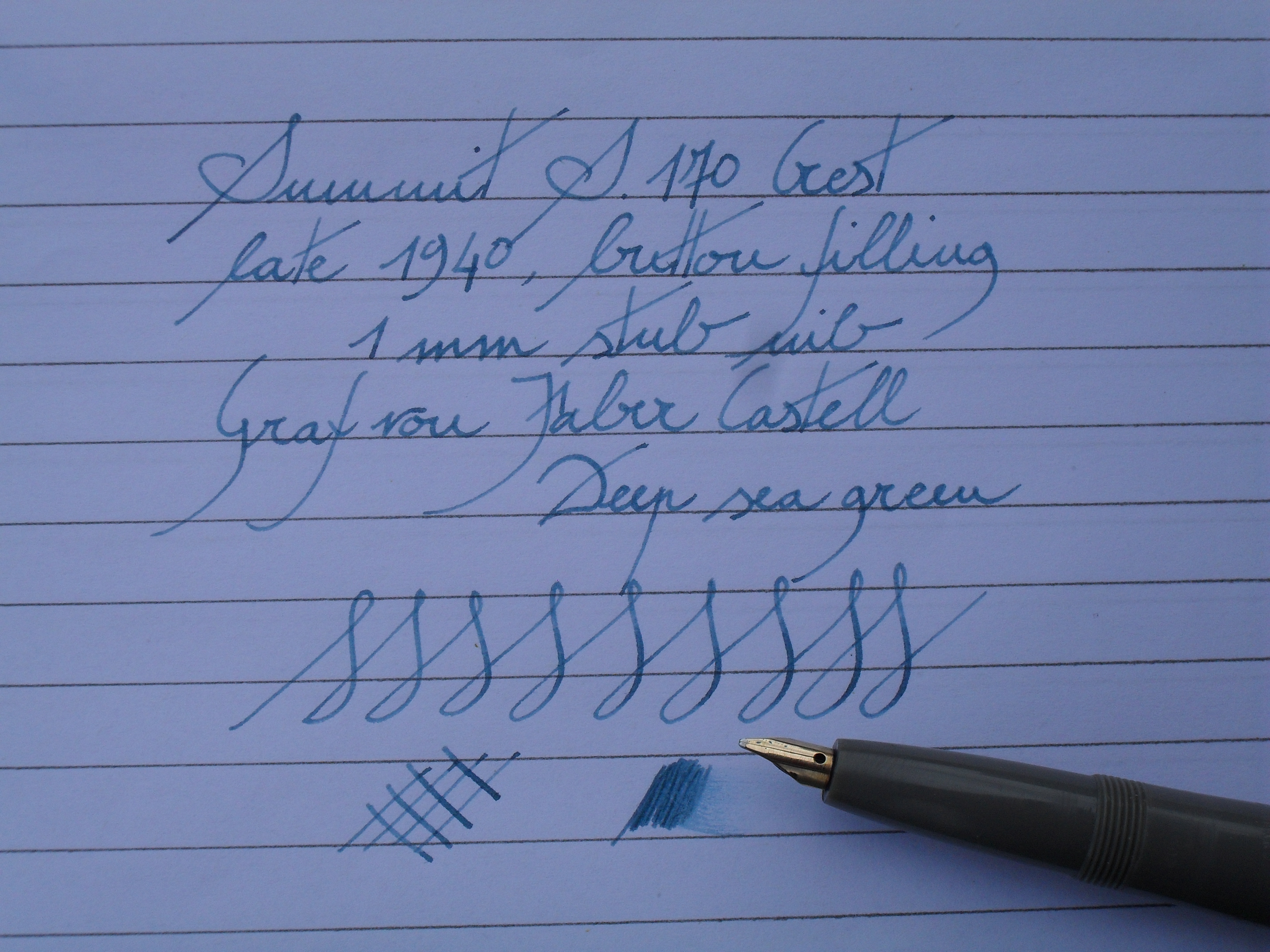 Il pennino parzialmente carenato, d'oro a 14 carati, è molto fermo, con punta stub di circa 1 mm.