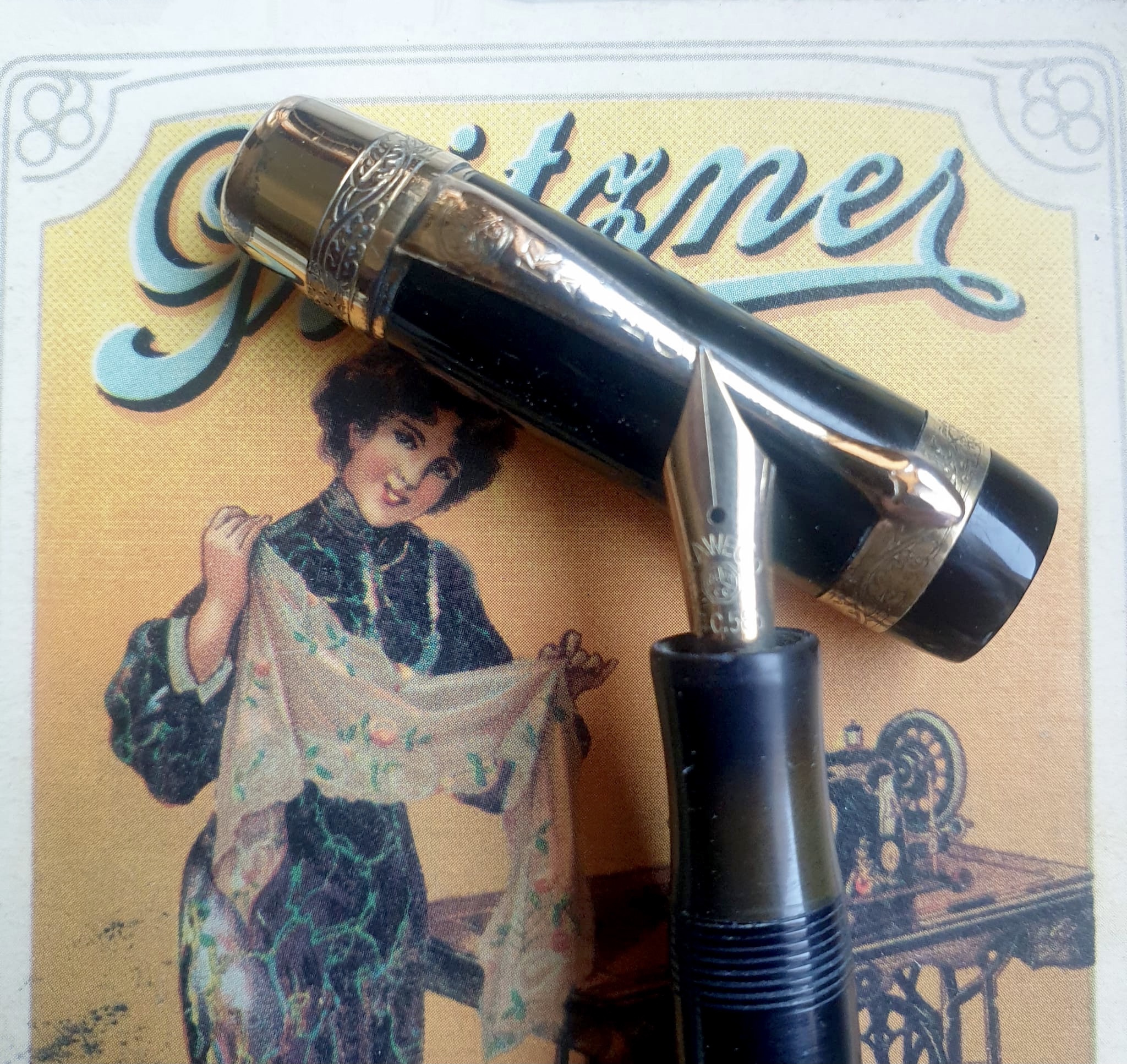 "Kaweco Original" in celluloide (condotto in ebanite), con finiture in ottone dorato, degli anni 20/30. Caricamento a bottone di fondo.