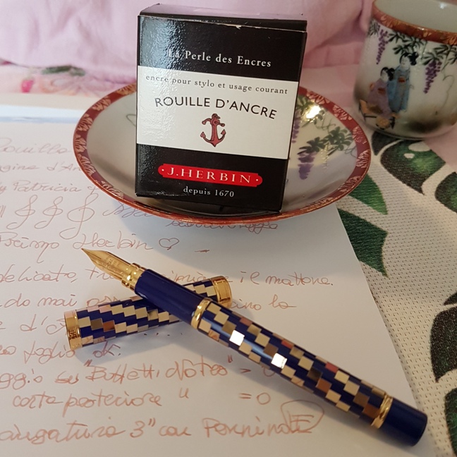 Il negozio è piccolo, ma accogliente e pieno di tesori; sono entrata decisa a prendere Rouille d'Ancre, ma è stato difficile comprare solo questo: la varietà di colori, calamai allineati e prove su carta mi hanno complicato la scelta. Beh! Per farla breve ho riempito una cartuccia vuota della Waterman e caricato Lady P.