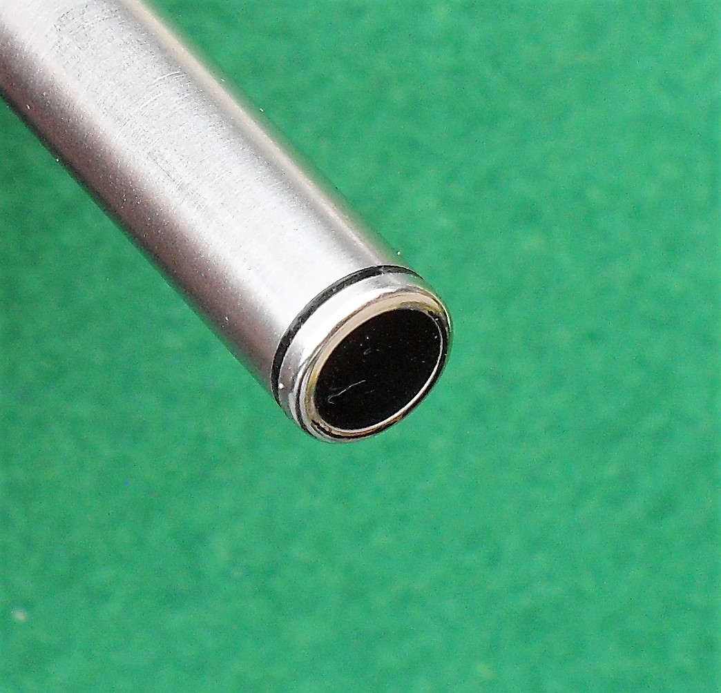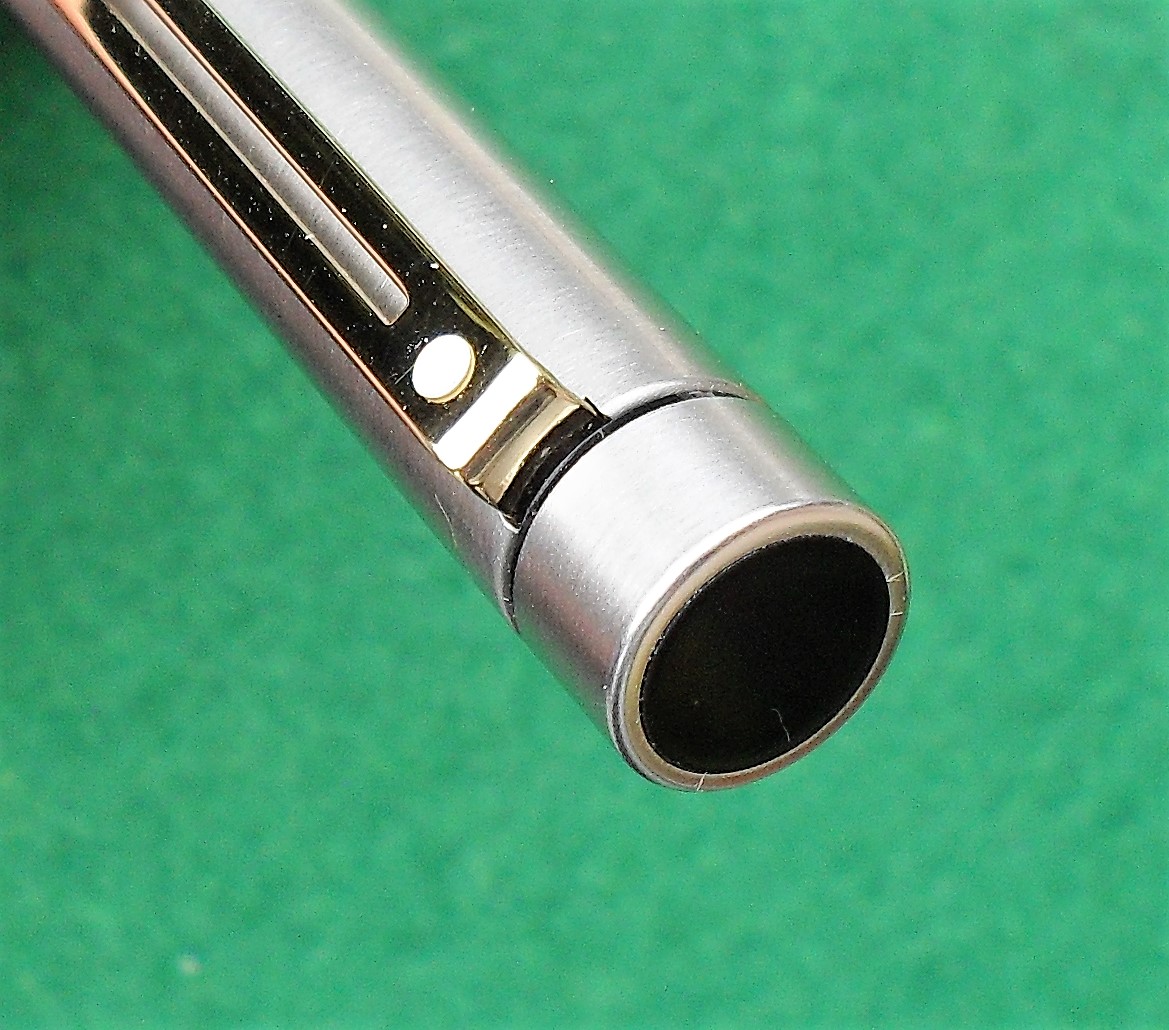 La pulizia della linea della penna chiusa è esaltata dalla mancanza d’un anello a contrasto alla base del cappuccio o del corpo. Due sottili anelli incisi e smaltati in nero aggiungono un tocco di rifinitura molto piacevole e si sposano benissimo con i due terminali “flat top”, nei quali sono incastonati due dischi anch’essi neri. Ecco qualche dato dimensionale: