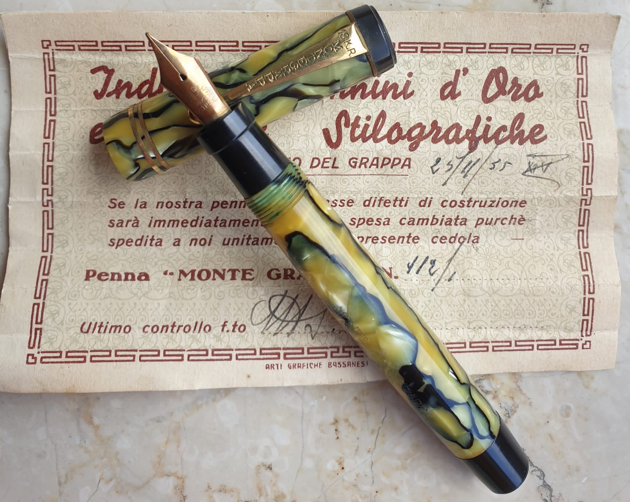 Altra penna di...ispirazione U.S.A. Con tanto di certificato numerato, datato e firmato a mano. Stupenda la celluloide tornita, mai inchiostrata. MONTE GRAPPA 112/1 - Novembre 1935.