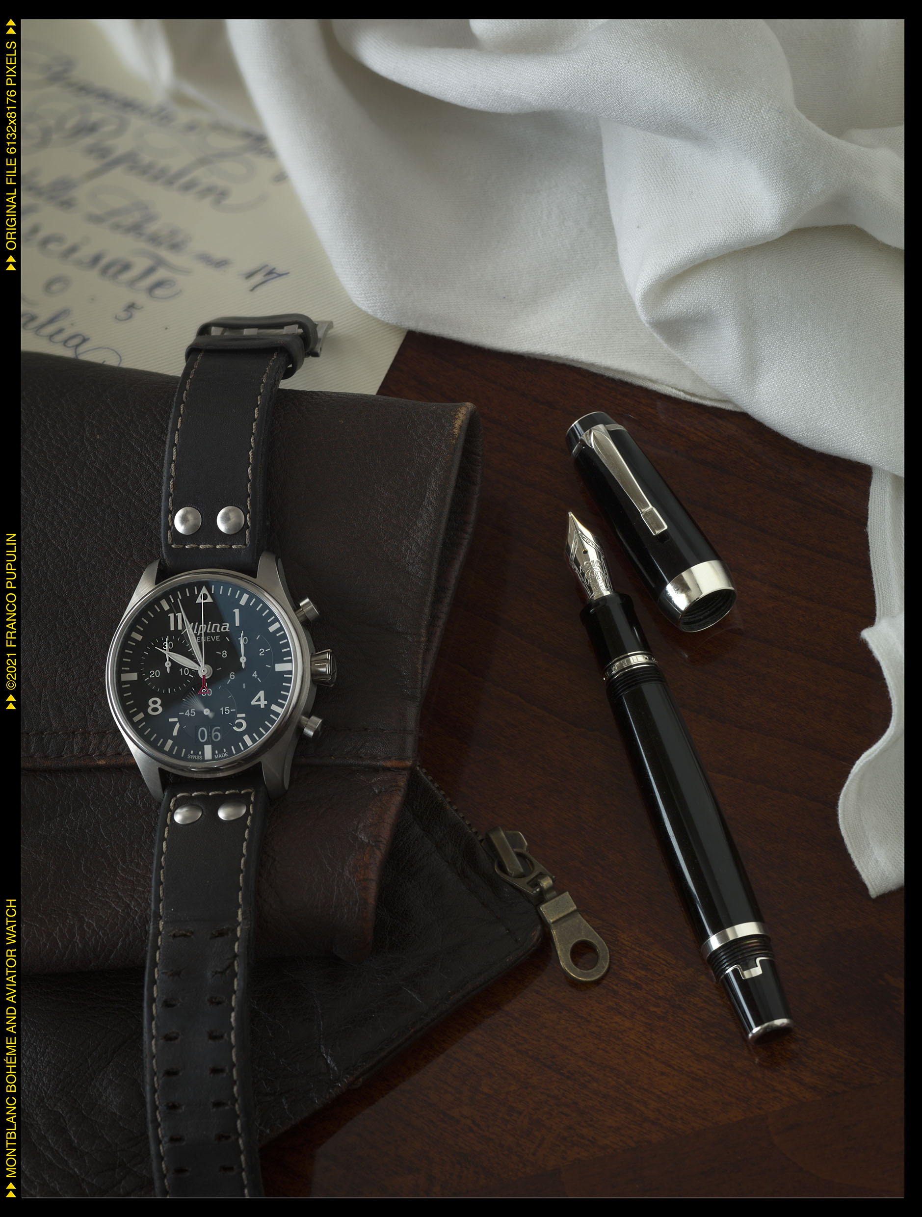 Non avevo mai fatto caso a quanto sia complicato fotografare un orologio, specie se vivo (nel senso di non fermo). Farlo in unione con una penna, con tutti i suoi riflessi da tenere presente deve essere divertente. In ogni caso da profano di fotografia di orologi la lancetta dei minuti messa proprio sulla "A" di Alpina ma che lascia leggere quel che c'è sotto mi ha colpito, grazie.