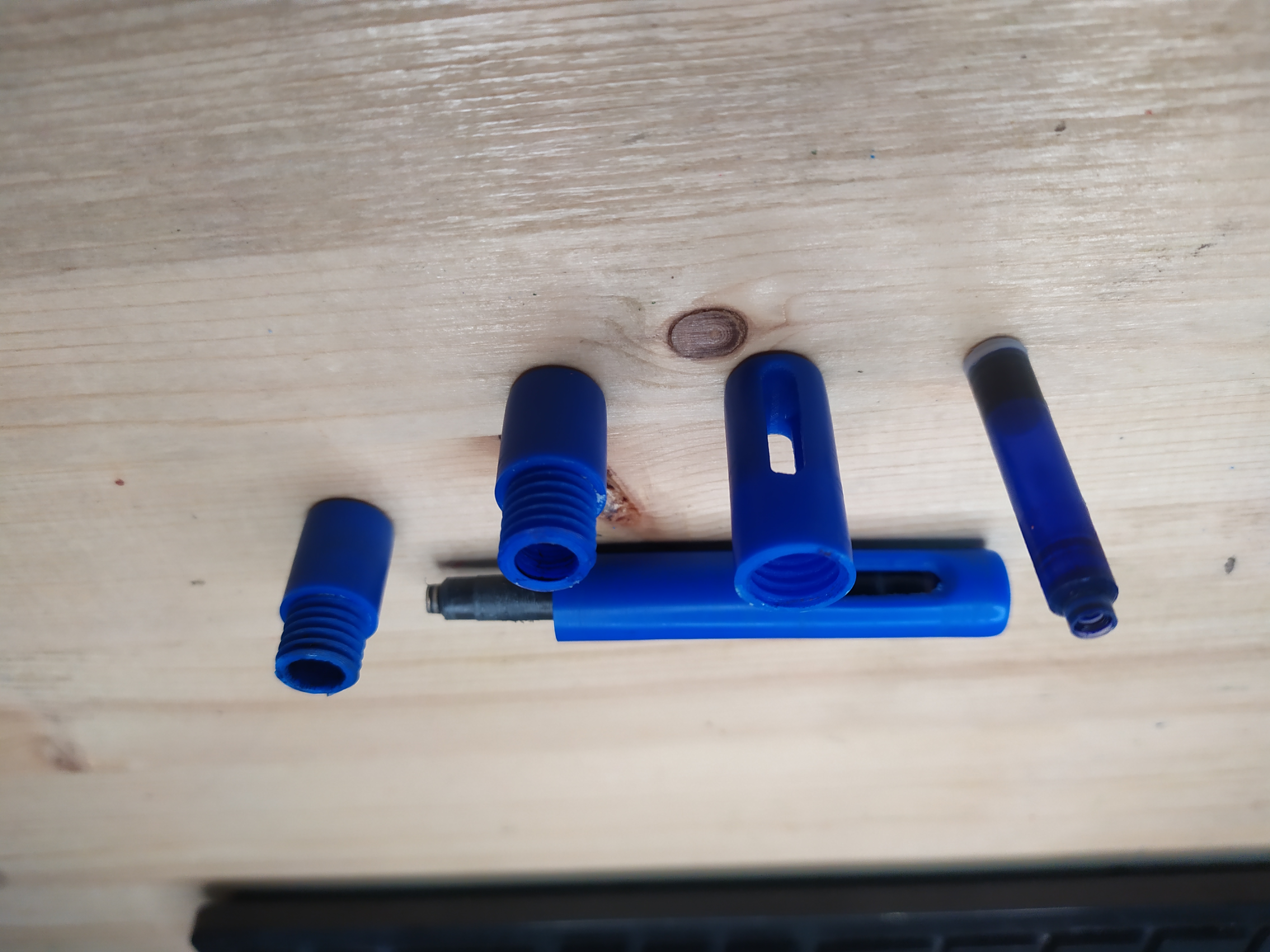 Credo di aver capito che l'intento del progetto è quello di consentire il trasporto sicuro di cartucce aperte e ricaricate con una siringa. In tal caso vorrei suggerire di prendere spunto dalle cartucce ricaricabili Noodler's 308, sarebbe davvero di gran utilità avere cartucce con attacco standard ricaribili tramite siringa o contagocce.