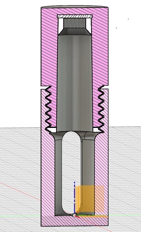 Non è nemmeno necessario rastremare il foro in cima, perché comunque la cartuccia è tenuta bene in posizione dal resto della custodia e non si può muovere: anche questo facilita la realizzazione e le tolleranze.