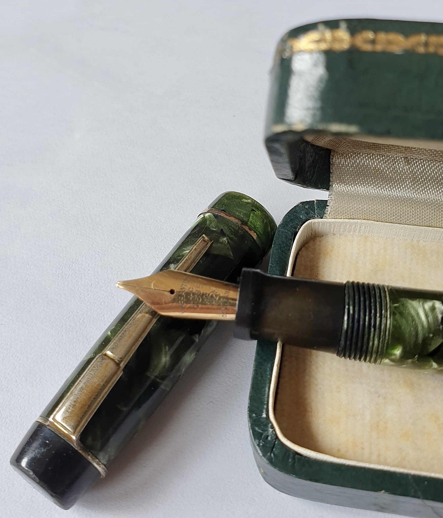 “Richard-Morges. Made in England”, stilografica in celluloide, caricamento a levetta, pennino 14 C con il caratteristico unicorno e la scritta “osmiridium”. Penna commercializzata negli anni ‘40 dalla ditta “Richard” di Morges (Svizzera) che commissionava le sue penne alla "Unique Pen Co., LTD.” di Londra.