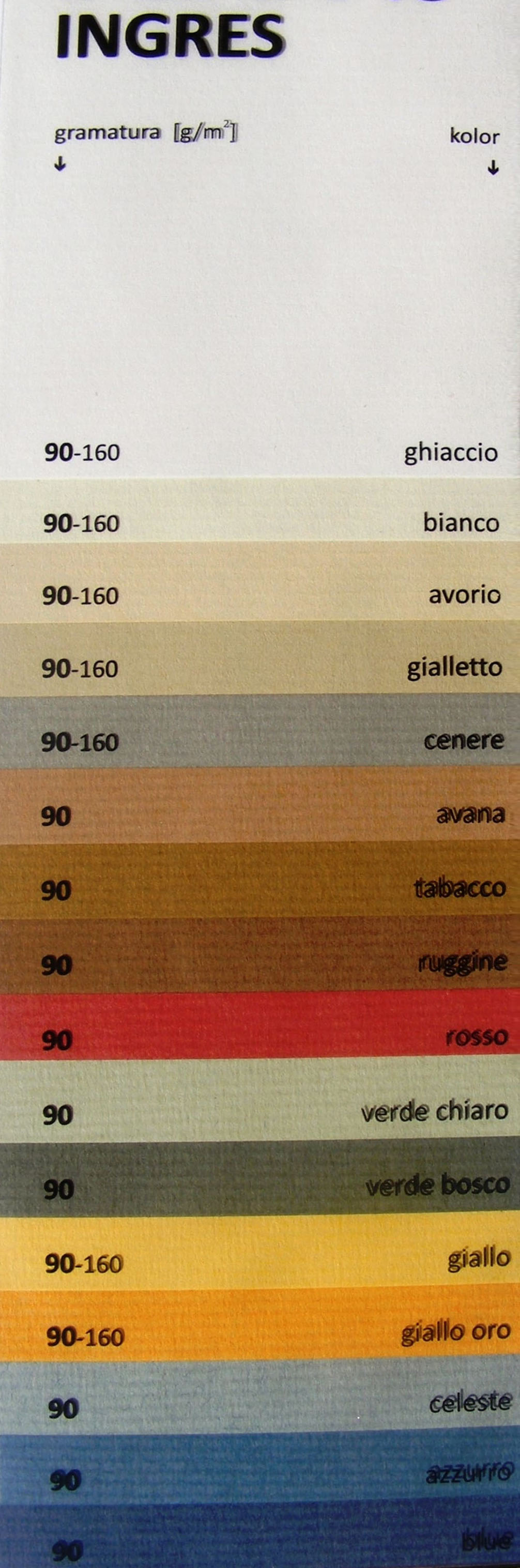 Il colore della carta vergata gialletto di Fabriano in realtà ha ben poco a che vedere con il giallo, né con le focacce né con i meloni siciliani. La cosa sembra in linea con la visione un po’ daltonica di coloro che hanno assegnato i nomi dei colori alla carta vergata Ingrés. Sotto ve ne allego un elenco completo. Come potrete vedere, il "ghiaccio" è in realtà bianco, il "bianco" è avorio, il colore "avorio" è piuttosto una tinta camoscio, e il “giallletto” è un marroncino piuttosto desaturate (che altri chiamano “fango”).