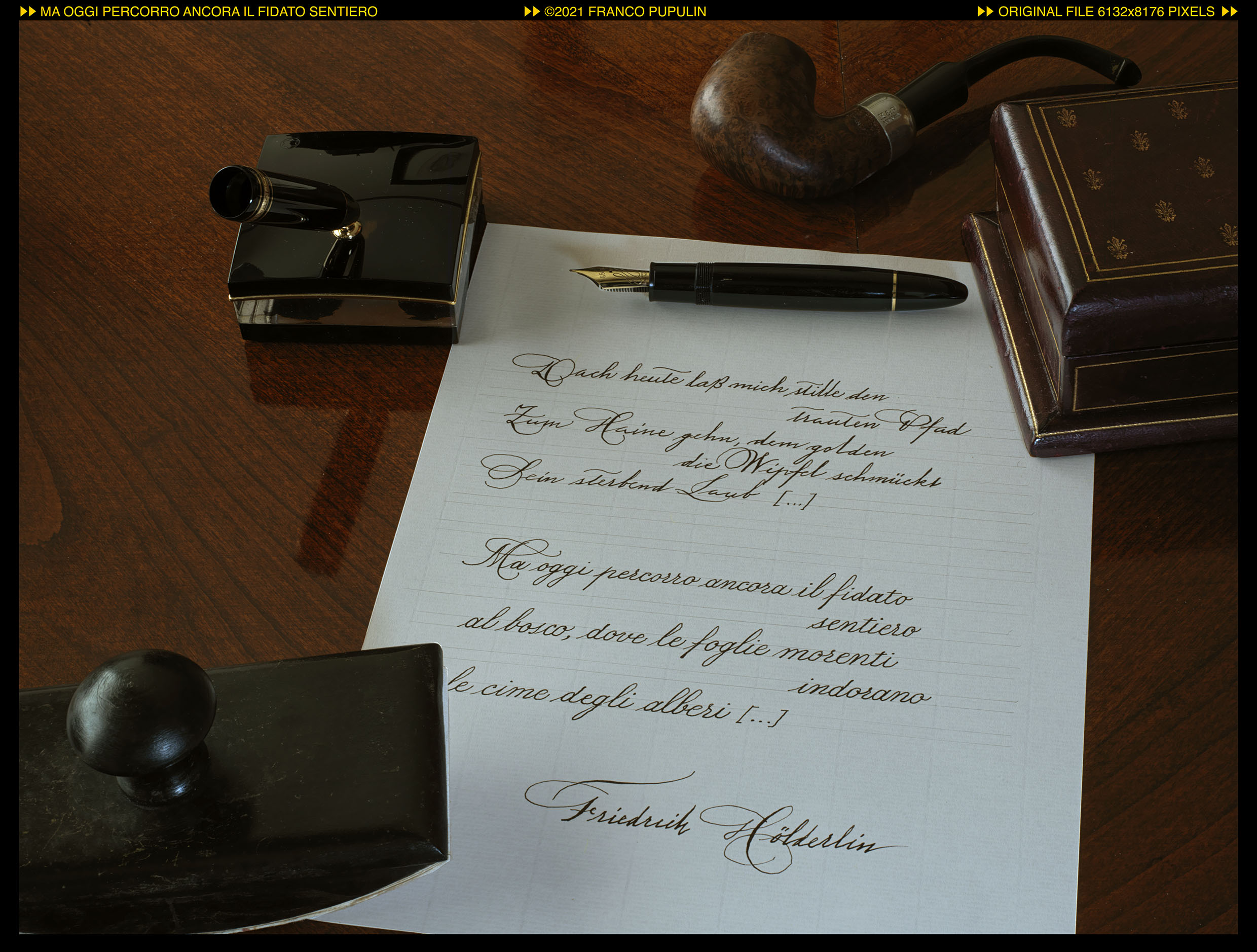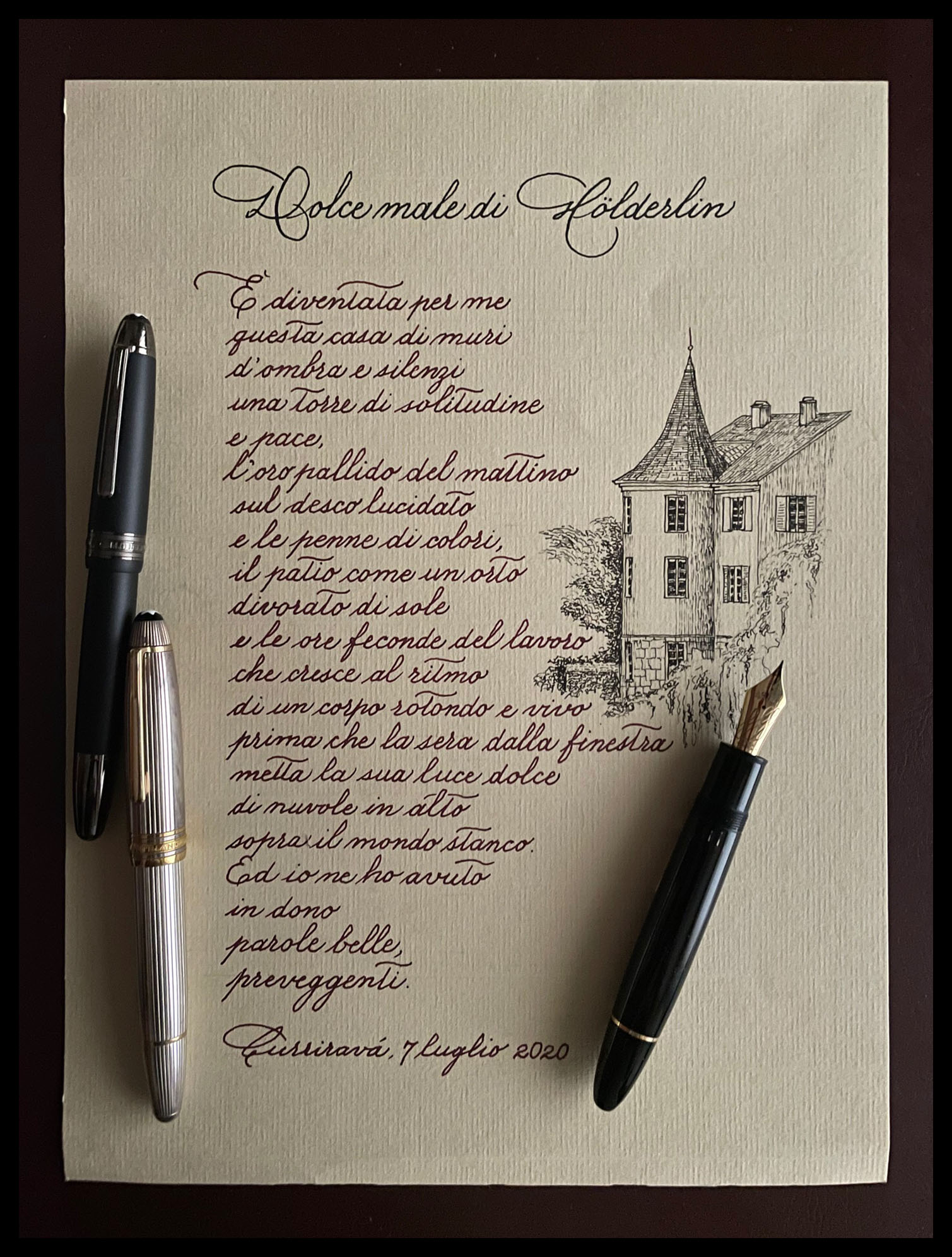 Ho scritto i testi con penne dalla punta media: la Montblanc Meisterstück 146 Ultra Black per il titolo (con inchiostro Montblanc Mystery Black) e il resto con la Montblanc Solitaire 146 Pinstripe, caricata con Graf von Faber Castell Garnet Red. Il disegnino della torre di Hölderlin é fatto con la Montblanc 149 Calligraphy e l'inchiostro Black Permanent. La carta é Fabriano Ingrés "gialletto" da 140 g.