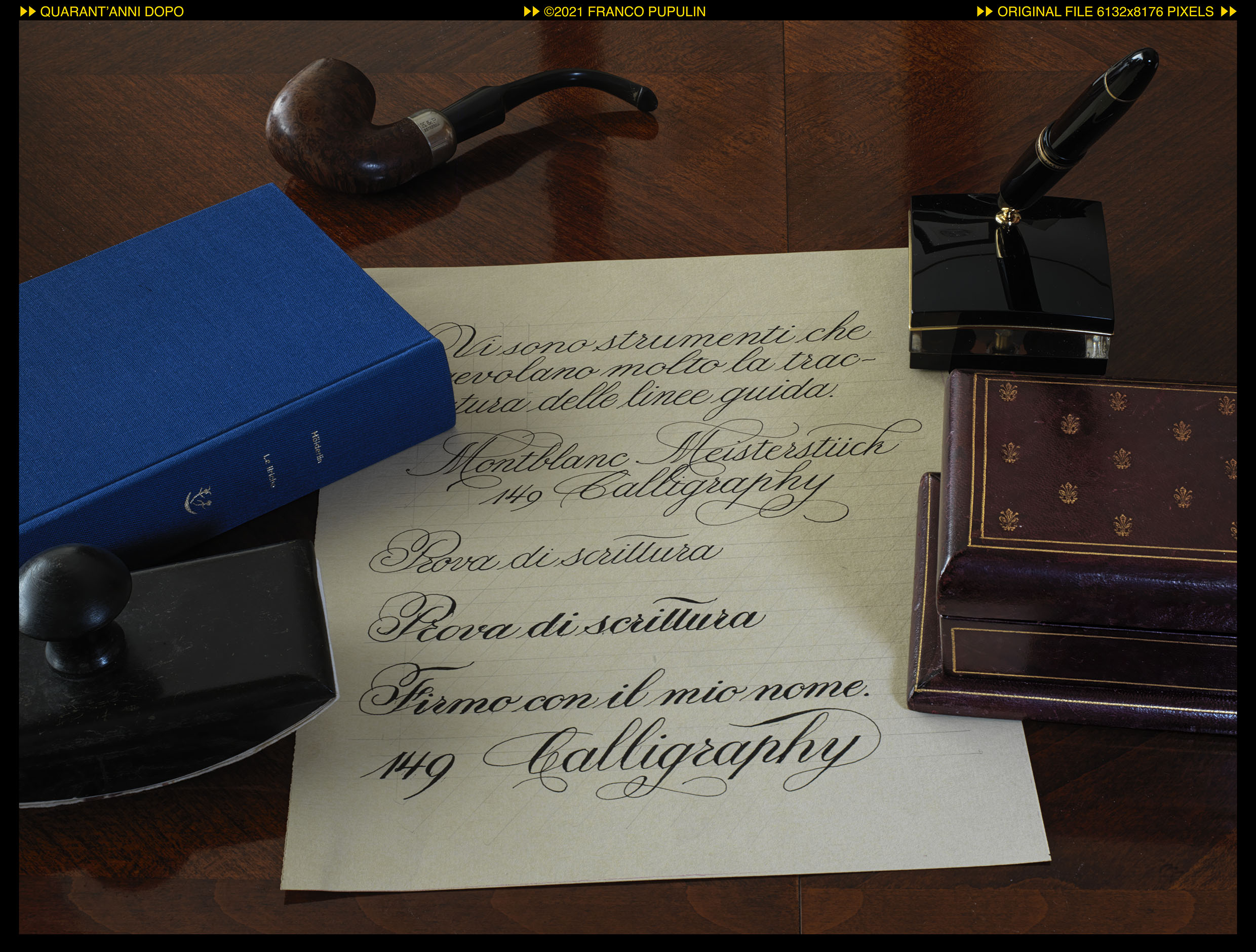 La scatola non é musicale, ma ancora si conserva, insieme a molte delle cose del ritratto di quarant'anni fa. La bellissima lente di tartaruga della nonna, che mi aveva prestato per il ritratto, la ritrovai dopo molti anni, fatta in molti pezzi e irrecuperabile, in un cassetto della casa avita. Già allora avevo la mia Meisterstück 149 con pennino extra-fine, che avevo comprato un paio d'anni prima.