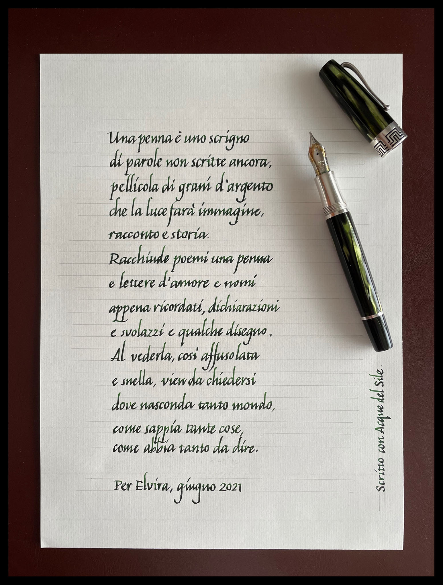 E' la cura delicata del nostro rapporto con le cose, non quello utilitaristico, quotidiano, ma quello riflessivo, profondo. Una penna crea lo spazio e il tempo per non dimenticare ció che davvero conta, offre le linee e i punti perché diventi pensiero compiuto, fermato sul foglio, per quanto ancora incompleto e a volte carente di bellezza. Spesso, se non fosse per la penna, resteremmo muti. Questo voglio condividere con voi: che non siamo ciechi, non sordi, non privi di un'anima e della sua bellezza... solo dimentichi di dirlo.