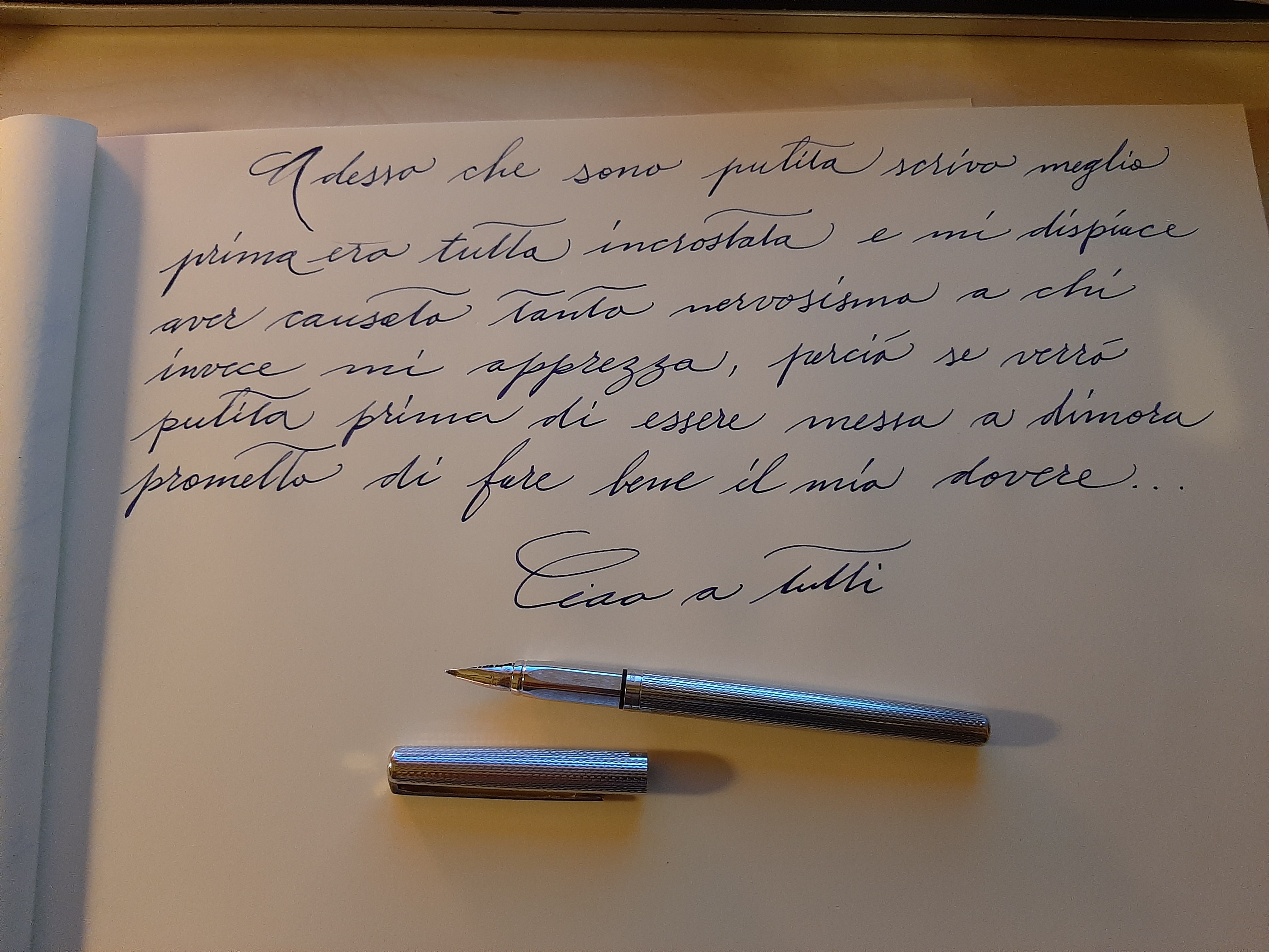 a seguito del video di Marco Chiari sono riuscito a smontare questo benedetto pennino, che in fin dei conti è semplicemente inserito all'interno dell'alimentatore non vi sono filettature, quindi la mia penna era reduce da anni di sporcizia (del vecchio proprietario, l'ho acquistata la settimana scorsa), quello che mi fa specie è la tenacia che un inchiostro rinsecchito dimostra, (IMS), Ora vi elenco i assaggi di questi giorni: