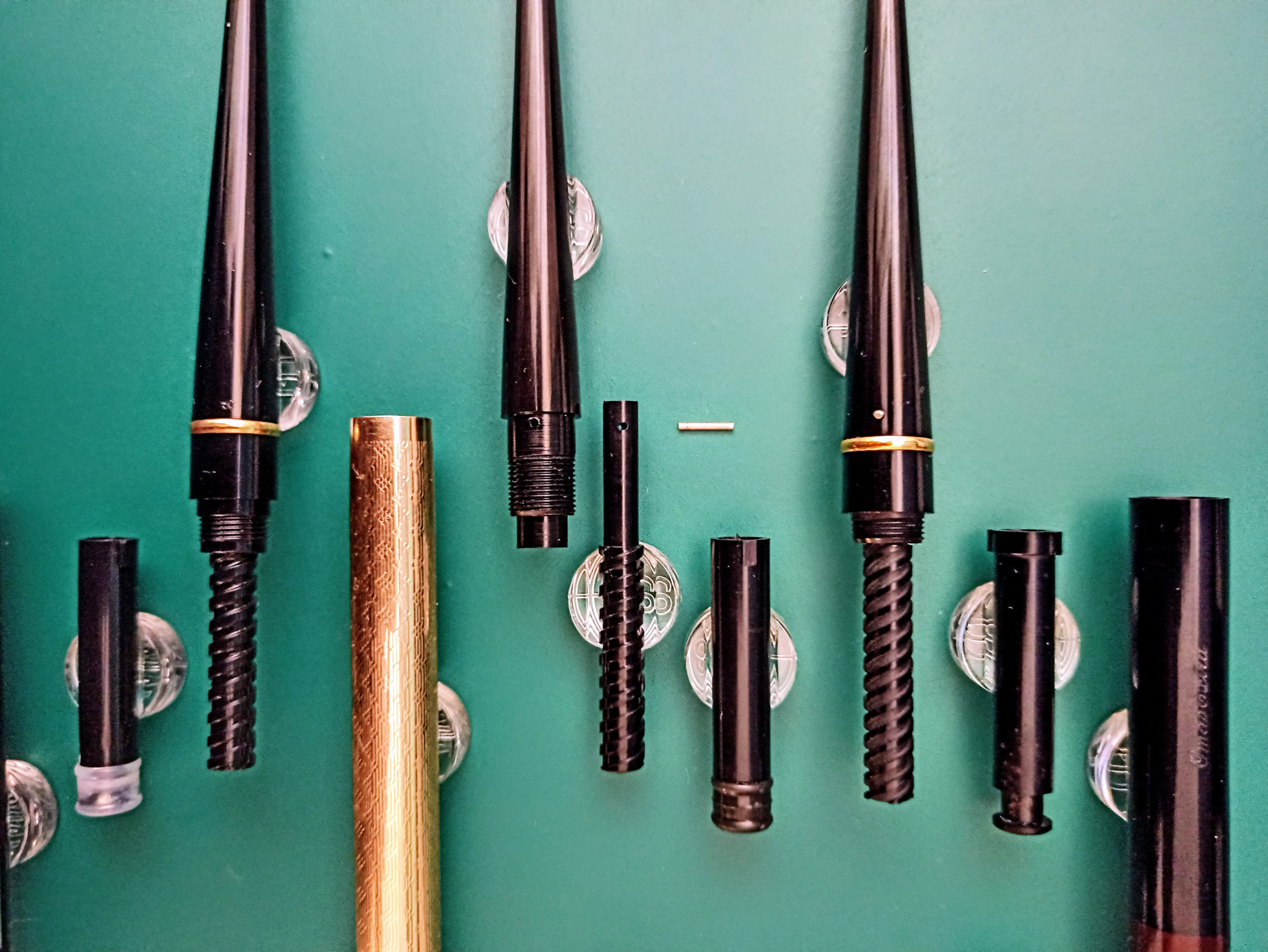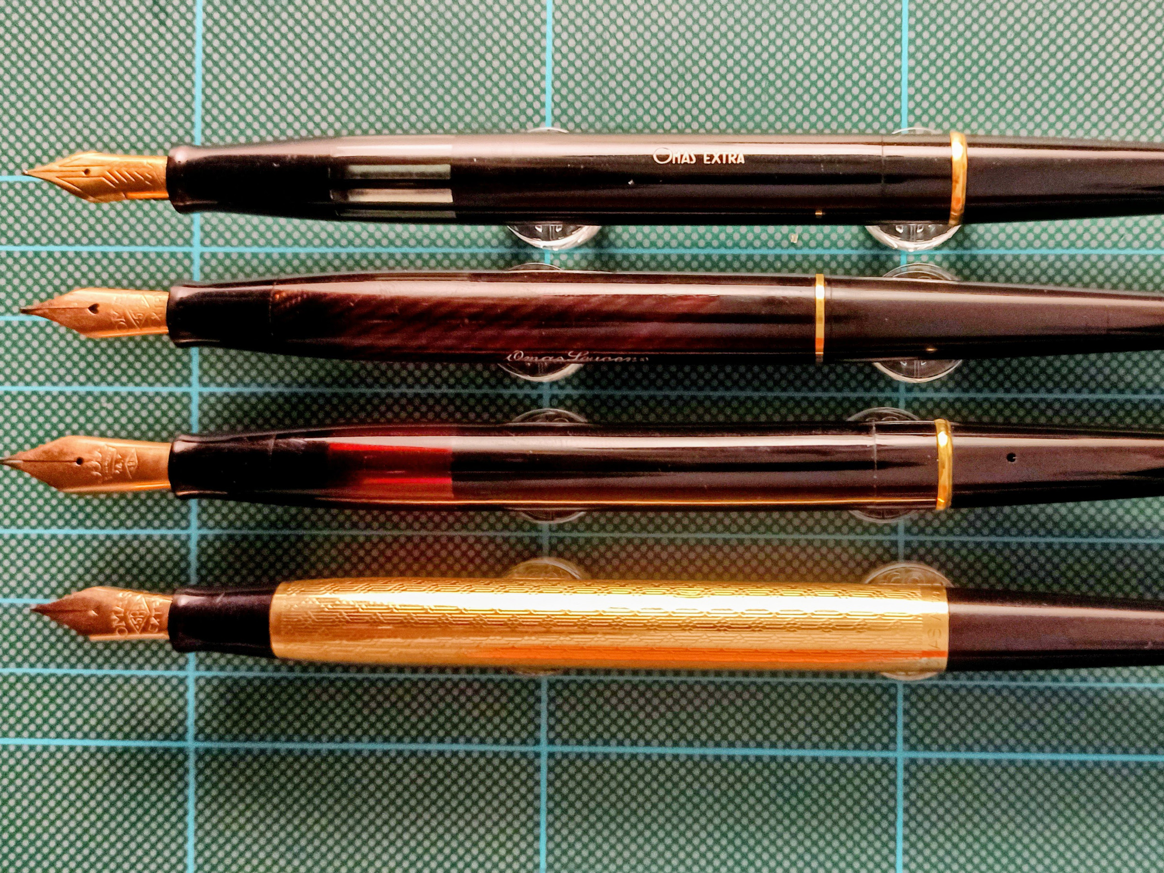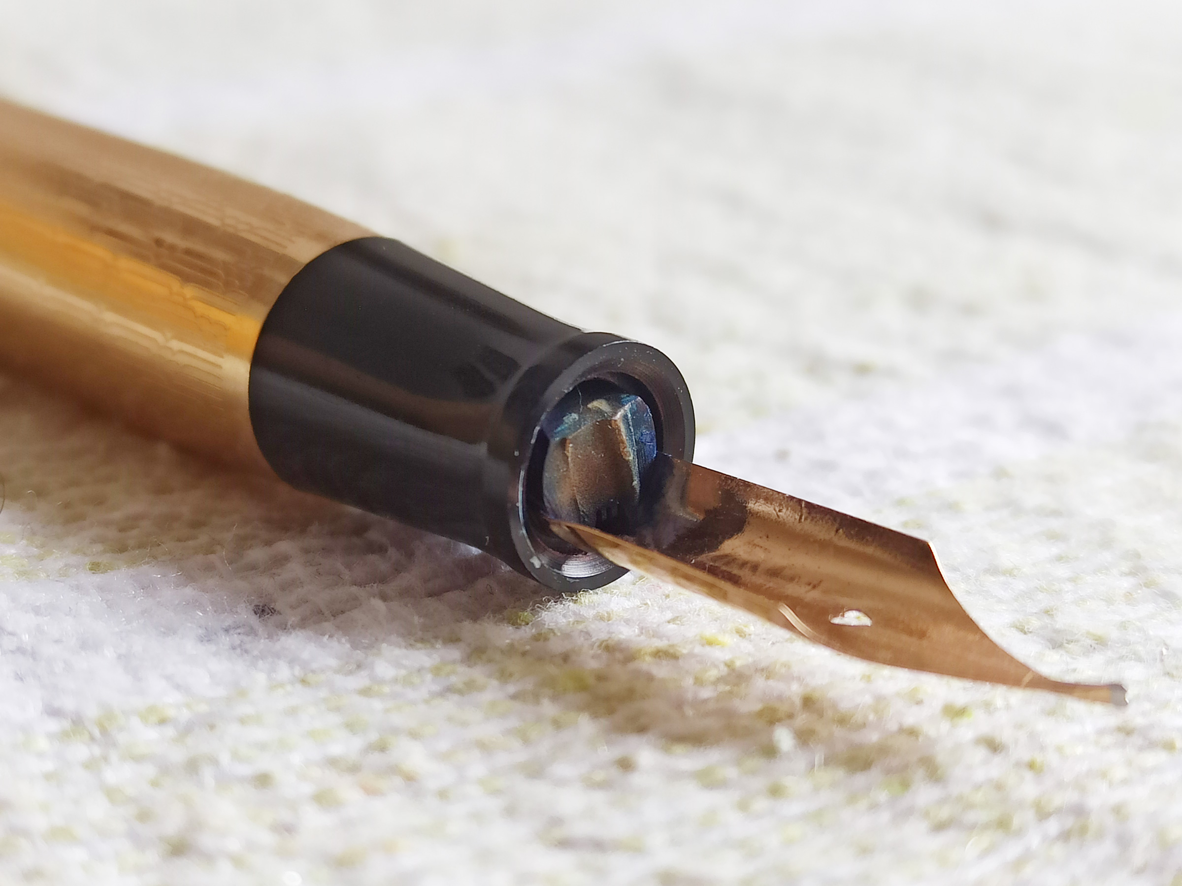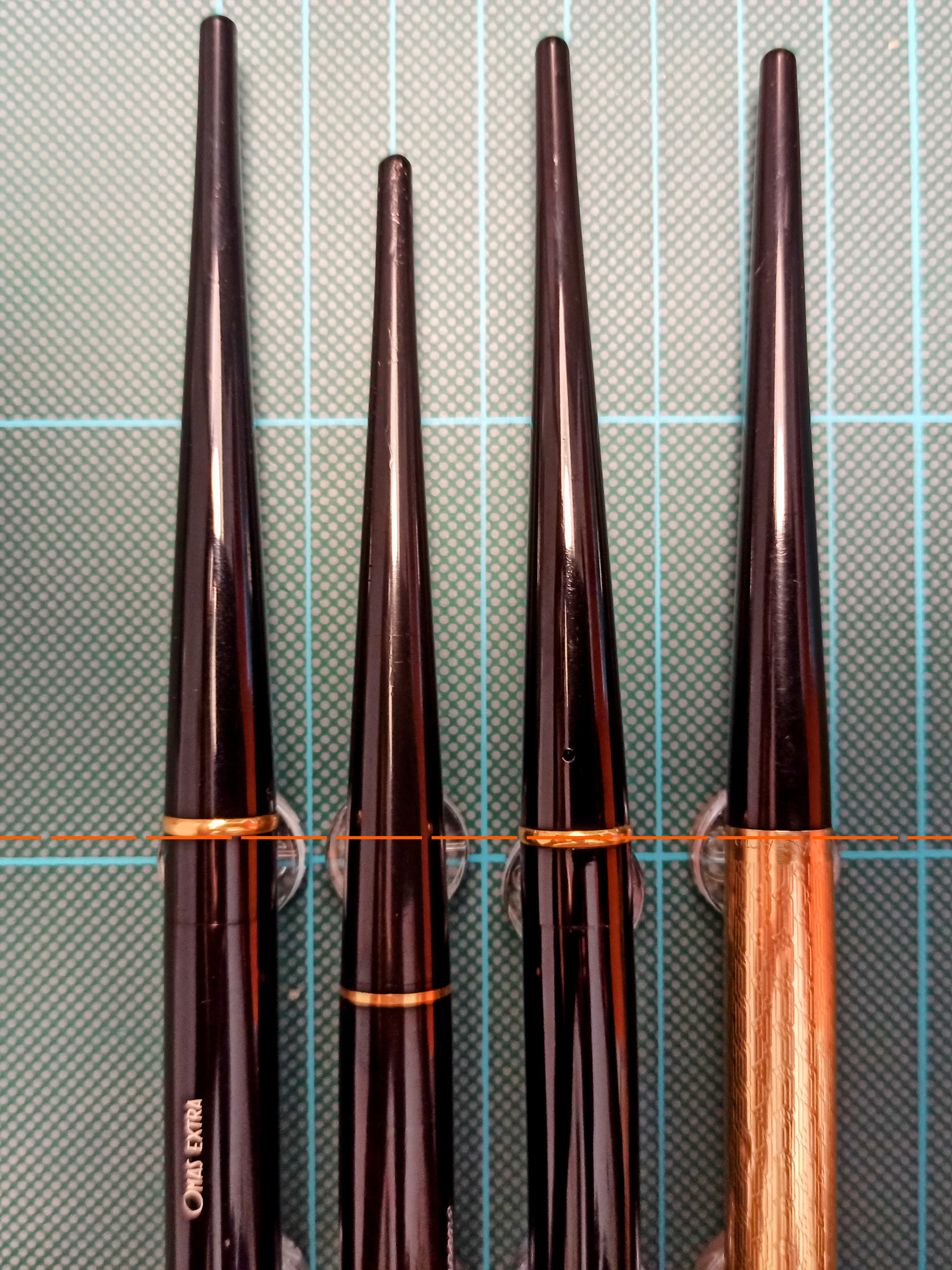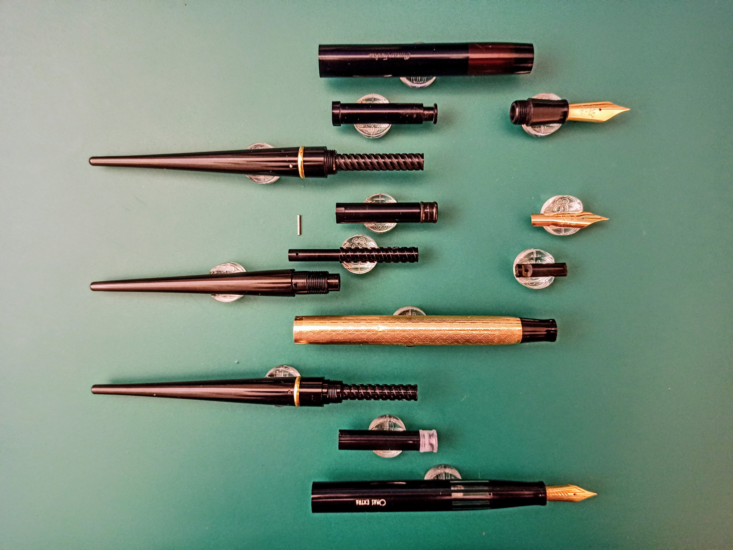 In primo luogo non sono certo della presenza di una sezione svitabile: per quanto lo stacco tra impugnatura e laminatura renda plausibile questa ipotesi (anche per diretto confronto con gli altri modelli), la stessa laminatura mi impedisce di accertarmene. Per giunta in alcuni modelli la sezione e il serbatoio sono costituiti da un pezzo unico (come nell'esemplare di Omas Extra in basso) La lunghezza di questa stilografica, misurata dalla sezione all'inizio della coda è perfettamente compatibile con quella delle altre due Omas Extra a stantuffo, ma queste due si distinguono per la possibilità di rimuovere facilmente l'intero gruppo di caricamento. Nonostante anche questa Omas Arte equipaggi un meccanismo a stantuffo come le altre due Extra, alcuni particolari tecnici sono differenti: ad esempio la spina è nascosta all'interno: sono riuscito a rimuoverla, ma la coda è rimasta solidale al meccanismo.