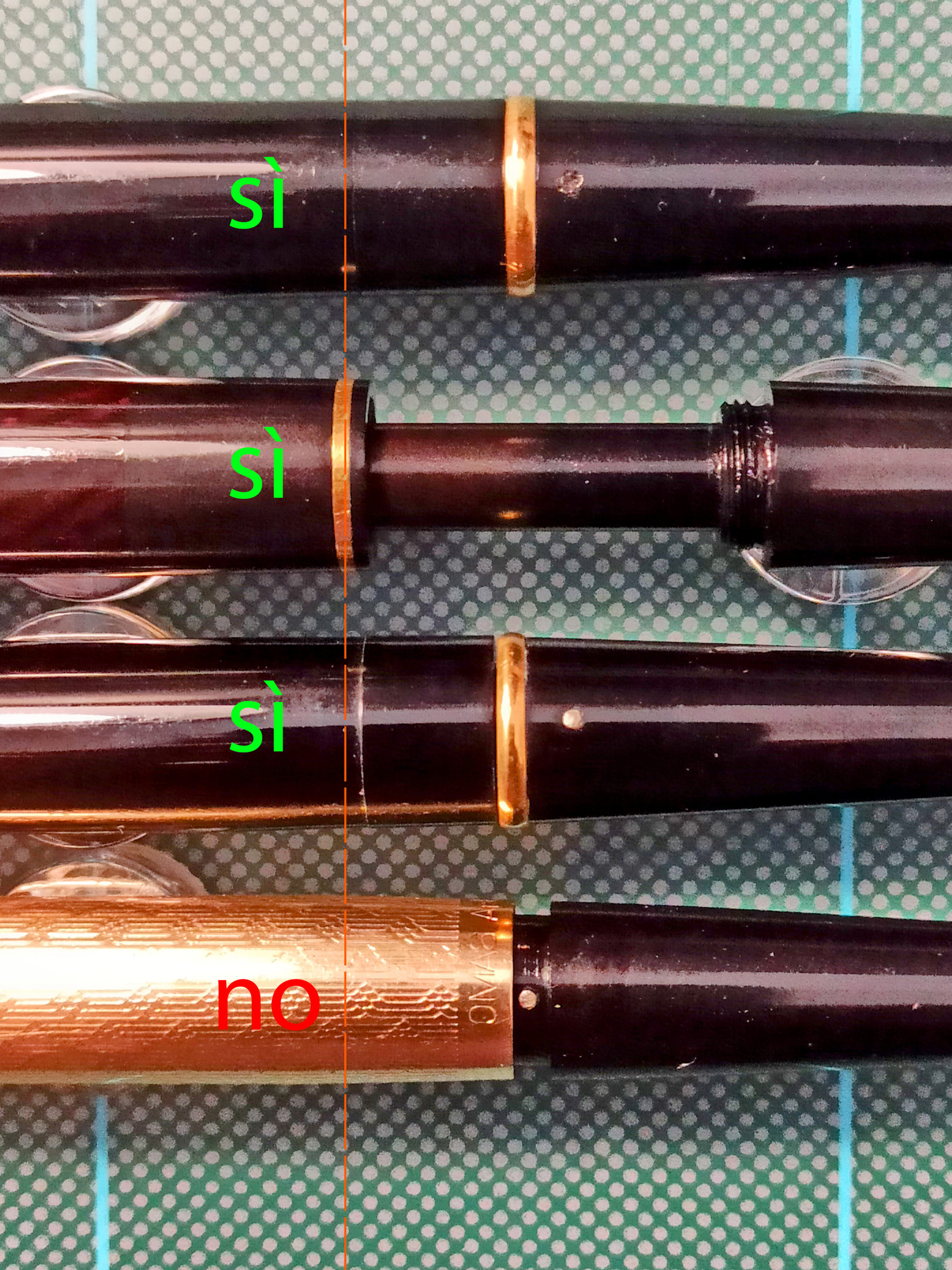 In primo luogo non sono certo della presenza di una sezione svitabile: per quanto lo stacco tra impugnatura e laminatura renda plausibile questa ipotesi (anche per diretto confronto con gli altri modelli), la stessa laminatura mi impedisce di accertarmene. Per giunta in alcuni modelli la sezione e il serbatoio sono costituiti da un pezzo unico (come nell'esemplare di Omas Extra in basso) La lunghezza di questa stilografica, misurata dalla sezione all'inizio della coda è perfettamente compatibile con quella delle altre due Omas Extra a stantuffo, ma queste due si distinguono per la possibilità di rimuovere facilmente l'intero gruppo di caricamento. Nonostante anche questa Omas Arte equipaggi un meccanismo a stantuffo come le altre due Extra, alcuni particolari tecnici sono differenti: ad esempio la spina è nascosta all'interno: sono riuscito a rimuoverla, ma la coda è rimasta solidale al meccanismo.