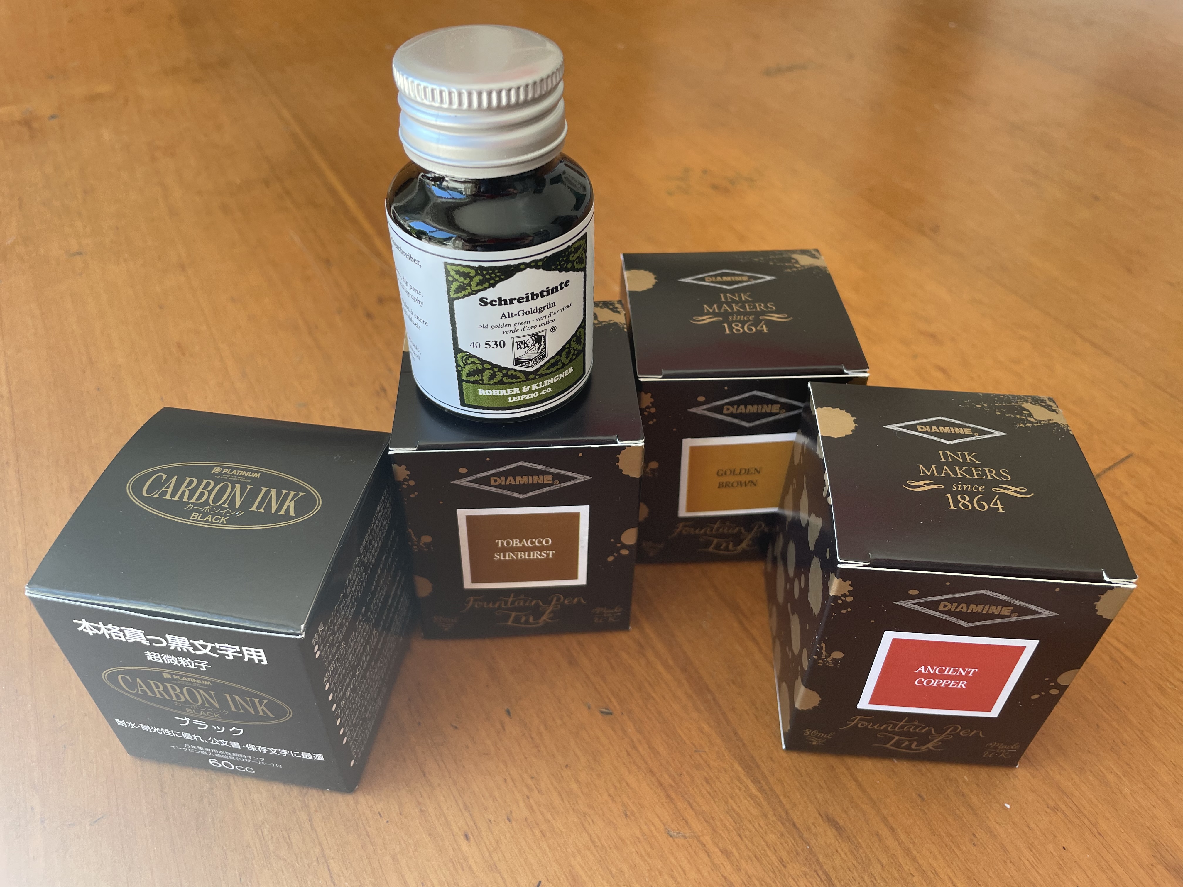 A parte il Golden Brown, che sostituisce una boccetta quasi esaurita, gli altri sono per me tutti nuovi. Ho grandi aspettative per il Platinum Carbon, che dovrebbe affiancare il nero permanente di Montblanc.