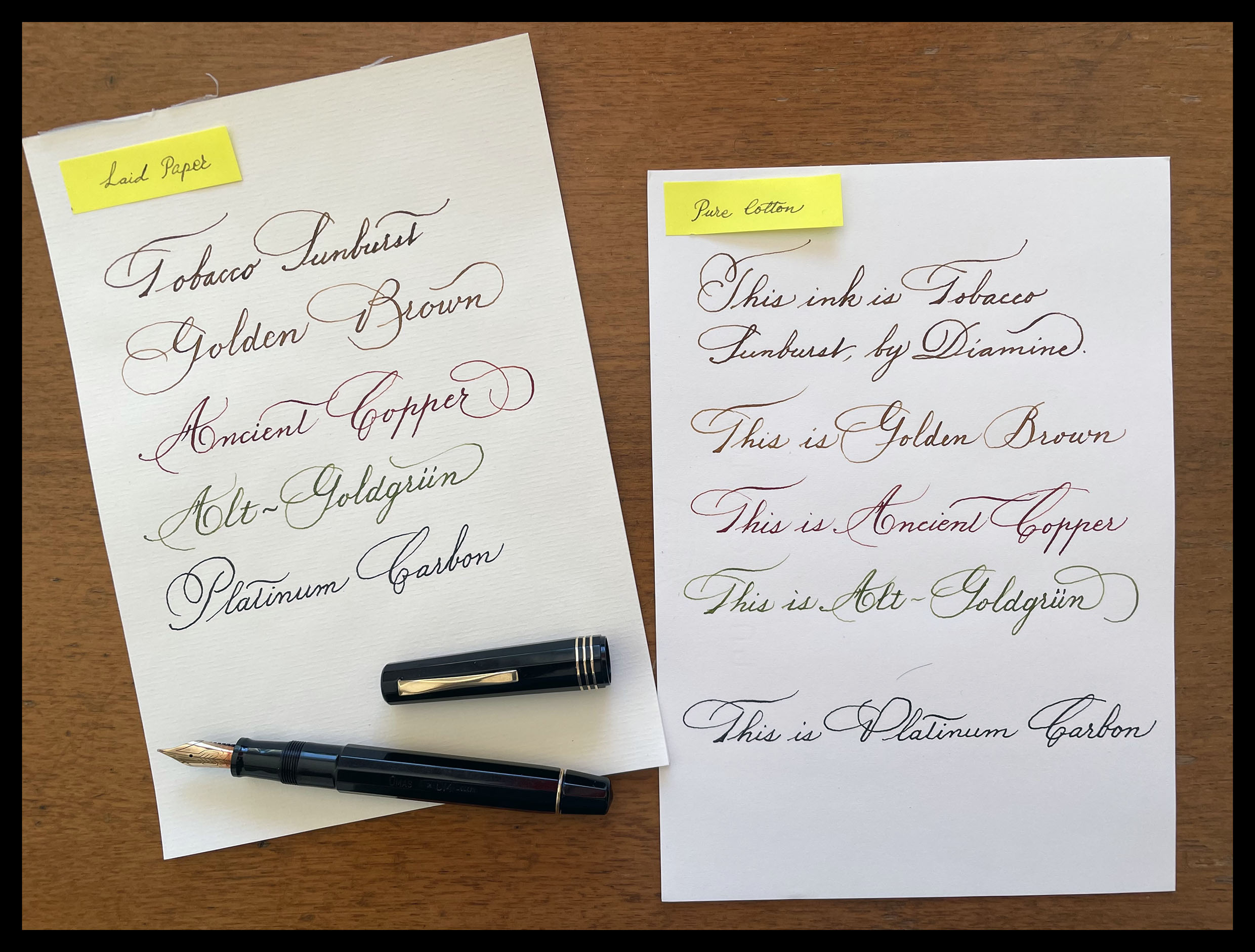 Per vedere i colori ho utilizzato della carta che non avevo mai provato prima, prodotta dalla cartiera Crown Mill. Un "amico di penna" me na ha gentilissimamente inviati alcuni fogli di dimensione A5, nei tipi "Laid Paper" (vergata) e "Pure Cotton", che ho provato qui, più un tipo "vellum" che non ho ho ancora testato. La vergata é un poco più ruvida di quelle che uso normalmente, ma tiene l'inchiostro benissimo, così come quella in puro cotone, che é molto più liscia.