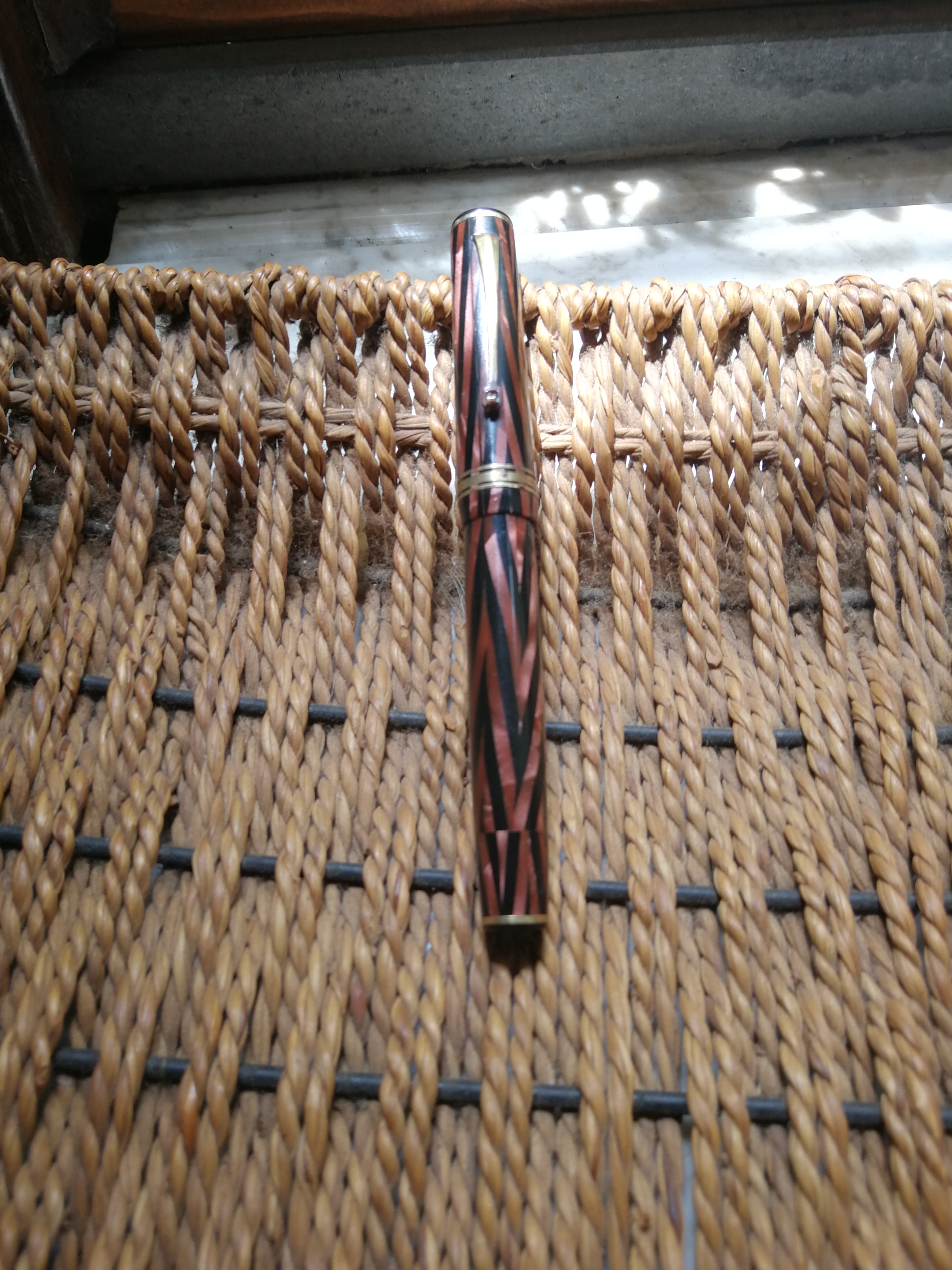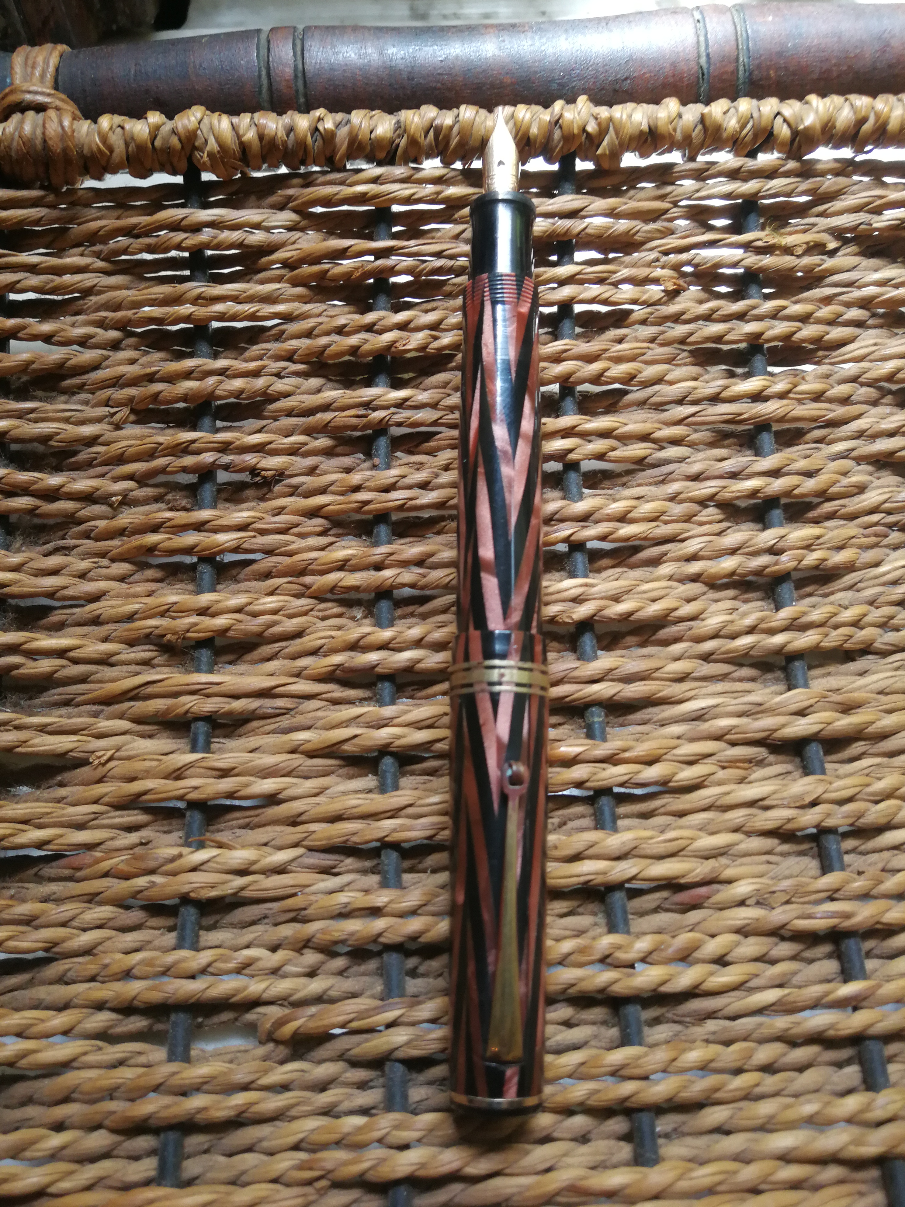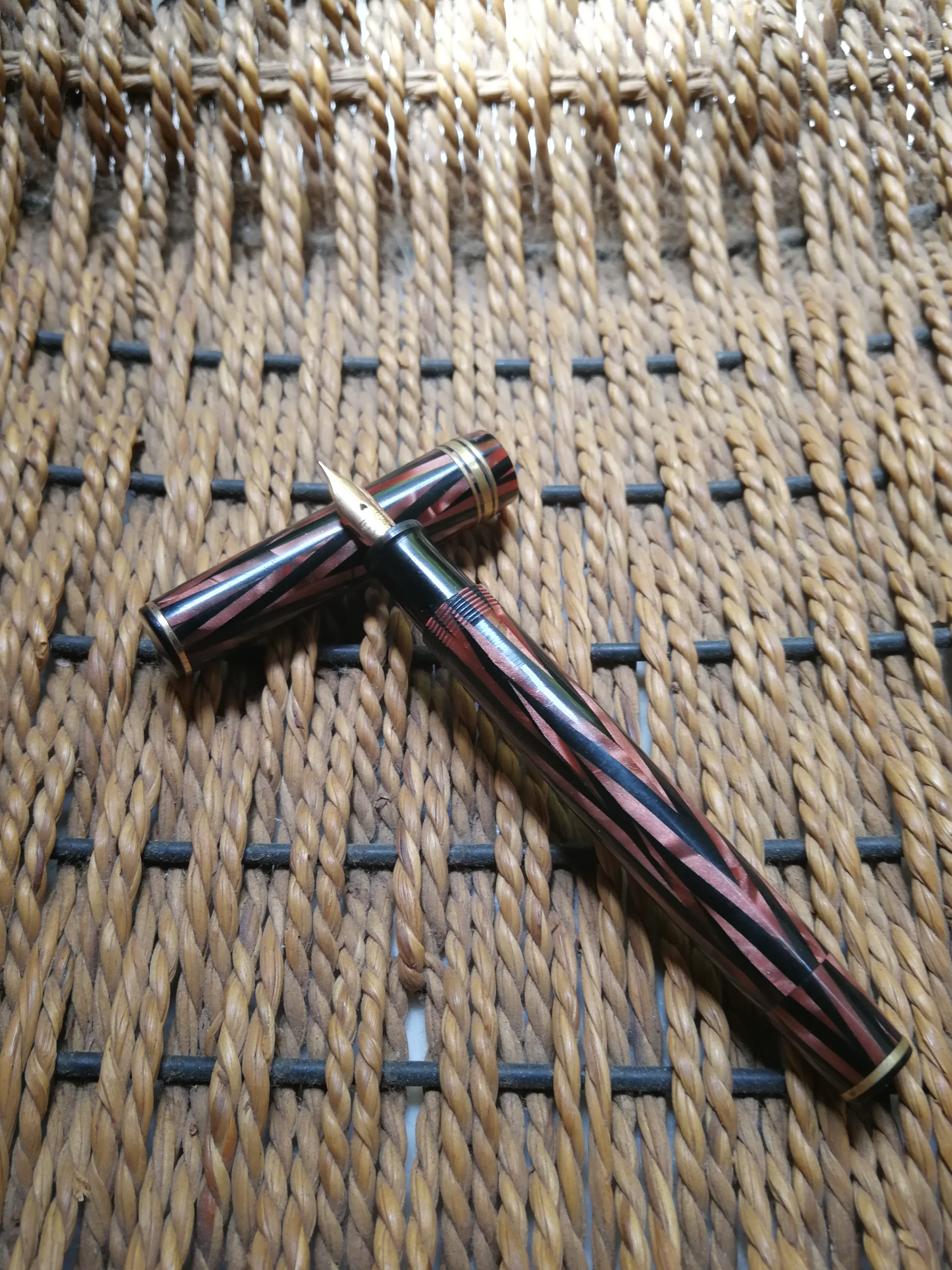 La celluloide è nello stile introdotto dalla Waterman con la Ink-Vue, del 1935, e quindi, data la tendenza dell'epoca a copiare spudoratamente le penne dei grandi produttori americani, tenderei a datarla posteriormente a detta data.