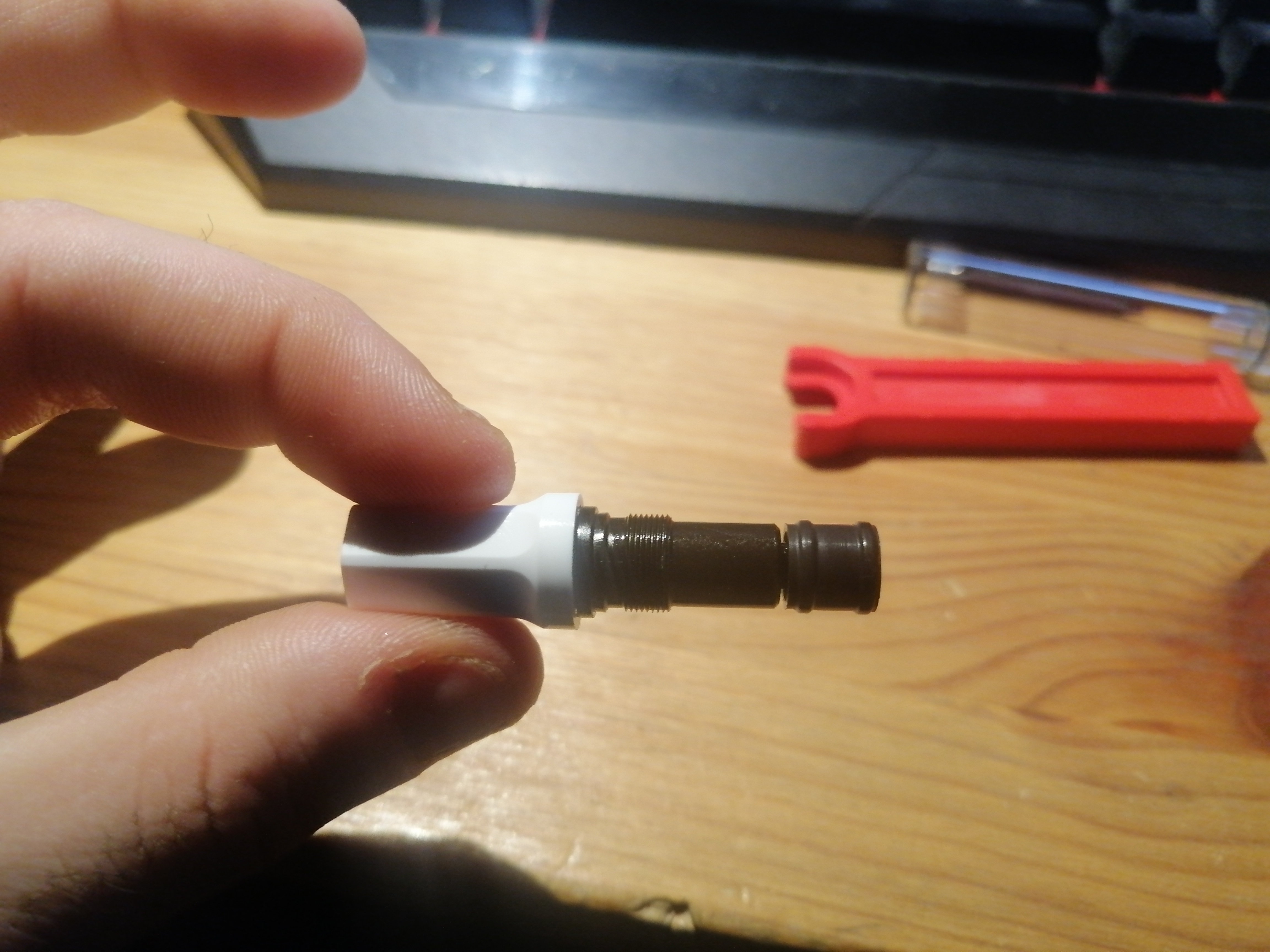 estratto il fondello con il meccanismo lo porti a fine corsa come se volessi abbassare il pistone, lo reinserisci nel fusto e cerchi di avvitare la vite nera; fatto questo estrai tutto, rimetti l'asse nel meccansimo e reinserisci.
