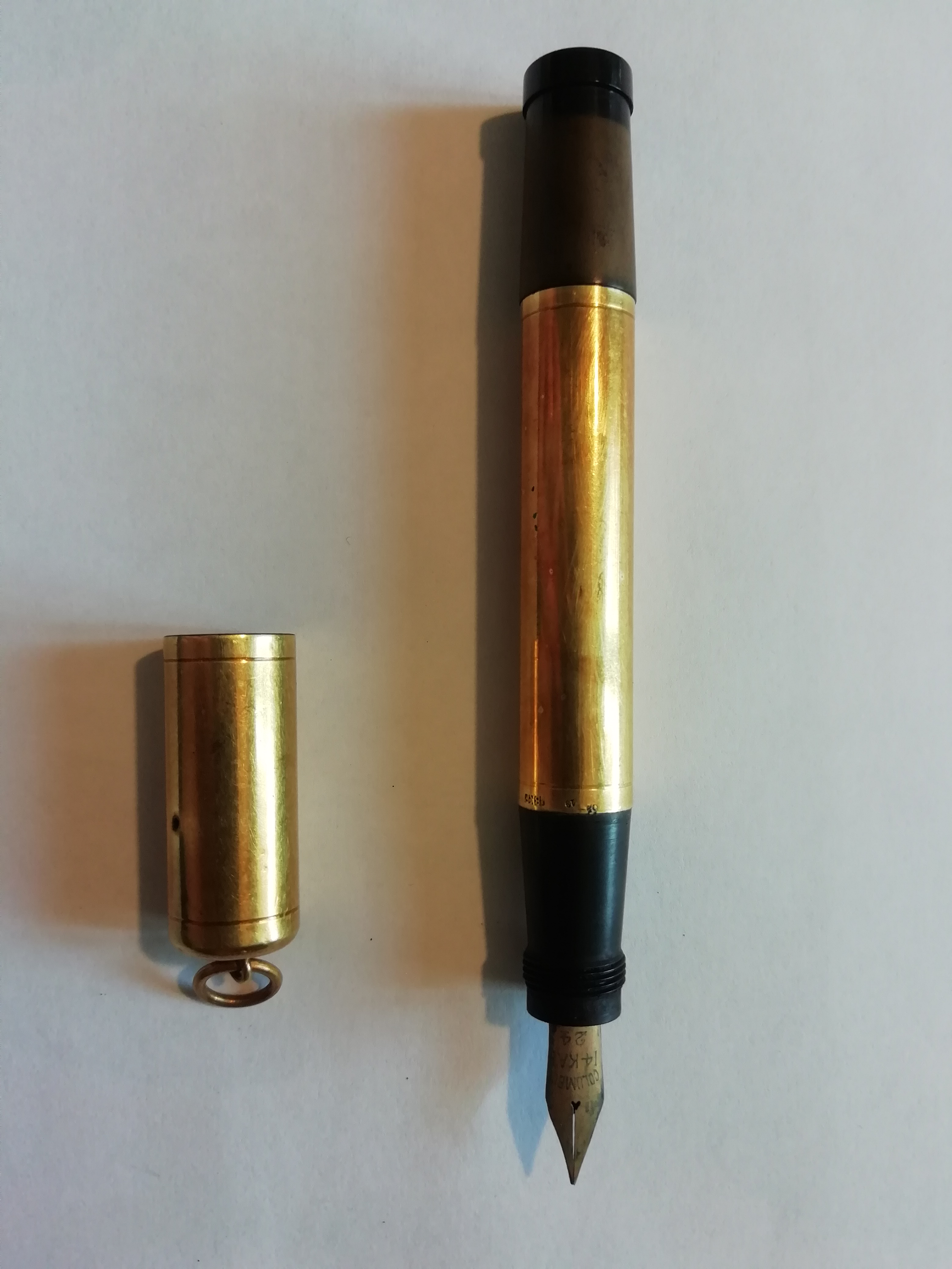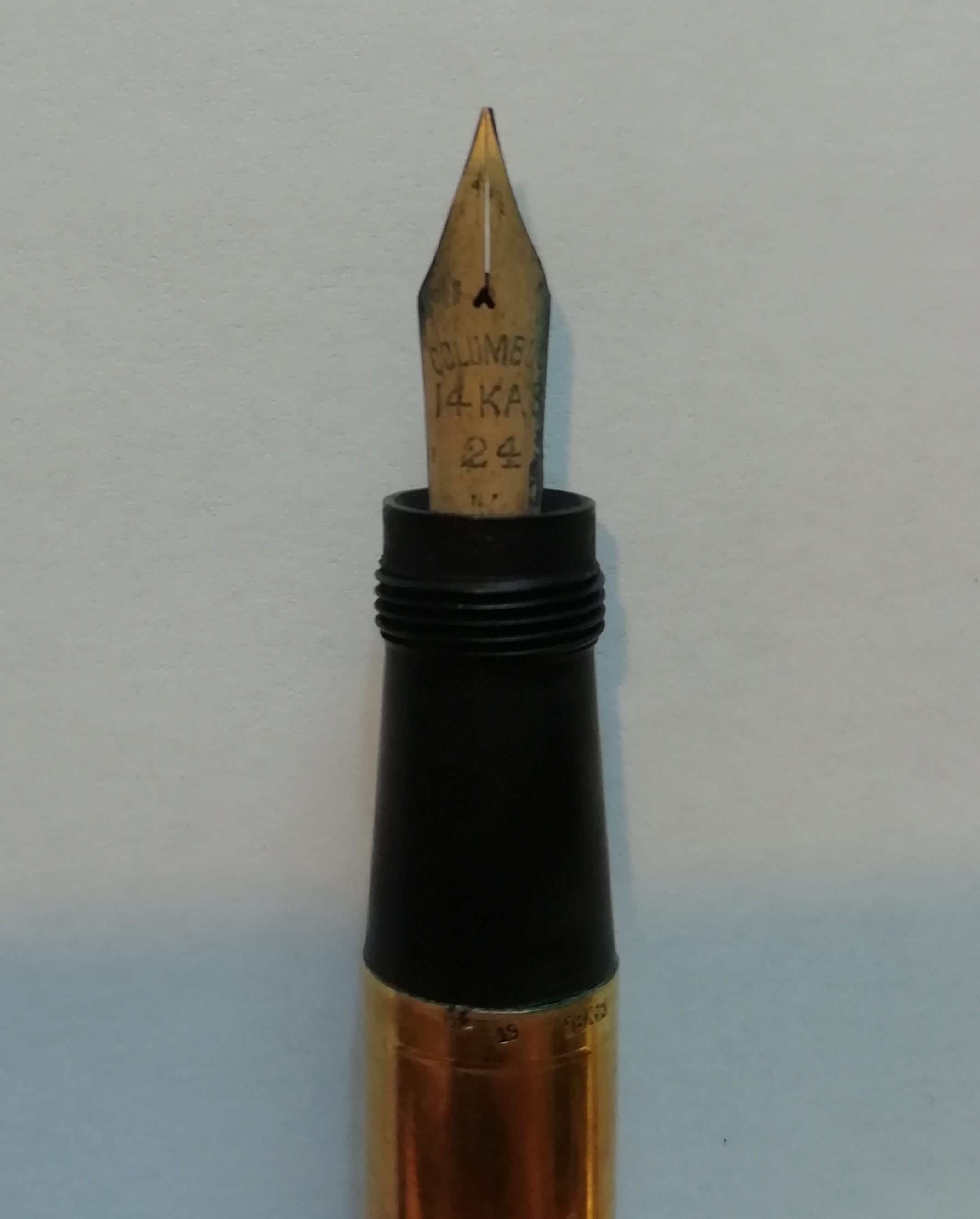 La penna in questione, dalle ricerche che ho fatto, dovrebbe essere una rientrante della Columbus degli anni '20, in ebanite rivestita con una lamina d'oro a 18kr (come inciso sia sul fusto che sul cappuccio). Sul pennino è semplicemente scritto "COLUMBUS 14KAR 24" (quest'ultimo numero a quel che capisco si riferisce alla misura del pennino).