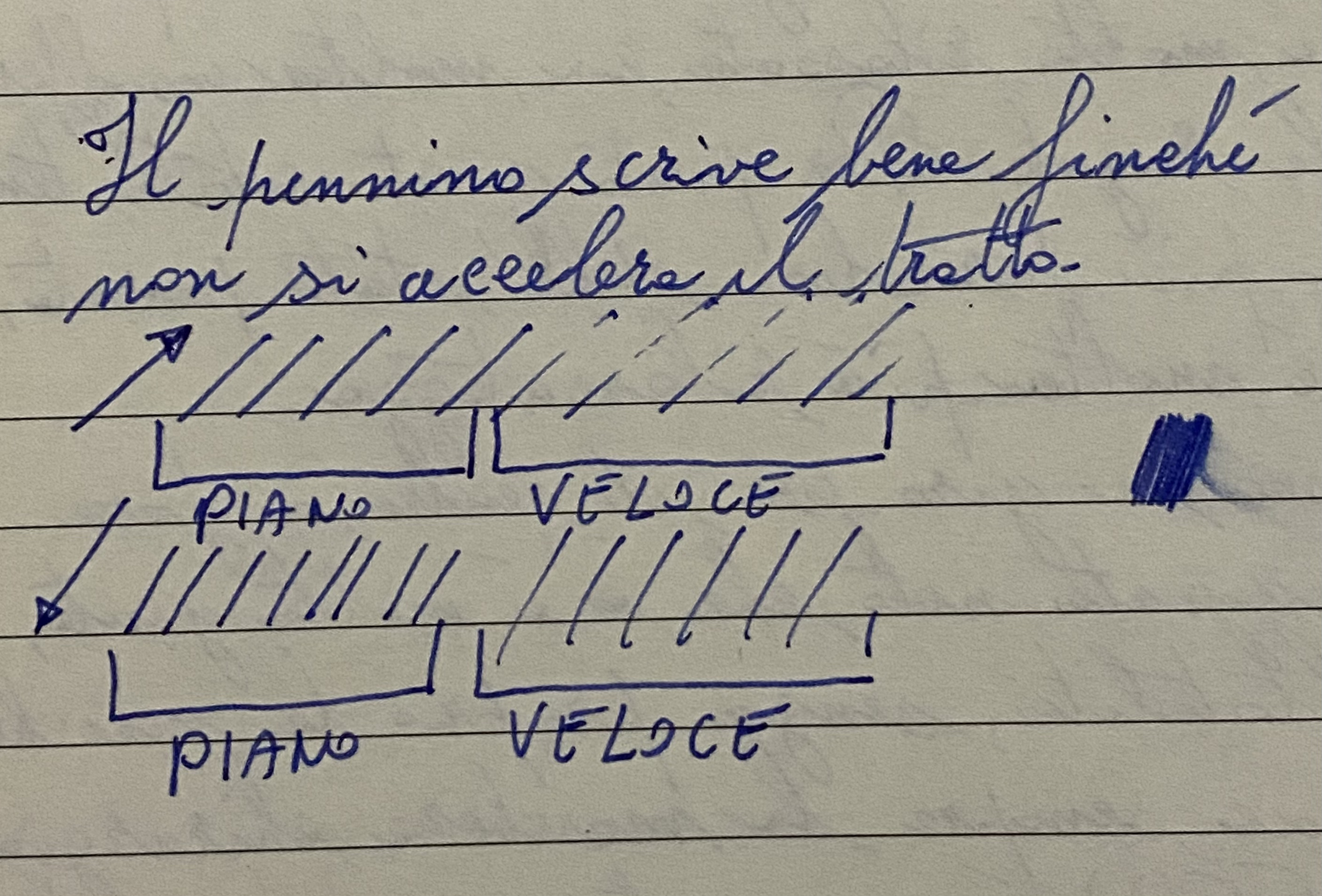 Un amico del forum, a cui ho modificato un pennino in stub, tempo fa si lamentava che ogni tanto andava in fame di inchiostro quando la testava, ma non quando scriveva normale.