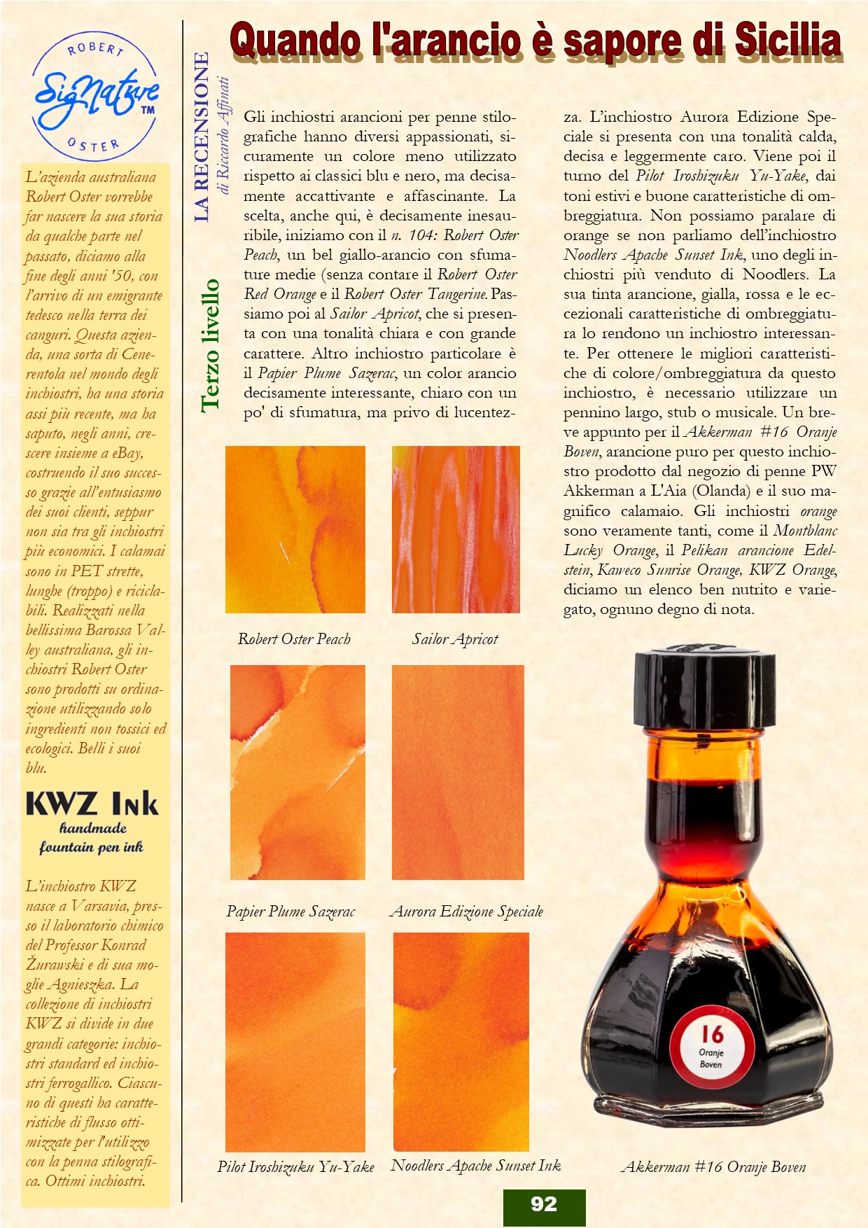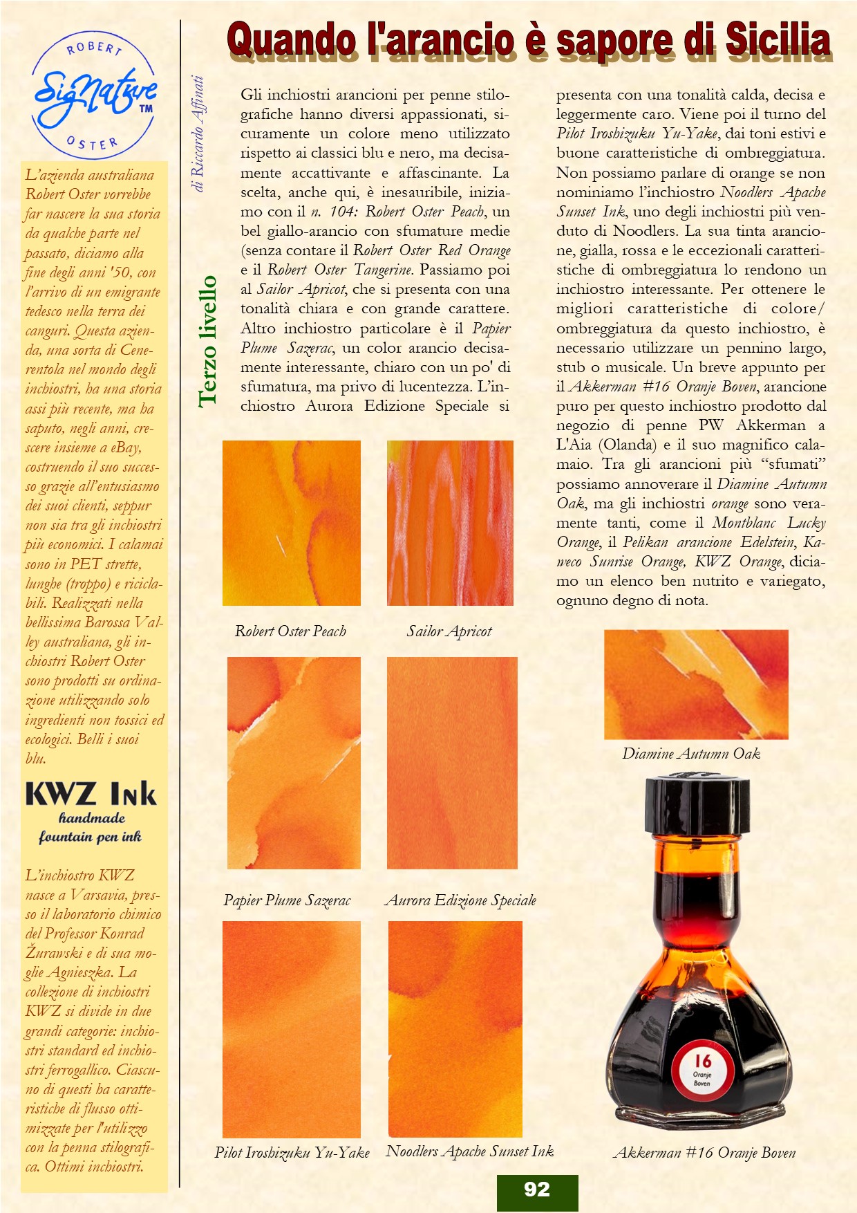Gli inchiostri arancioni per penne stilografiche hanno diversi appassionati, sicuramente un colore meno utilizzato rispetto ai classici blu e nero, ma decisamente accattivante e affascinante. La scelta, anche qui, è decisamente inesauribile, iniziamo con il n. 104: Robert Oster Peach, un bel giallo-arancio con sfumature medie (senza contare il Robert Oster Red Orange e il Robert Oster Tangerine. Passiamo poi al Sailor Apricot, che si presenta con una tonalità chiara e con grande carattere. Altro inchiostro particolare è il Papier Plume Sazerac, un color arancio decisamente interessante, chiaro con un po' di sfumatura, ma privo di lucentezza. L’inchiostro Aurora Edizione Speciale si presenta con una tonalità calda, decisa e leggermente caro. Viene poi il turno del Pilot Iroshizuku Yu-Yake, dai toni estivi e buone caratteristiche di ombreggiatura. Non possiamo paralare di orange se non parliamo dell’inchiostro Noodlers Apache Sunset Ink, uno degli inchiostri più venduto di Noodlers. La sua tinta arancione, gialla, rossa e le eccezionali caratteristiche di ombreggiatura lo rendono un inchiostro interessante. Per ottenere le migliori caratteristiche di colore/ombreggiatura da questo inchiostro, è necessario utilizzare un pennino largo, stub o musicale. Un breve appunto per il Akkerman #16 Oranje Boven, arancione puro per questo inchiostro prodotto dal negozio di penne PW Akkerman a L'Aia (Olanda) e il suo magnifico calamaio. Gli inchiostri orange sono veramente tanti, come il Montblanc Lucky Orange, il Pelikan arancione Edelstein, Kaweco Sunrise Orange, KWZ Orange, diciamo un elenco ben nutrito e variegato, ognuno degno di nota.