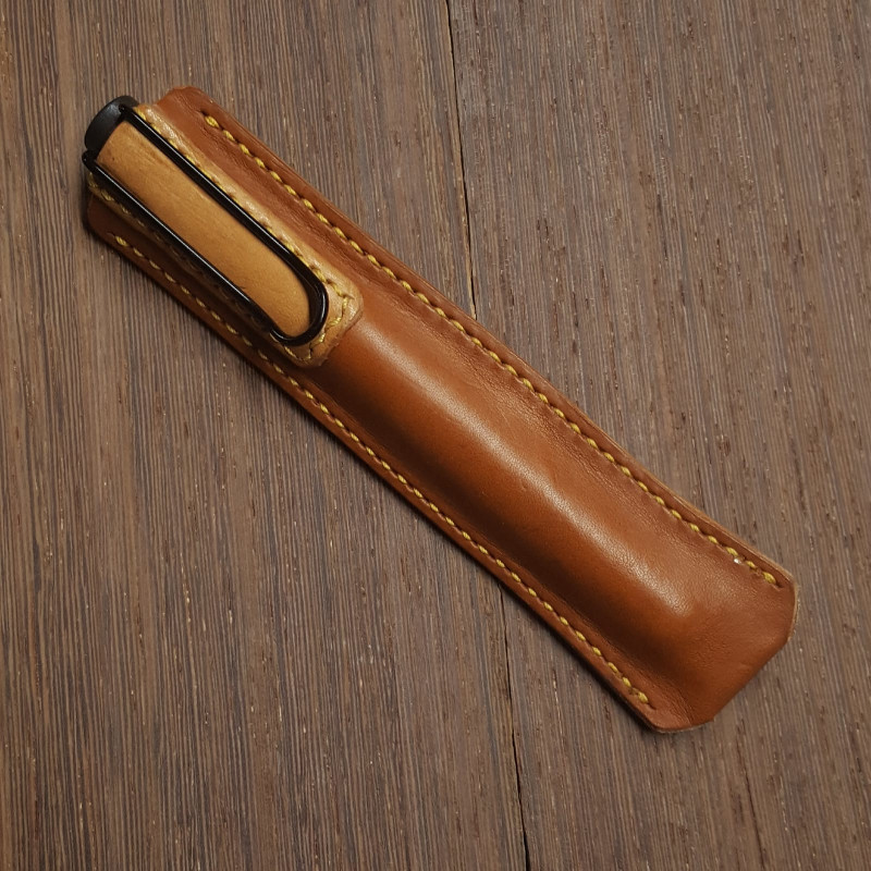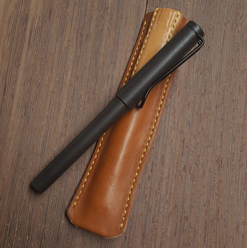 Sono soddisfatto? Non molto. I requisiti sono rispettati, la penna non si muove dalla custodia e se la si vuole estrarre ci vuole un secondo, è resistente all’usura? Direi di sì, con il cuoio ci si costruiscono le selle, i finimenti, ecc. da tempo immemorabile, il materiale è buono? Decisamente, cuoio concia vegetale da concerie toscane, filo giapponese ultra resistente.