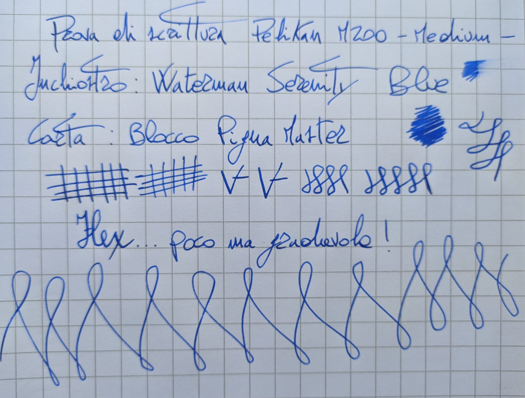 Passando al flusso, quello della M200 è generoso per antonomasia e funge da vero e proprio termine di paragone quando si sia in presenza di una stilografica dal flusso scarso.