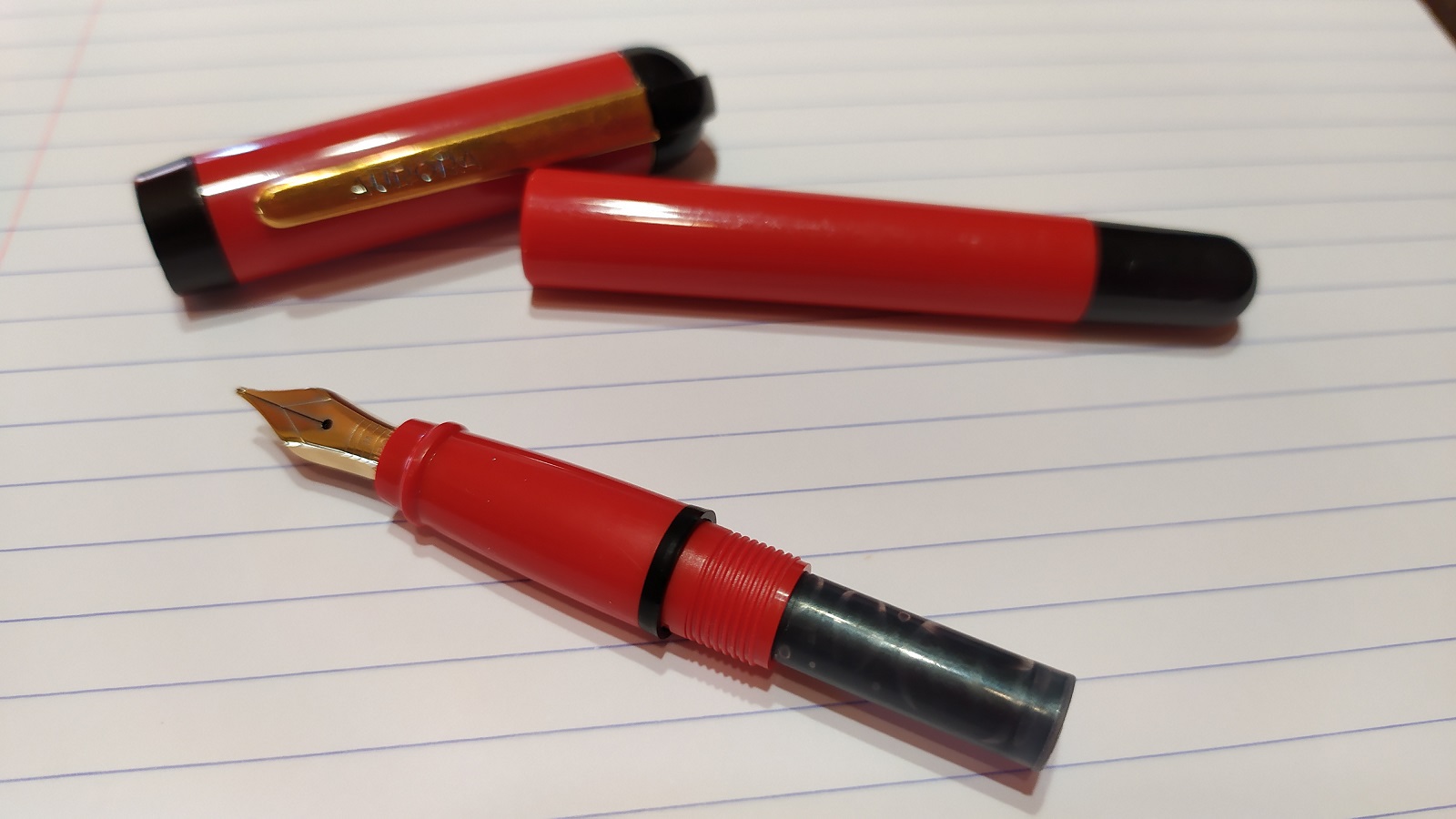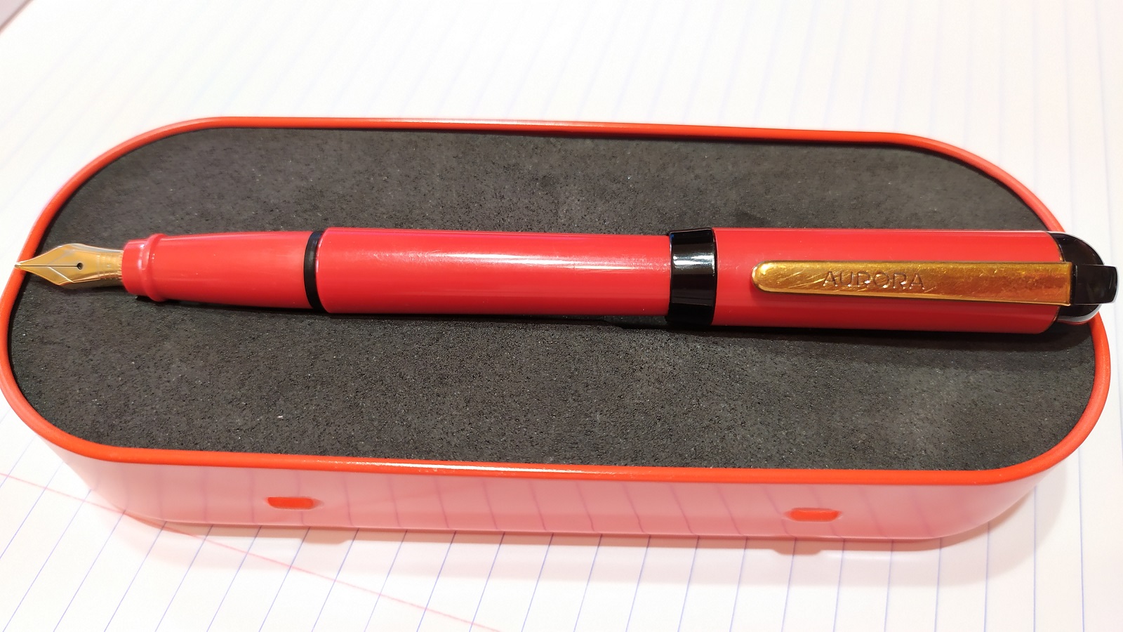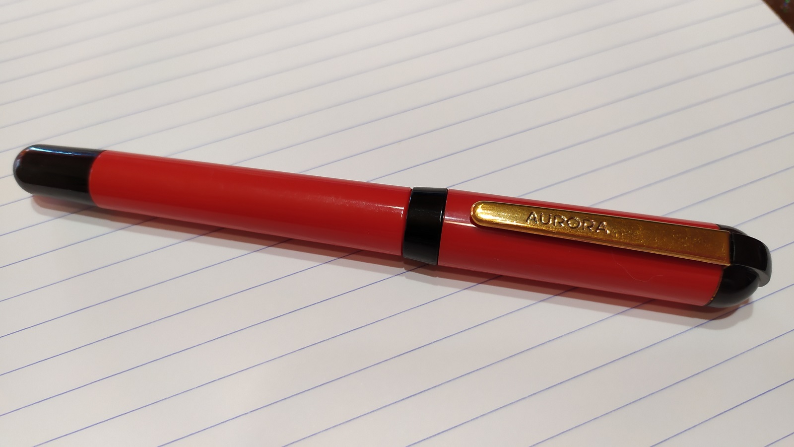 Completamente in plastica (resina ?), clip in metallo e pennino M, ora carica con cartuccia Aurora black.