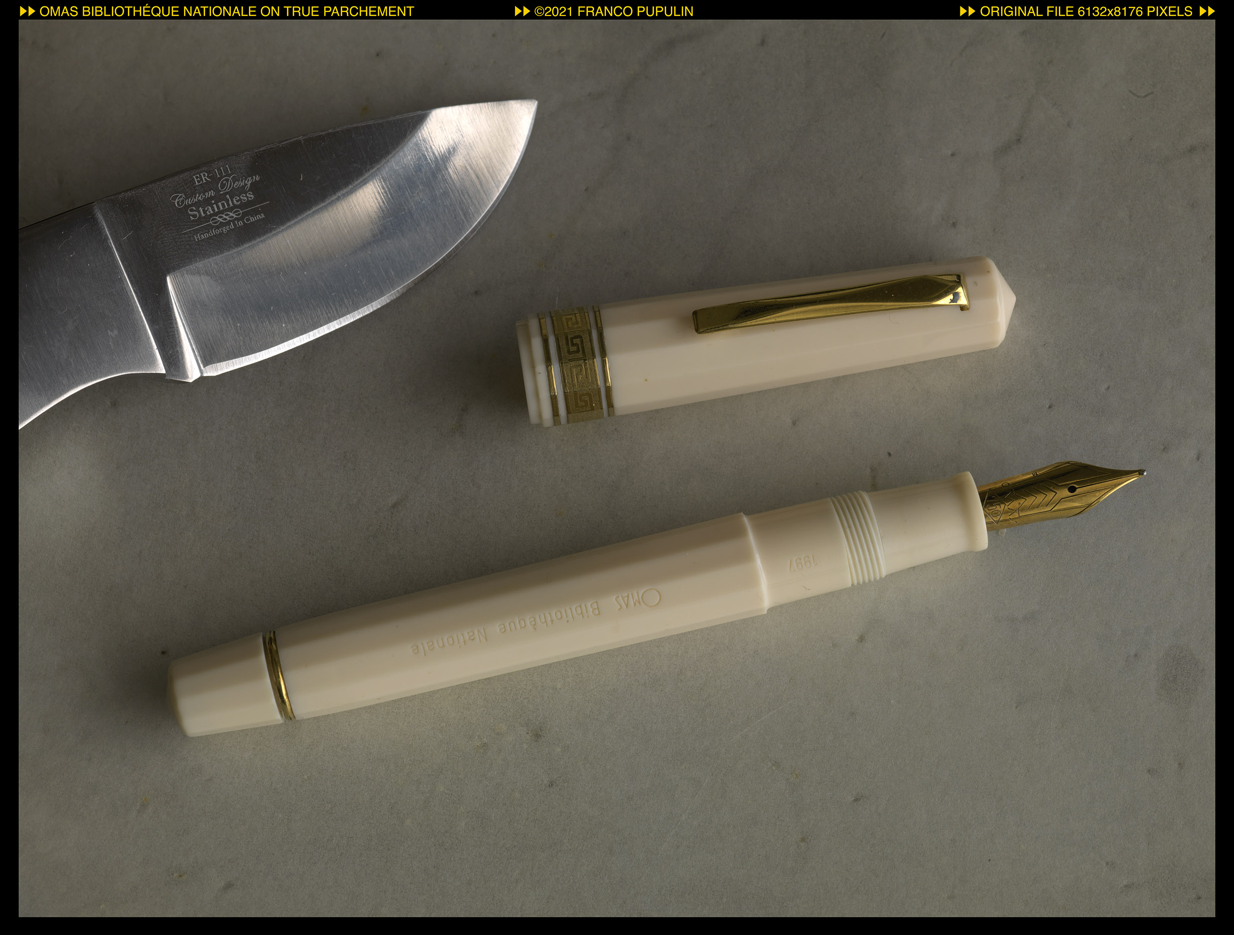 Nella fotografia che segue vi presento la Omas "Bibliothèque Nationale" appoggiata su un foglio di vera pergamena, un regalo di un'amica pittrice botanica che non ho mai osato inchiostrare... In alto è la lama di un piccolo coltello, simile al raschietto che faceva parte, insieme a calamus et atramentis, del semplice corredo dell'amanuense medievale. Gli errori commessi con la penna sulla pergamena non si cancellavano con la gomma, ma "raschiandoli" via con una lama affilata.