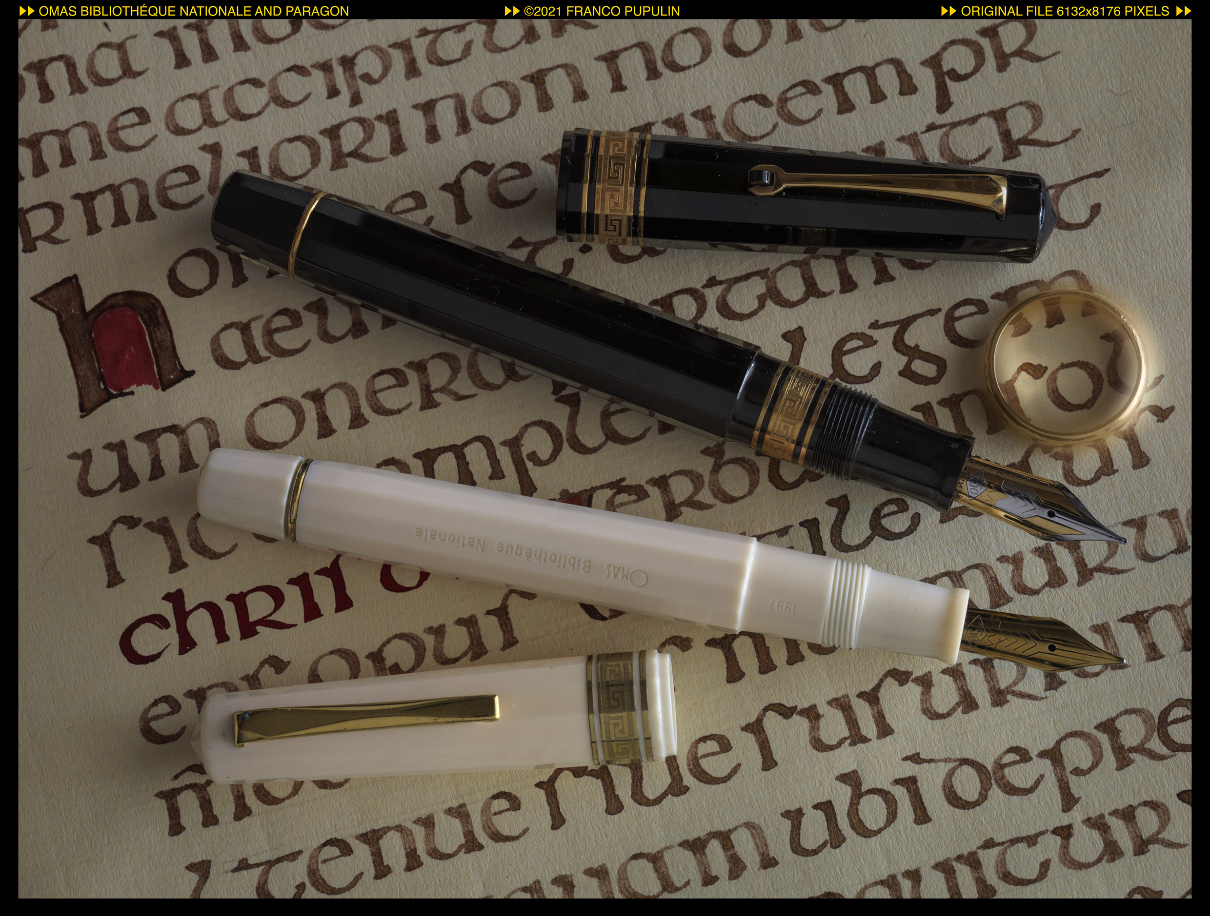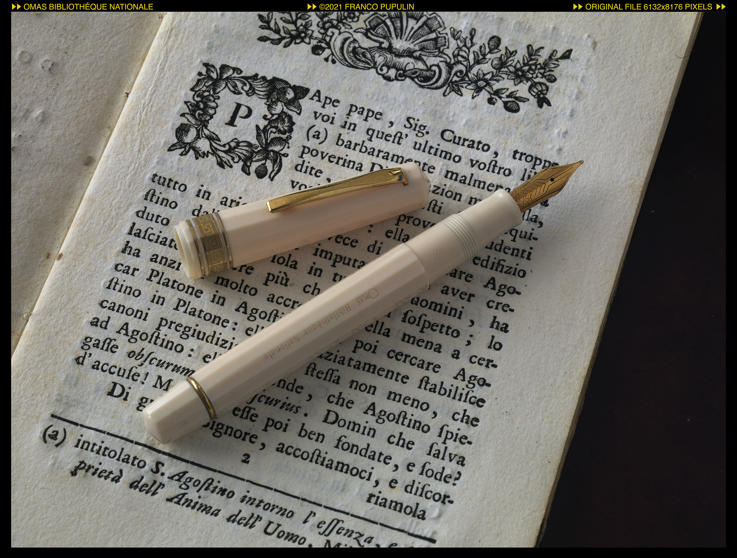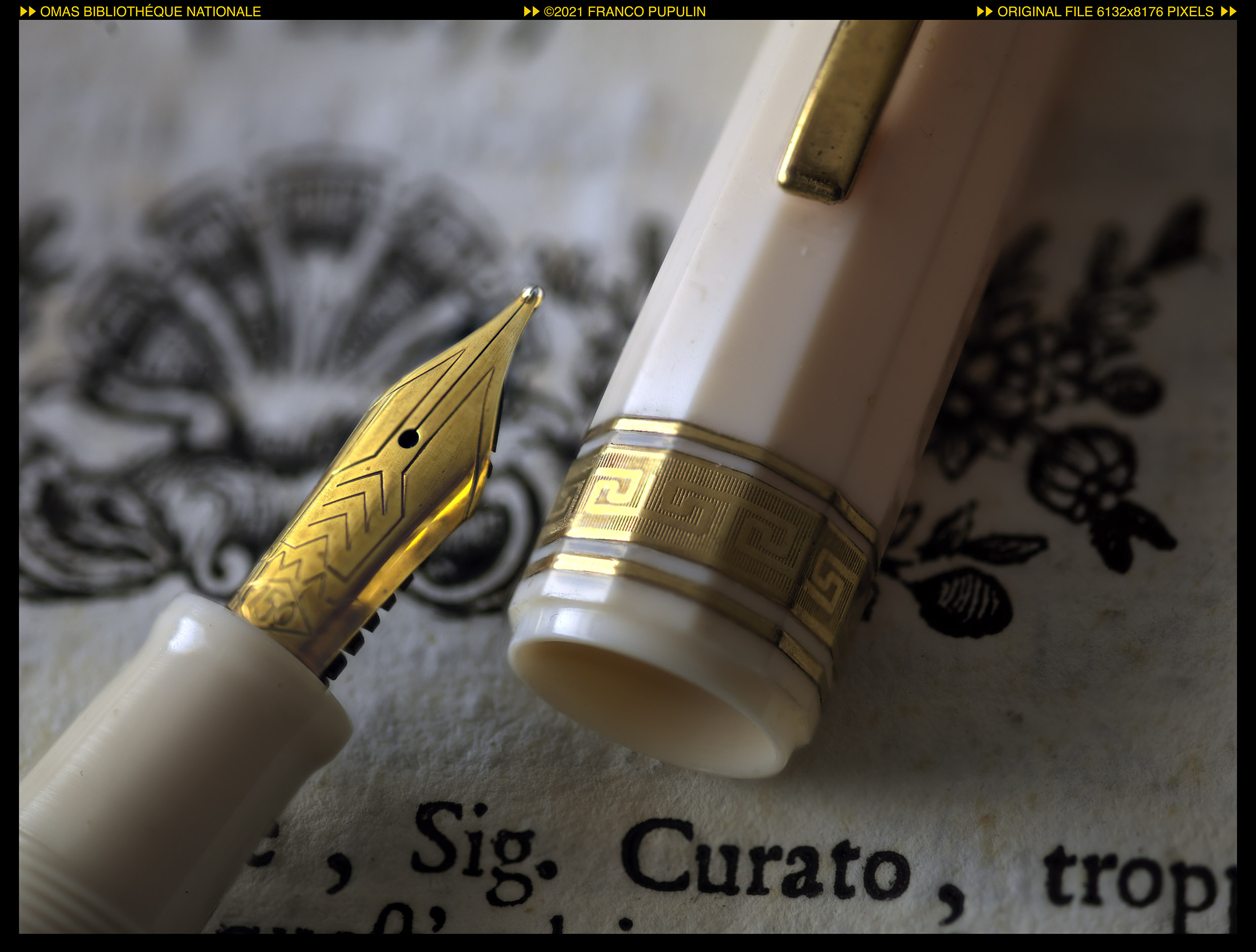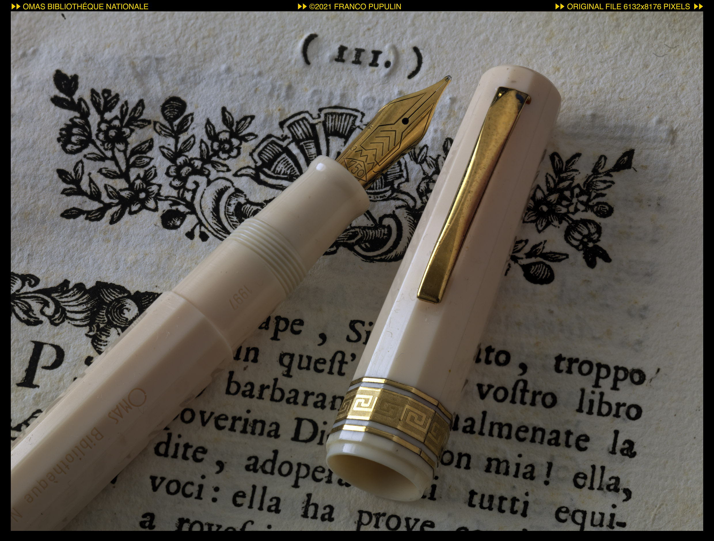 Secondo la letteratura tecnica dell’epoca, la scelta della resina vegetale color avorio con le finiture dorate rappresentava un richiamo ai manoscritti su pergamena miniati con foglia d’oro, dei quali la Biblioteca Nazionale di Francia è particolarmente ricca. Il pennino in oro 18 carati era ancora prodotto in casa dalla Omas.