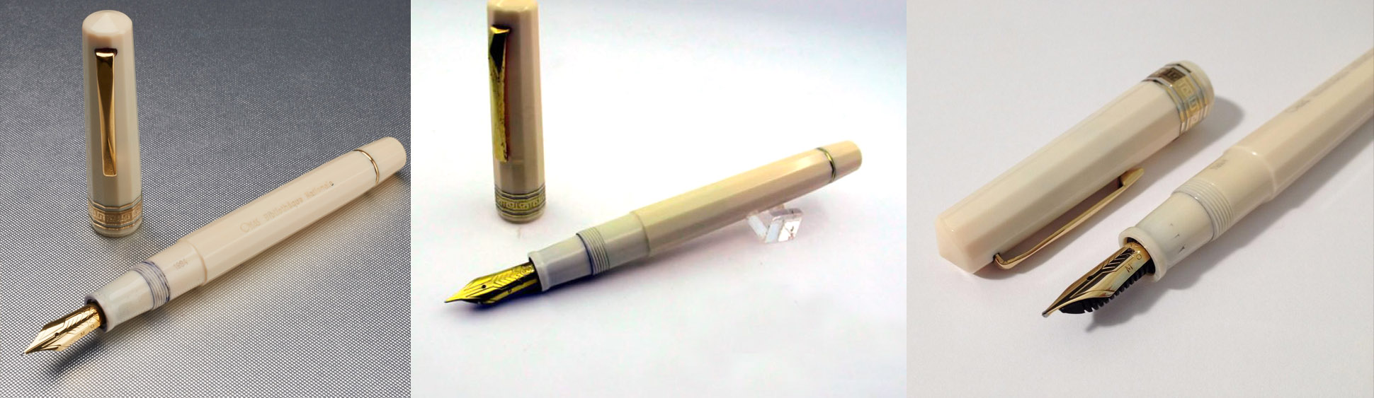 Sapendo qualcosa in più delle stilografiche, scoprii la Aurora Etiopia. Non ho nulla da dire sui simboli imperiali, che mi sono estranei, ma l’accoppiata della plastica color crema, liscia e non perlacea, con le finiture dorate mi sembrò davvero molto bella. Non è una penna che io desideri possedere, perché in generale non sono un vero appassionato di penne autenticamente vintage, che vedo piuttosto come veri oggetti da collezione che non come strumenti di uso quotidiano, così come piacciono a me. Recentemente ho potuto vedere che Aurora realizzò anche una versione di questa penna, mi pare su commissione, negli stessi colori “coloniali” ma senza allusioni imperiali. Davvero una bella penna, nei colori della comunione, ma più elegante e utilizzabile.