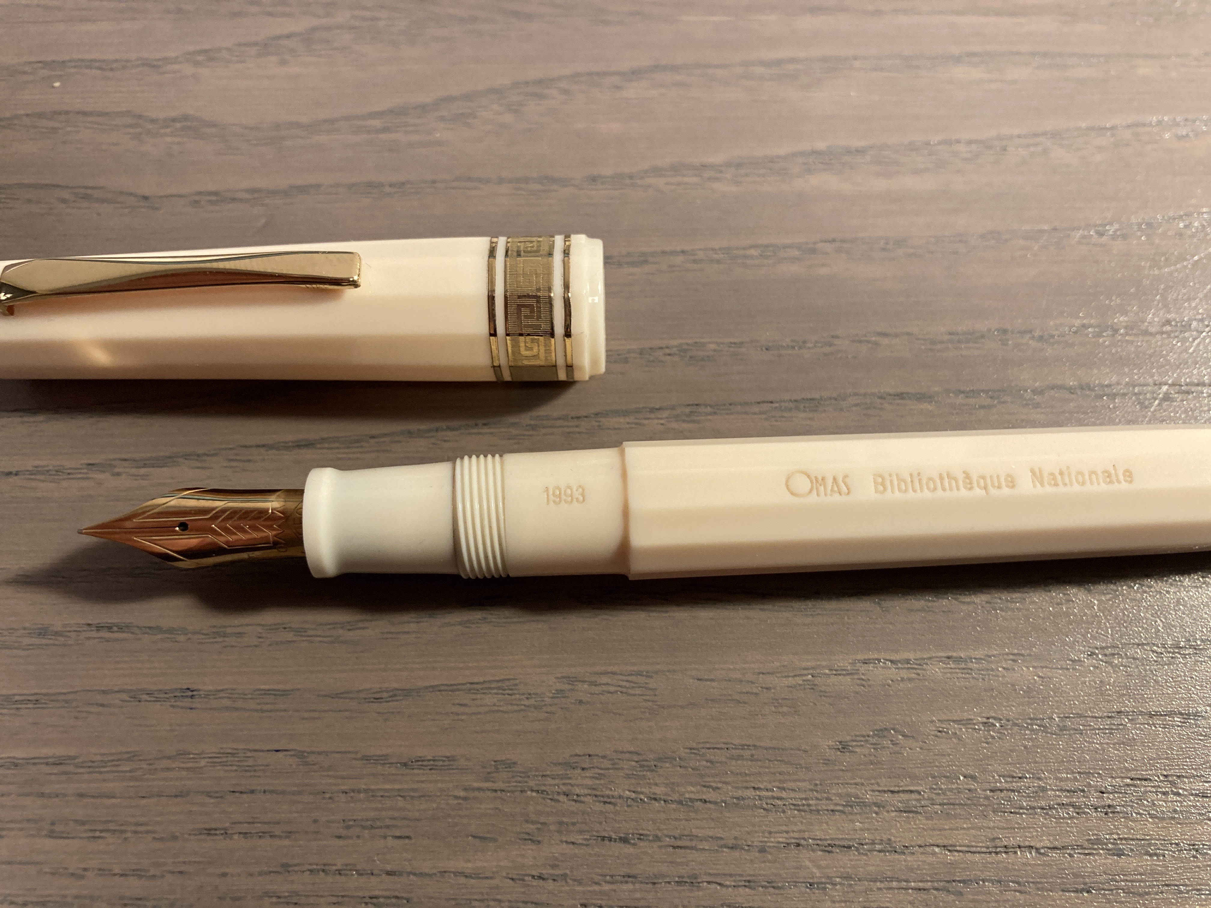 Intorno al 1994 ero già un ometto grandicello e più informato sulle stilografiche, e non mi passò inosservato il lancio di una penna celebrativa che la Bibliothèque Nationale de France commissionò alla Omas. Non sono certo dell’anno esatto. La maggior parte delle Penne "Bibliothèque Nationale" che ho visto sono marcate sulla sezione con l’anno 1994, ma l’anno anteriore la Bibliothèque celebrò il suo 625mo anniversario (la fondò Carlo V, come Bibliothèque du Roy, nel palazzo del Louvre nel 1368) e forse questa è la data più probabile per la commissione. Per l’azienda italiana dovette essere un grande onore essere prescelta da una delle maggiori istituzioni culturali e letterarie d’Europa.