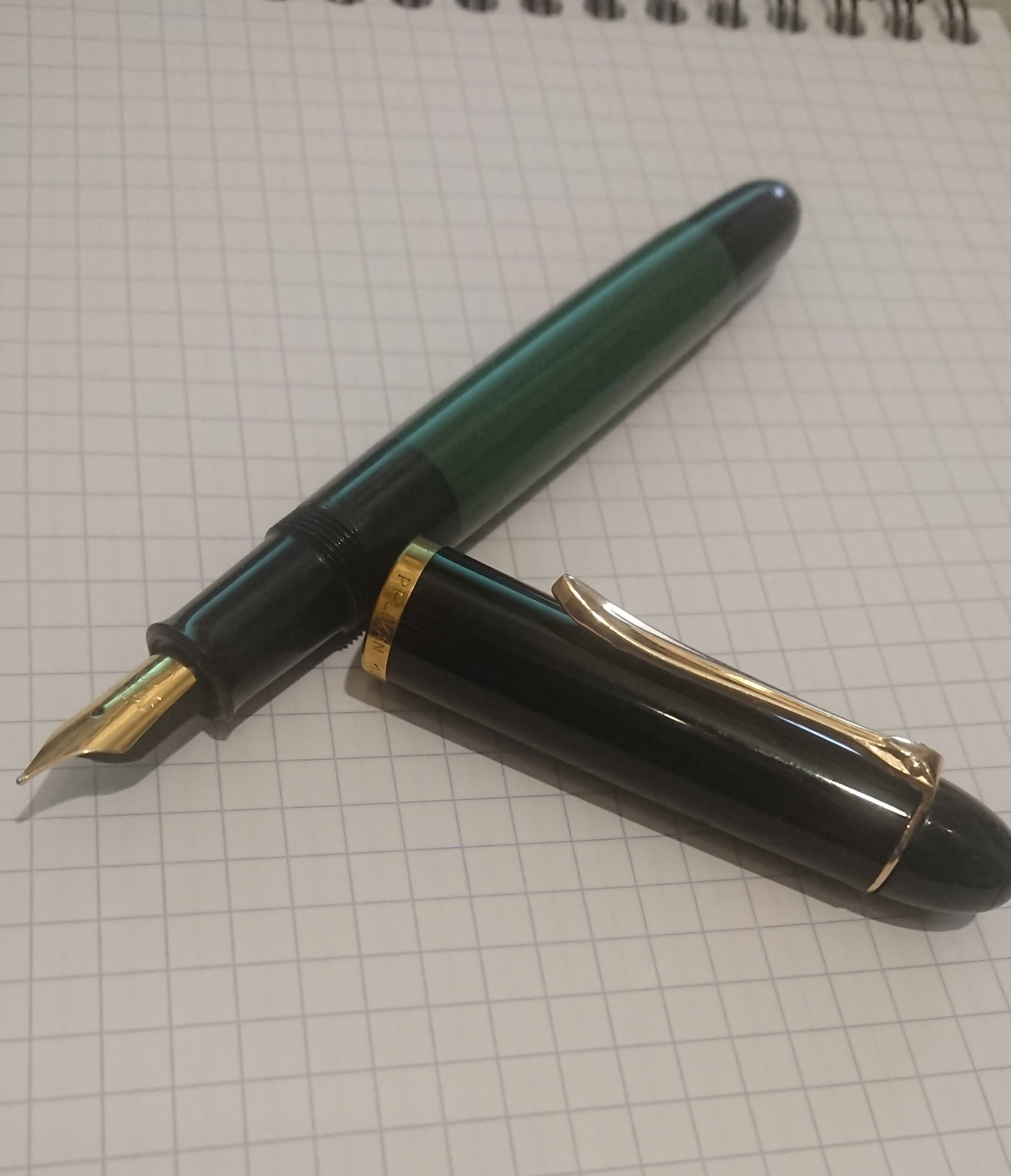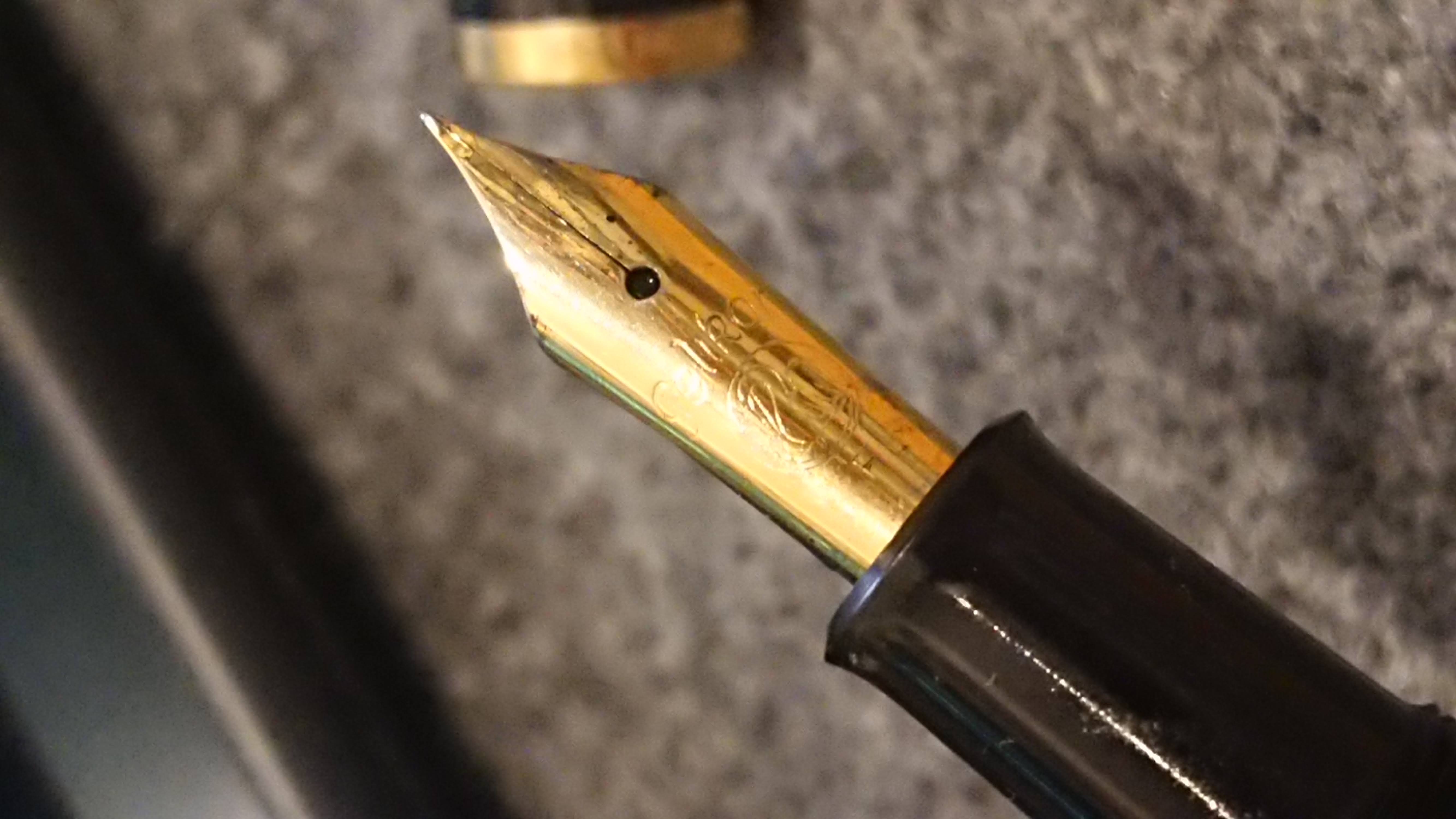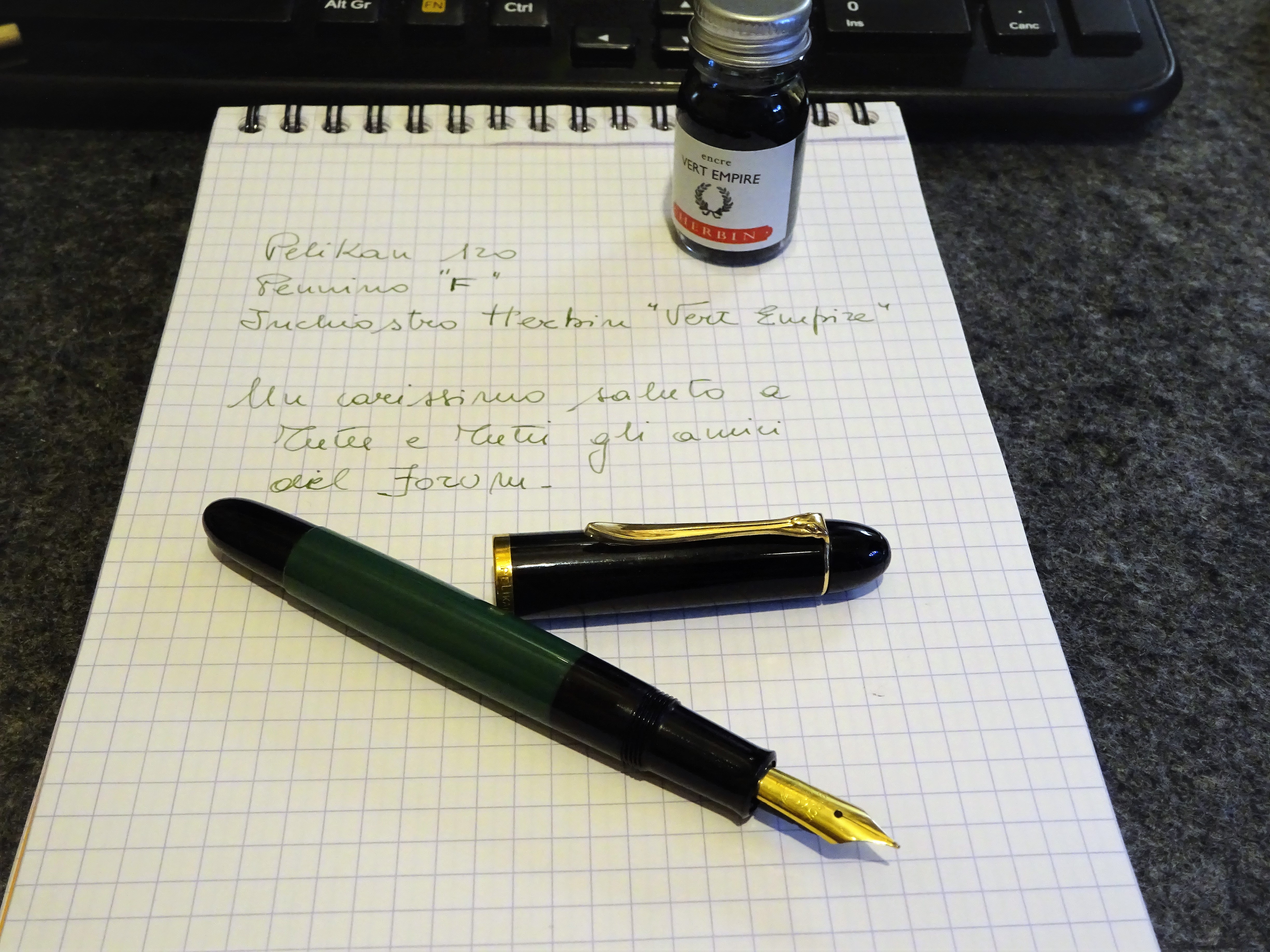Dopo averla inchiostrata con inchiostro Herbin "Vert Empire" ho fatto qualche prova e ho verificato che il pennino grattava un po', forse anche a causa dei mlatrattamenti subiti nell'operazione di rimontaggio. Un'occhiata sotto alla lente e un po' di pressione su uno dei rebbi (molto utile questo link: www.fountainpen.it/Analisi_ed_aggiustamento_del_pennino) e ora la penna va che è una meraviglia! ...e con grandissima soddisfazione!
