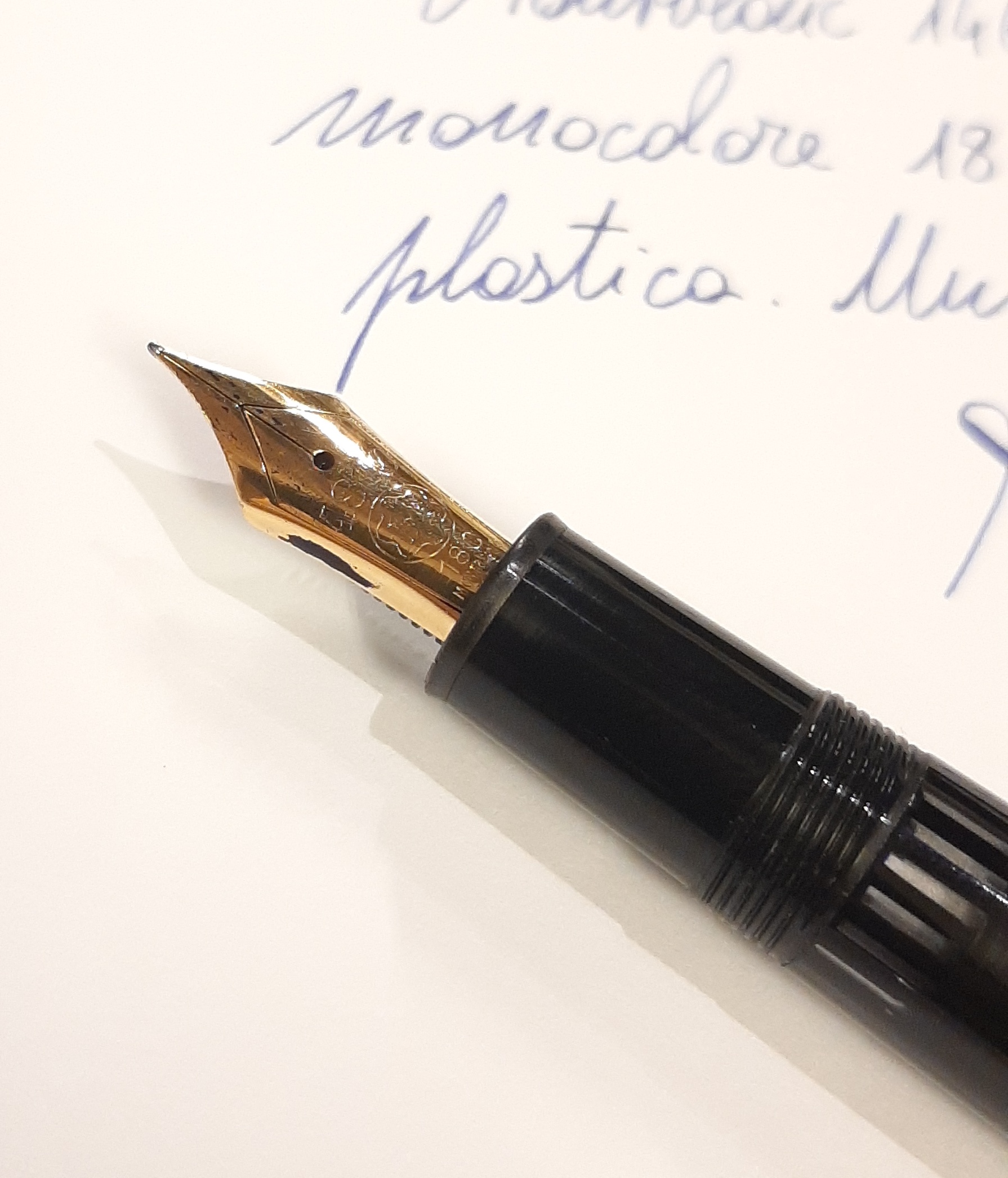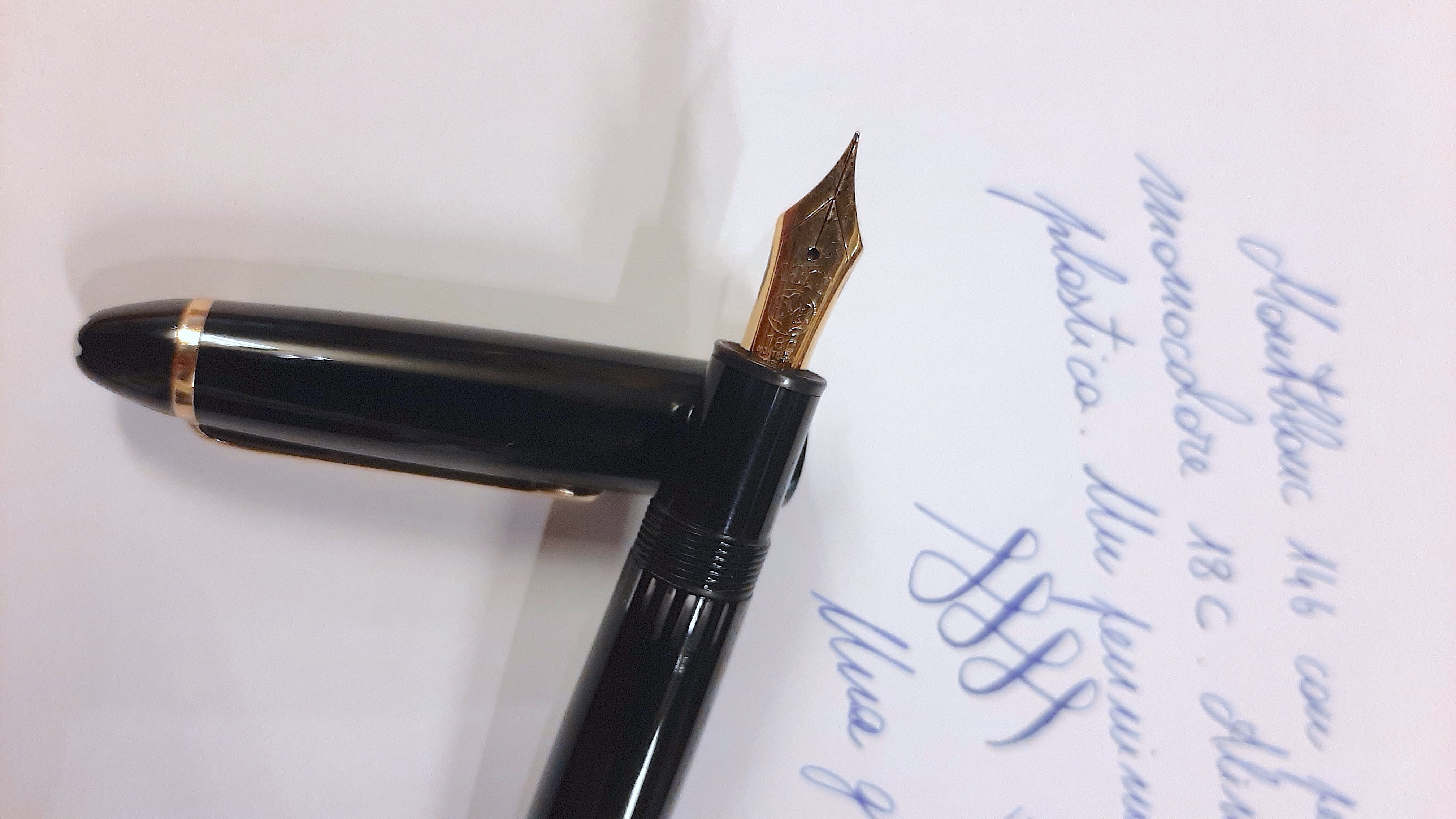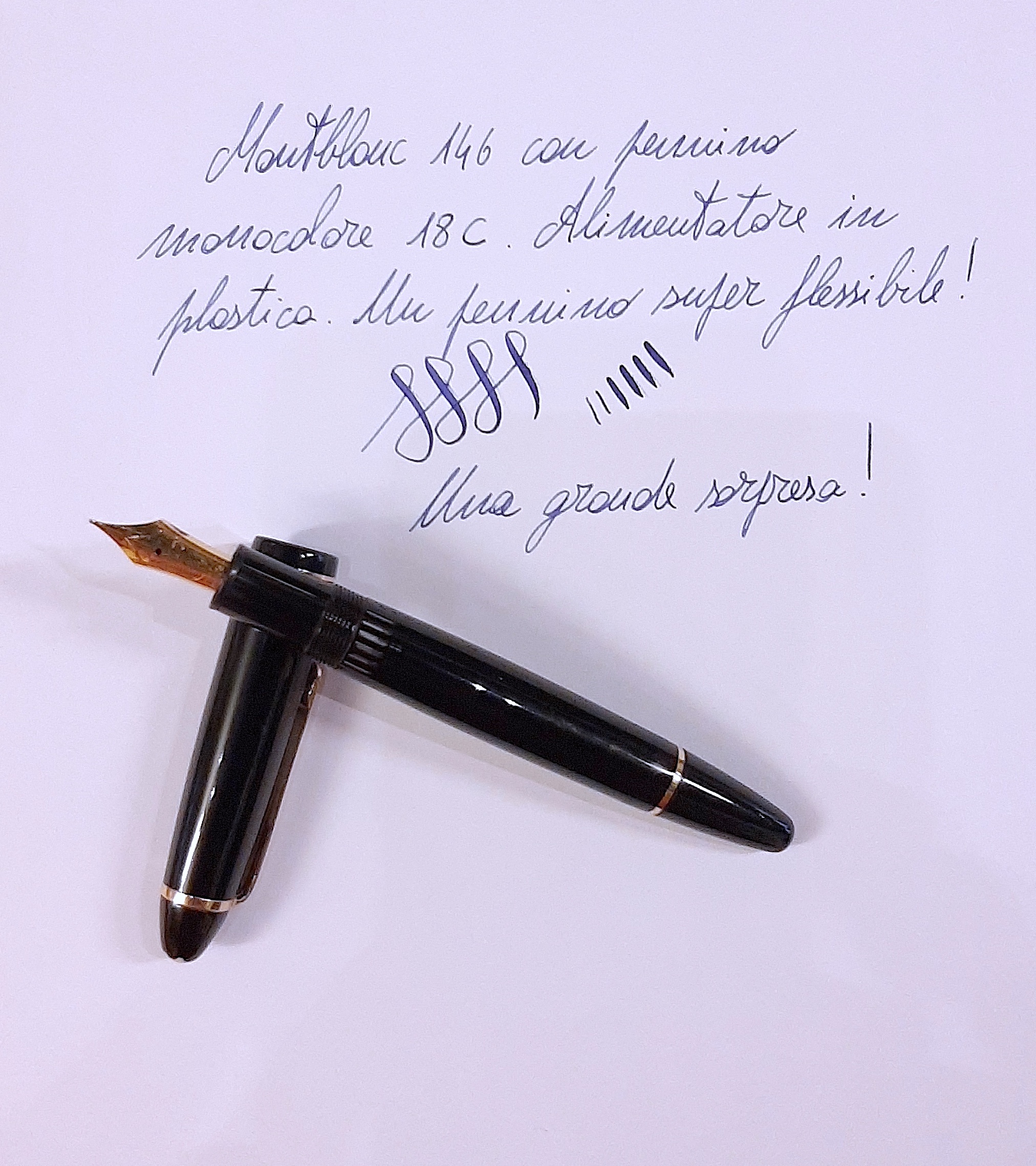 Questa Montblanc 146 è stata una grande sorpresa, all' apparenza una 146 come tante altre, ha però un pennino monocolore in oro giallo punzonato 18 C, probabilmente per il mercato francese? L' alimentatore è in plastica, collocherei di conseguenza questa penna nei primi anni 90 (?). La sorpresa avviene scrivendo, un pennino favoloso di misura extra fine super scorrevole e morbido, provo a calcare un po' la mano e i rebbi si divaricano letteralmente senza alcuno sforzo...Direi di avere scovato un gran pennino che con Montblanc ho trovato solo sulla serie in celluloide anni 50.