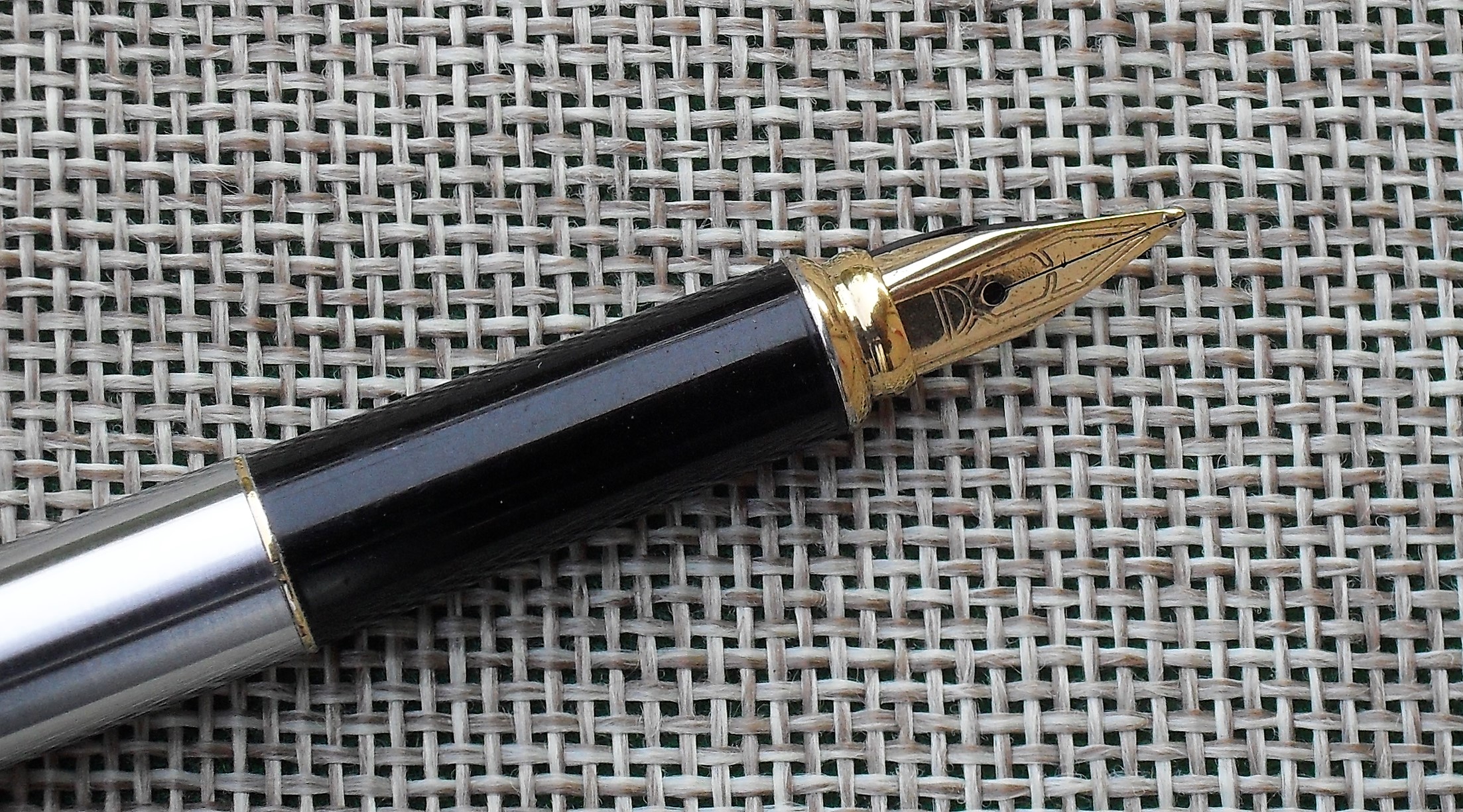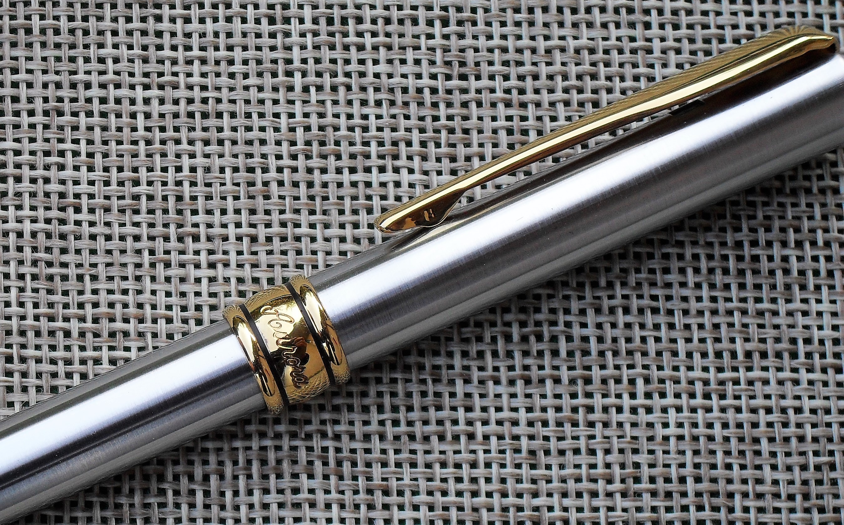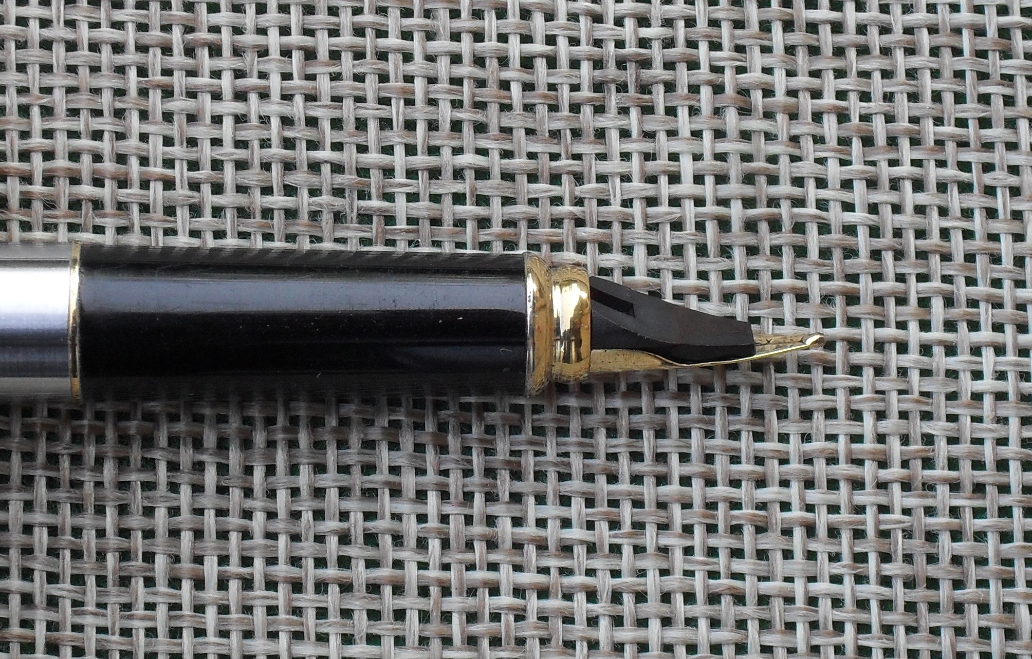 - materiali: corpo e cappuccio in acciaio satinato, clip e vera sul cappuccio in acciaio cromato, pennino in acciaio dorato, sezione in materiale plastico. Il materiale della sezione rende la presa confortevole; il bilanciamento è ottimo, naturalmente diverso quando il cappuccio viene calzato: il metallo, con il suo peso, tende a portare il baricentro indietro, ma senza causare un vero sbilanciamento, aggiungendo nel contempo quel po’ di peso che, secondo i miei gusti, la rende ancor più piacevole; sotto questo aspetto, conta molto il gusto personale, ma la lunghezza del corpo consente anche a chi ha le mani grandi di scrivere agevolmente senza calzare il cappuccio.