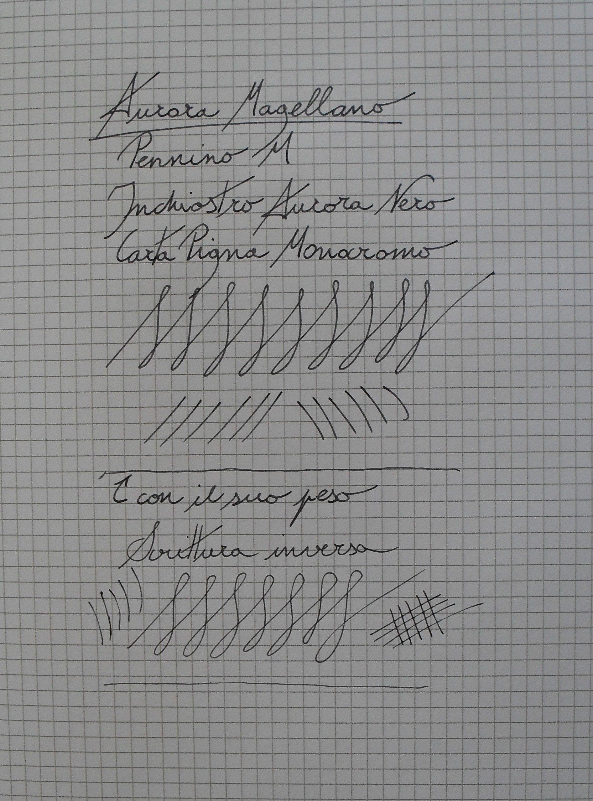 La veretta, che con le sue forme bombate costituisce, insieme alla clip, il tratto caratteristico della Magellano, riporta incisa la scritta “Aurora”, in un bel corsivo, per tre volte. Il pennino, in acciaio dorato ed impreziosito da un’incisione piacevole, che riprende l’estetica della punta della penna, è scorrevole, anche se non burroso, ed eroga una quantità d’inchiostro ottimale: né troppa né poca, su ogni tipo di carta (con le inevitabili variazioni) ed a qualunque velocità di scrittura. La penna scrive anche solo con il suo peso. Per il collaudo, ma anche per l’uso quotidiano, ho utilizzato l’inchiostro Aurora nero. Qui vedete una prova di scrittura su carta Pigna Monocromo. I materiali donano a questa stilografica una robustezza notevole e la sottigliezza del fusto la rende praticissima per il taschino della giacca, evitando rigonfiamenti antiestetici ed ingombri scomodi. L’alimentazione a cartuccia, praticissima, è filosoficamente in linea con la natura dello strumento.