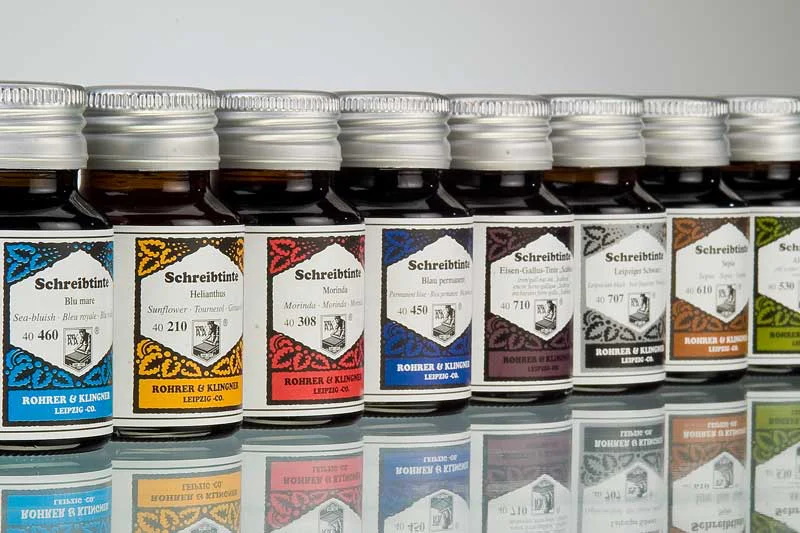Ciao, io mi trovo benissimo con i Rohrer und Kilngner, produttore tedesco storico, buona varietà di colori, tutti (tranne i due ferrogallici) assolutamente no-problem per le penne (si lavano facilmente, non macchiano, non intasano).