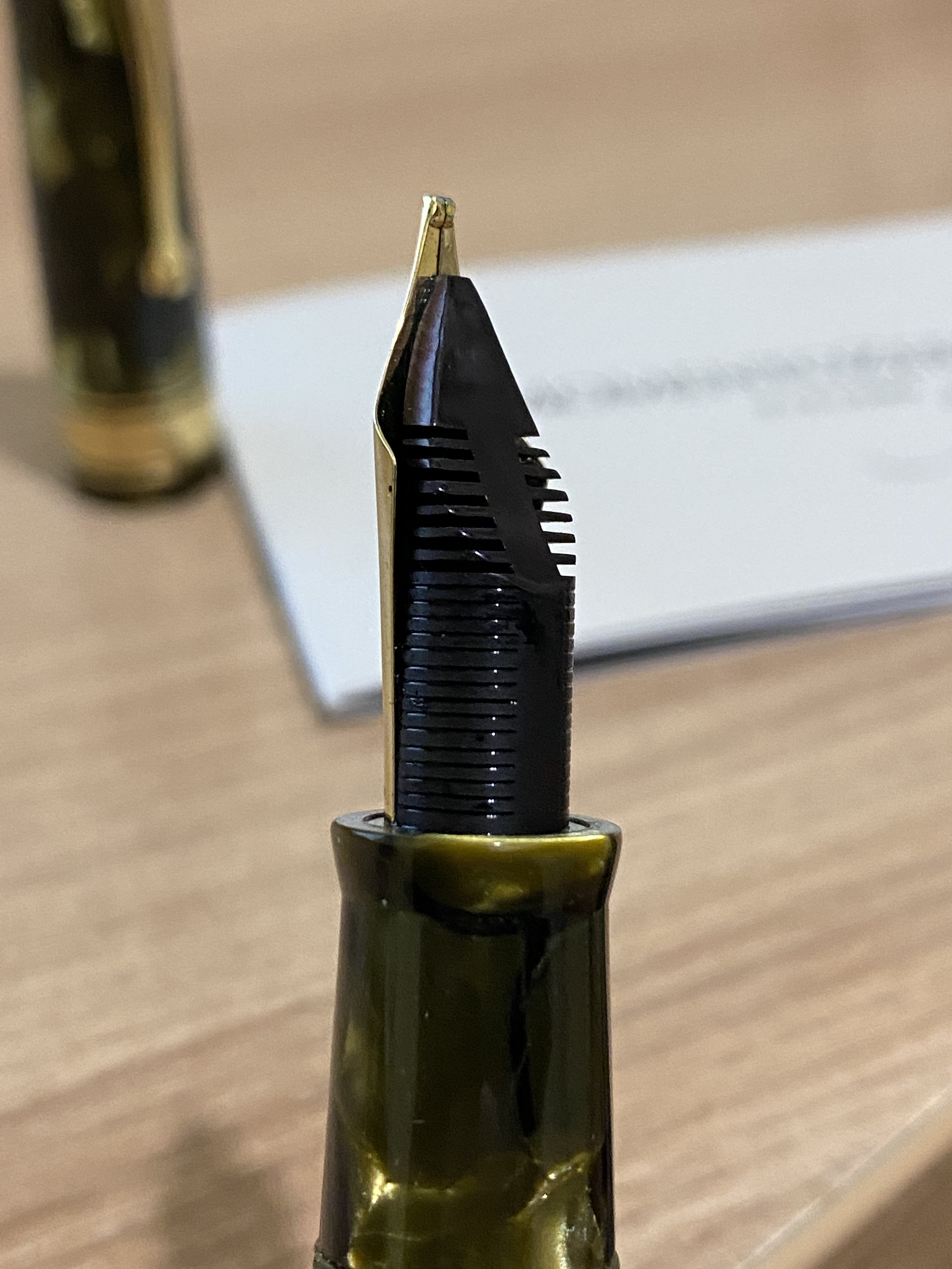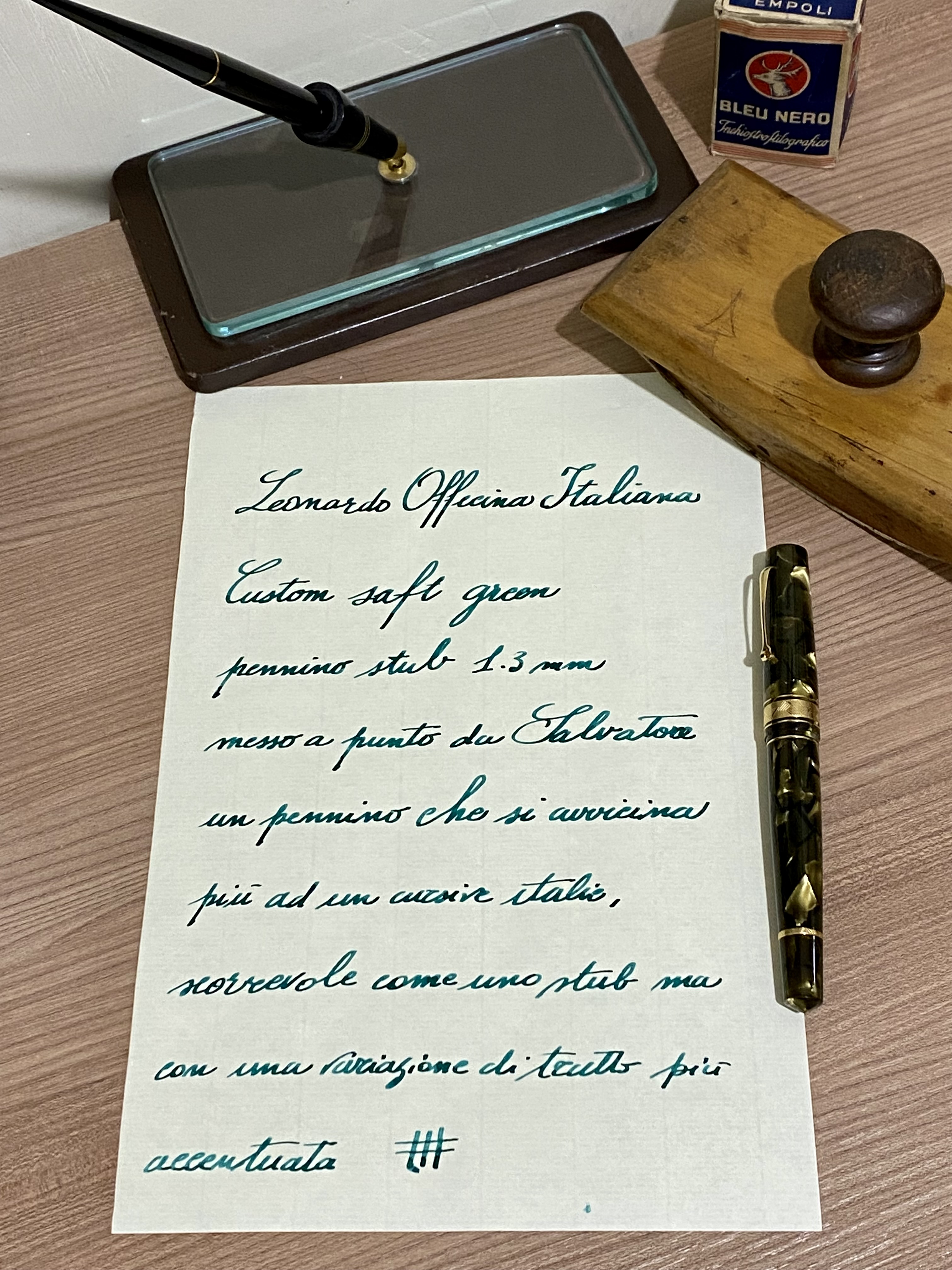 La sezione, a differenza della Momento Zero Grande, è lineare e visto il diametro alla base trovo che si abbini bene al pennino nr.8 installato. In generale però trovo che la forma della sezione della Momento Zero Grande sia più confortevole, cosa che si avverte nelle lunghe sessioni di scrittura. Il gruppo scrittura è composto da un conduttore in ebanite giapponese realizzato in casa accoppiato ad un pennino nr. 8 prodotto da Bock, ma non è il solito e canonico Bock perché questo è uno stub 1.3 rivisto e rifinito da Salvatore, un pennino che offre un suo carattere con una tratto più da Cursive Italic che da Stub. Appena tirata fuori dalla carta ha iniziato a scorrere sulla carta molto piacevolmente, un pennino morbido e setoso con un flusso a dir poco generoso che offre una variazione di tratto più accentuata di uno stub ma senza le difficoltà d’uso di un vero italico. E' una penna che scrive sempre, senza mai fermarsi, con un tratto costante e senza smagrimenti del flusso, la sola cosa di cui necessita è l'inchiostro, quello in foto è il Waterman Harmonious Green. La critica che continuo a muovere a Leonardo è che usa pennini che non sono fatti in casa, fanno praticamente tutto anche le minuterie metalliche, credo che oramai è ora di dare un carattere distintivo alle sue penne anche nelle peformance di scrittura. Dimenticavo, l’altro difetto di questa penna è il prezzo… ma a caval donato non si guarda in bocca