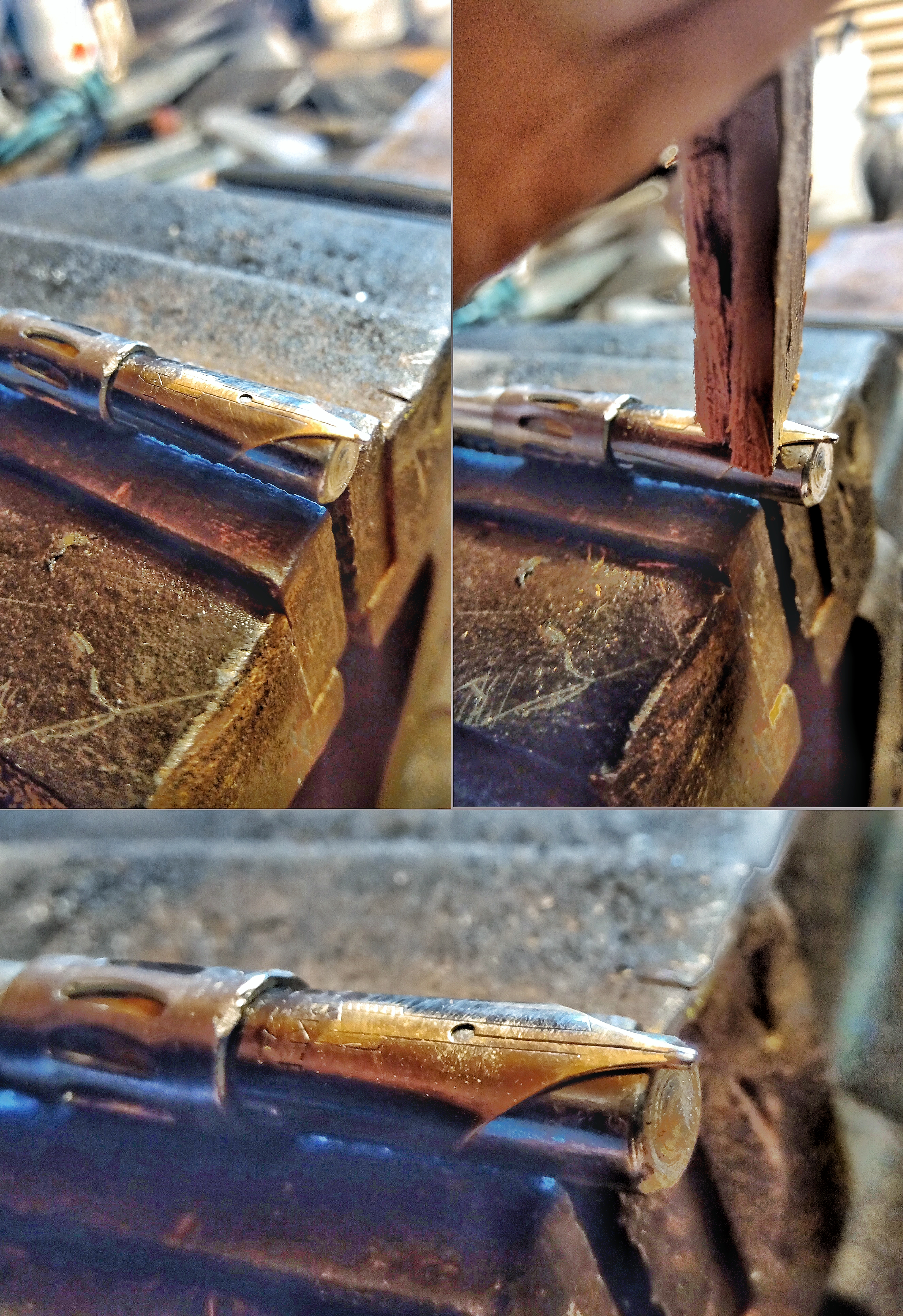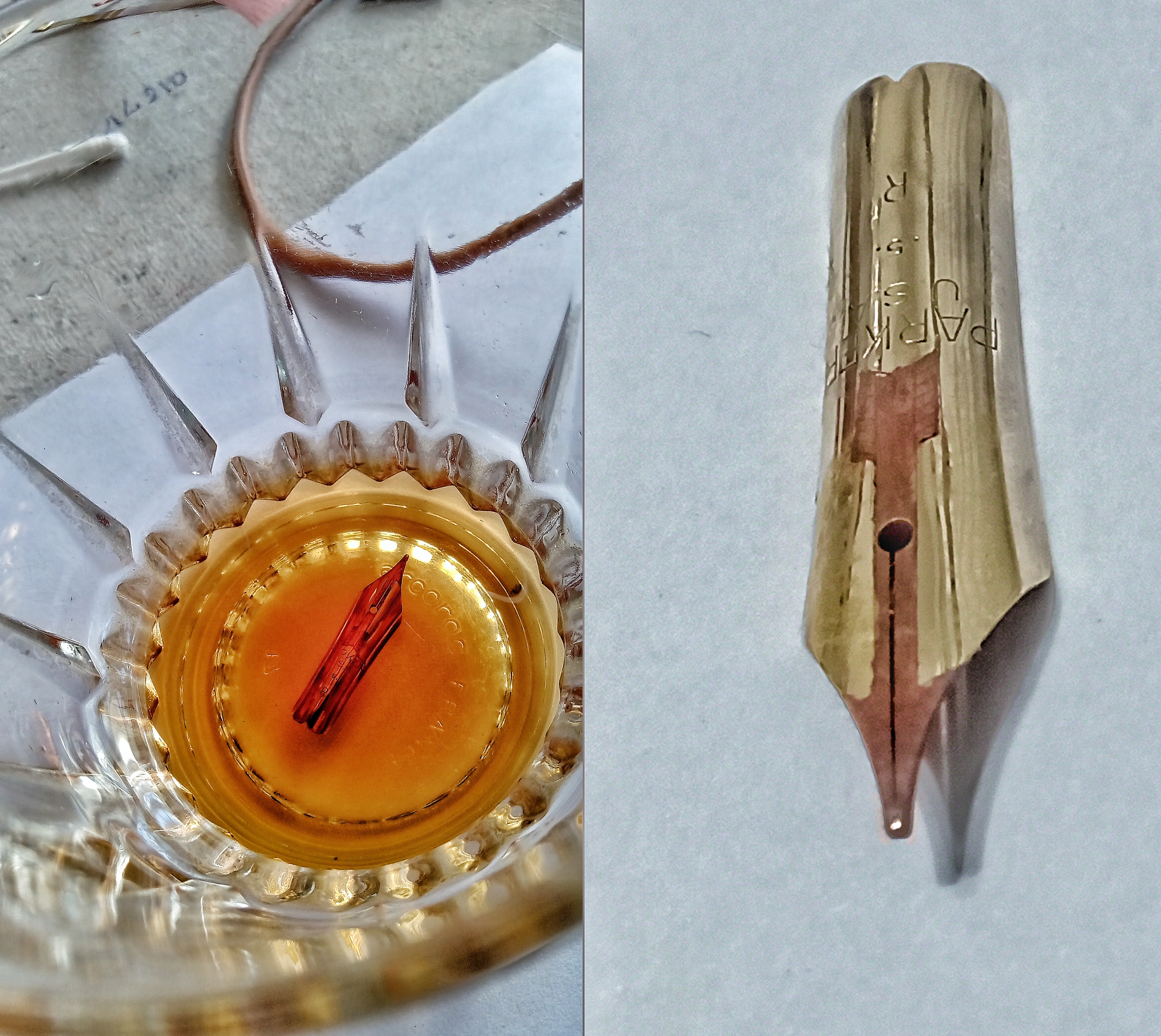 Questa lavorazione viene eseguita con un martelletto e uno scalpello del legno più duro che possa esistere (qui abbiamo quebracho, virapita e altri) con l'idea di stirare senza lasciare alcun segno o ammaccatura sulla superficie esterna... Una volta ottenuta una levigatura "accettabile", abbiamo iniziato un processo di lucidatura con carta abrasiva grado 3500 che logicamente finisce per spazzare i micron di maschera d'oro o platino che il pennino aveva in alcune parti della sua superficie (della maschera era rimasta ben poca)... Iniziamo quindi il processo di sgrassaggio (basta con un batuffolo di cotone e alcool etilico al 90%) e il processo di mascheratura con una lacca di vetro colorato, per determinare la superficie dove effettueremo la deposizione elettrolitica (purtroppo il mio polso e i miei occhi non rispondono più)... Prepariamo ora il bagno elettrolitico, con una sorgente di corrente continua da 9 volt, un metallo che può essere rame puro, e una soluzione di acido cloridrico al 50% (bisogna indossare occhiali e guanti!!!) e lasciamo agire 30 minuti deposizione del metallo dove non era mascherato (nel nostro caso la freccia di Parker)... Una volta terminata la deposizione, il pennino va lavato bene per togliere ogni traccia di acido, e poi si rimuove la lacca con un buon solvente organico (acetone o diluente) con un risultato molto interessante...
