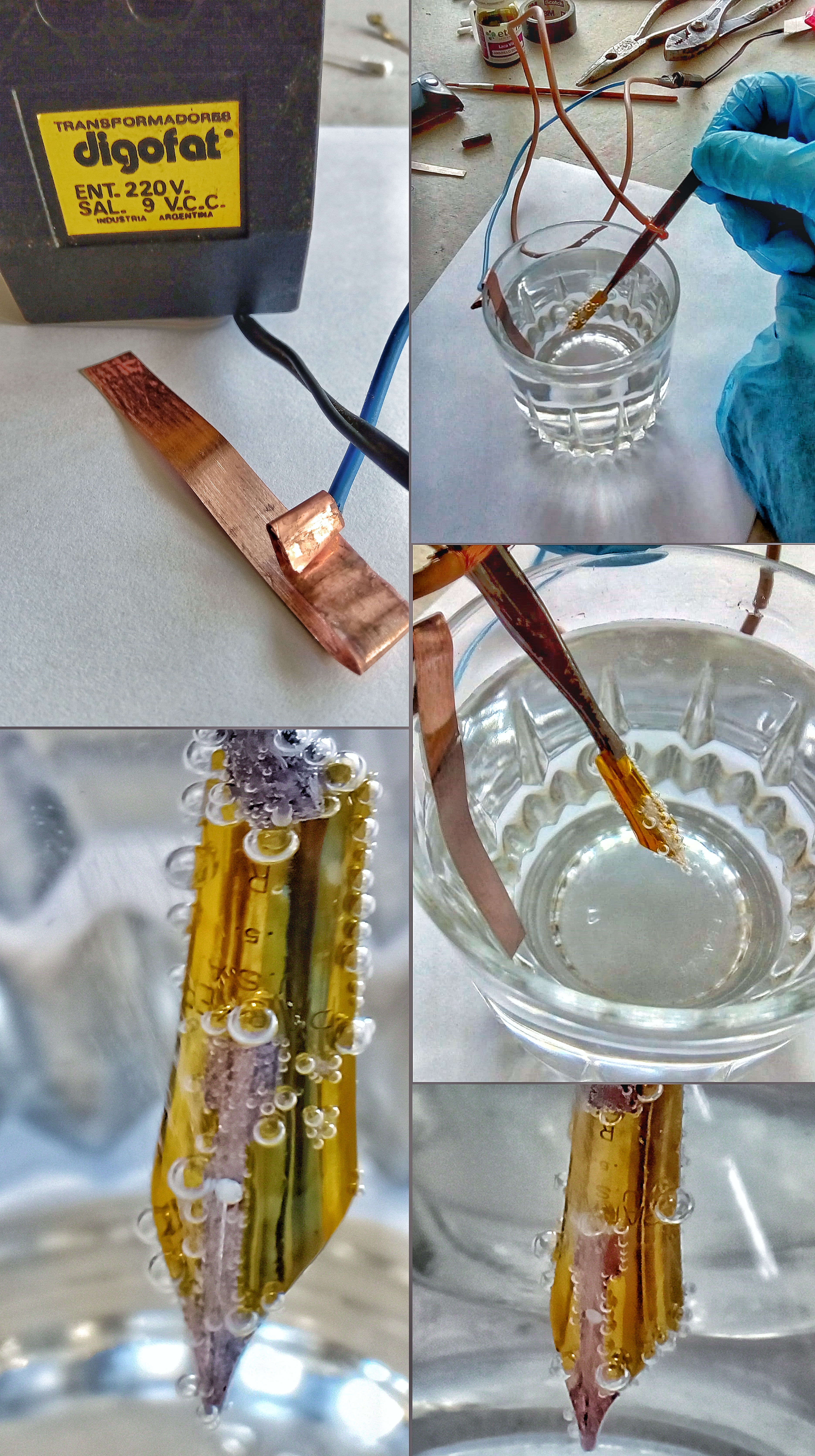 We now prepare the electrolytic bath, with a 9-volt direct current source, a metal that can be pure copper, and a 50% hydrochloric acid solution (you have to wear glasses and gloves !!!) and leave 30 minutes in the process deposition of the metal where it was not masked (in our case the Parker arrow)...