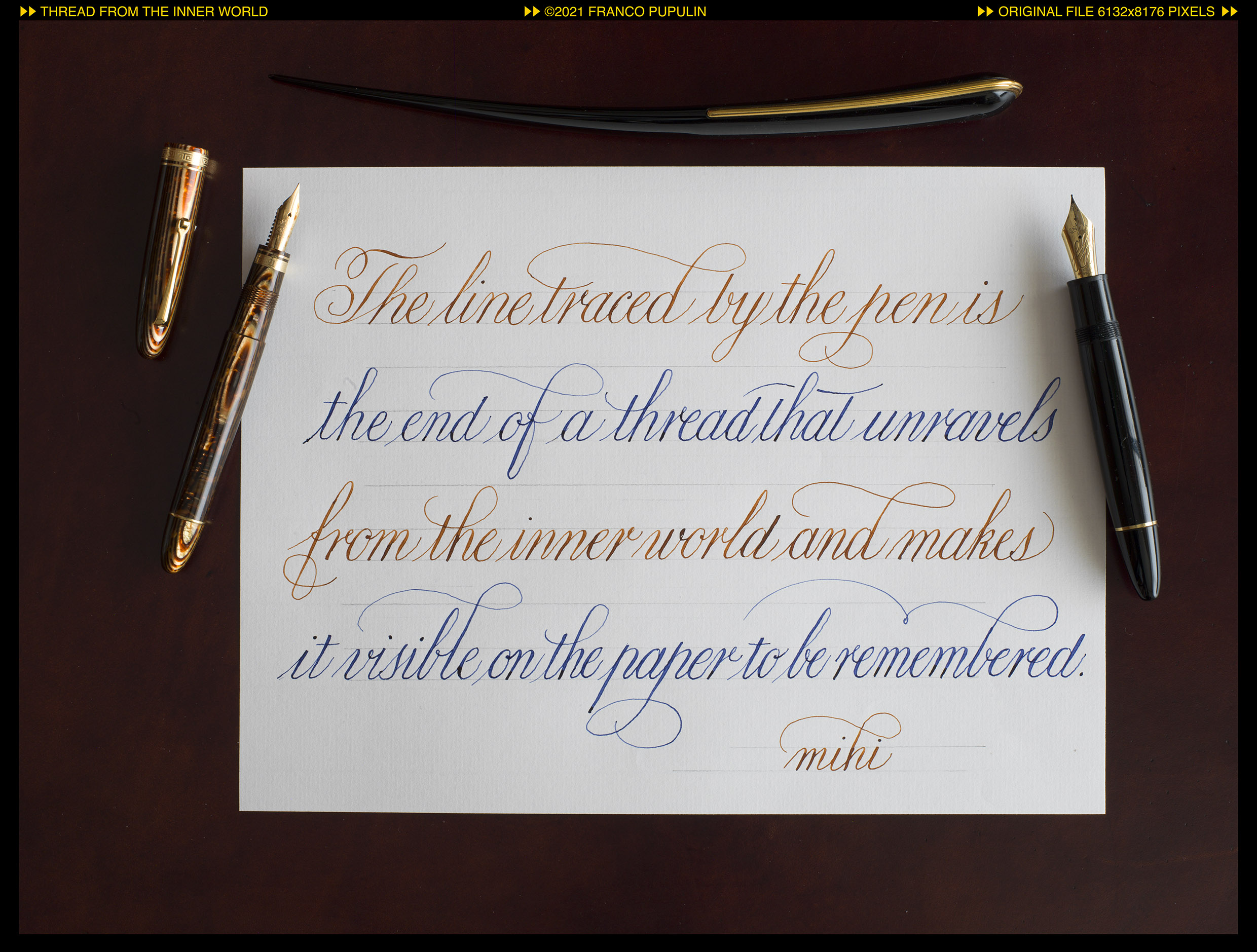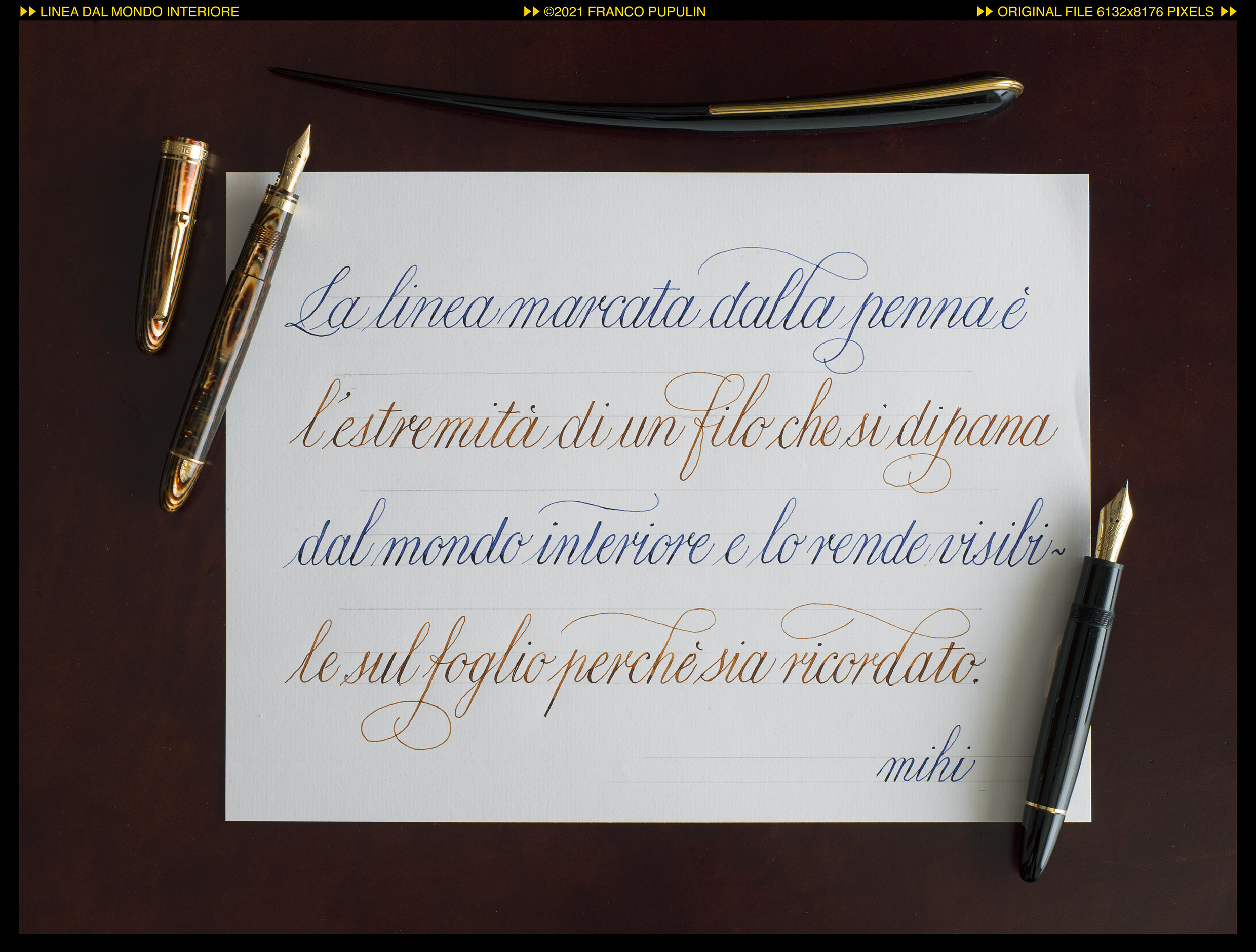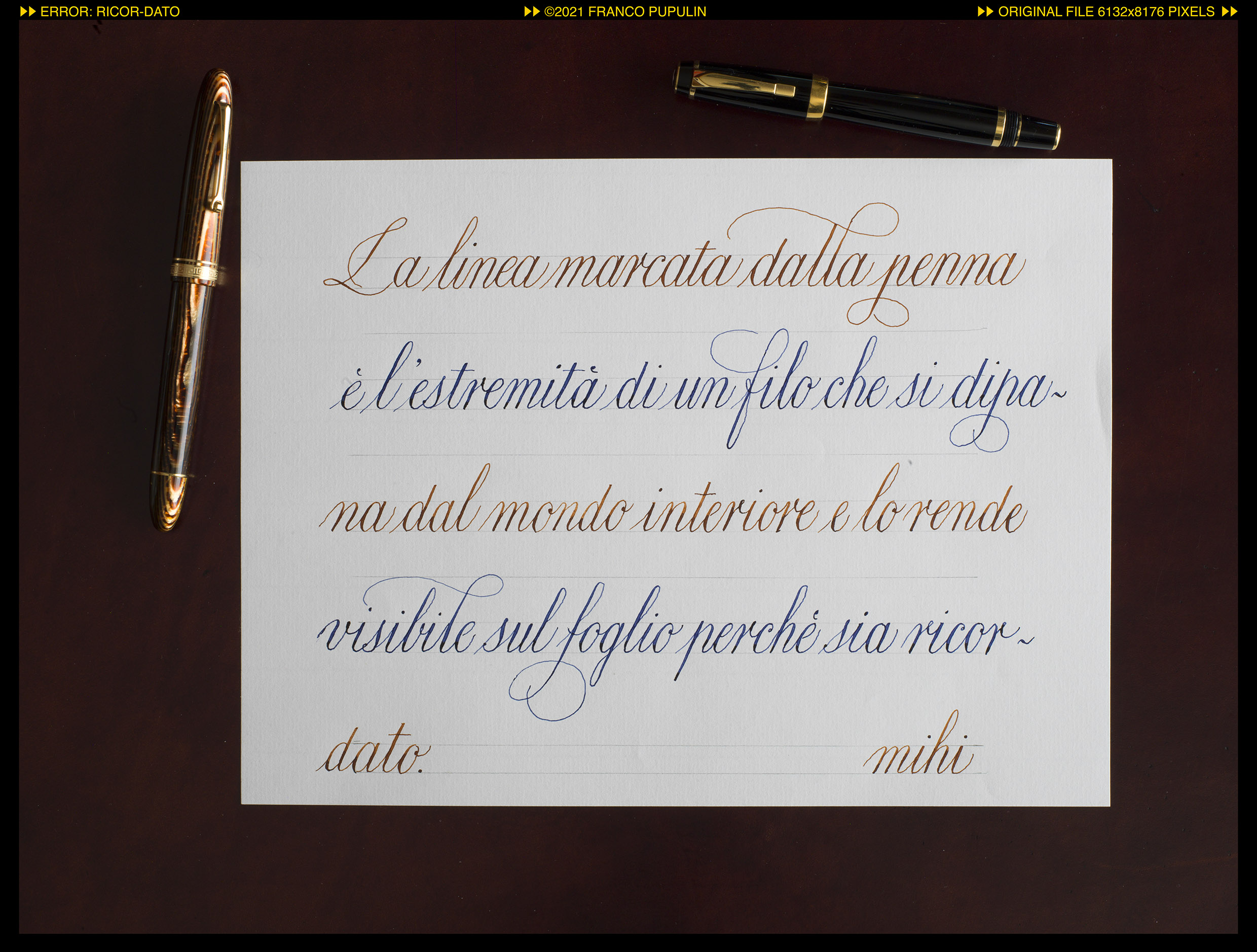 Non sono sicuro che mi piaccia l'alternanza dei due colori, ma mi sono divertito a cambiare penna tra una riga e l'altra, per sentirne la differenze tra i pennini e apprezzarne la distinta morbidezza.