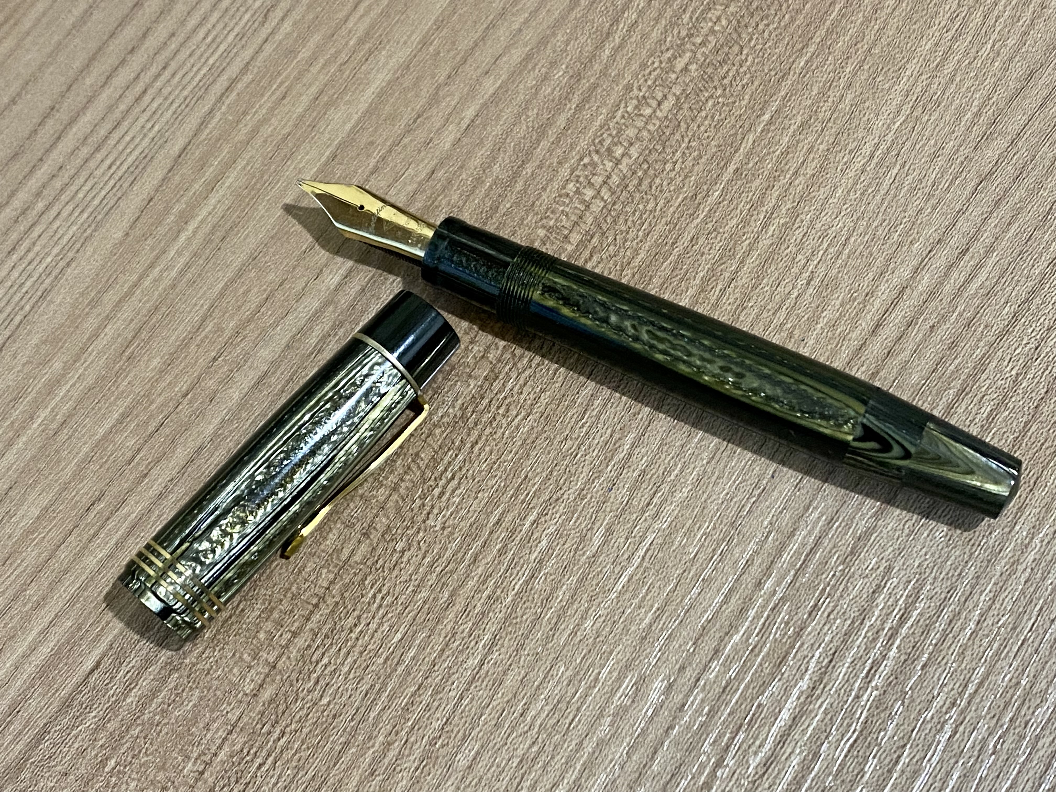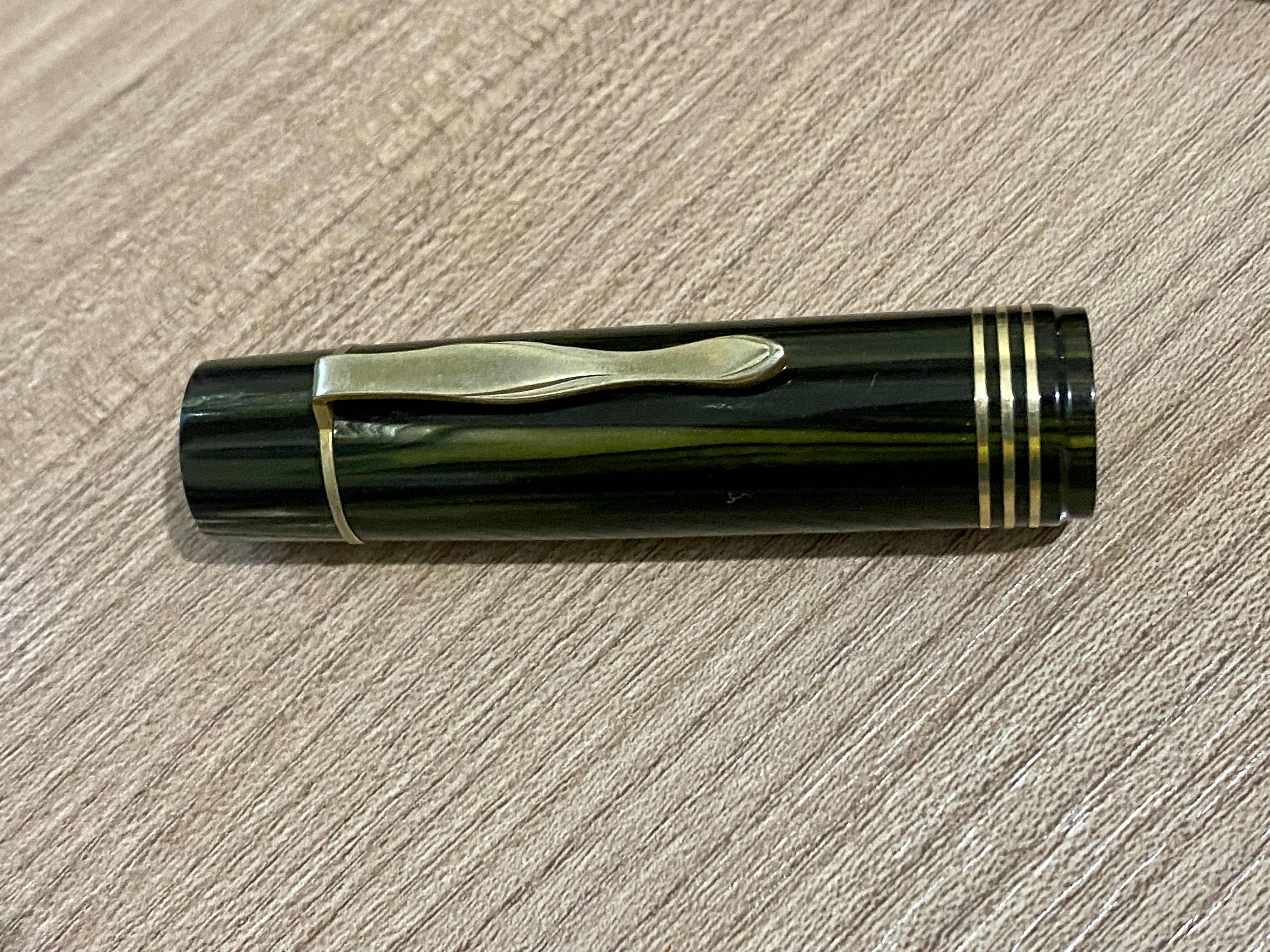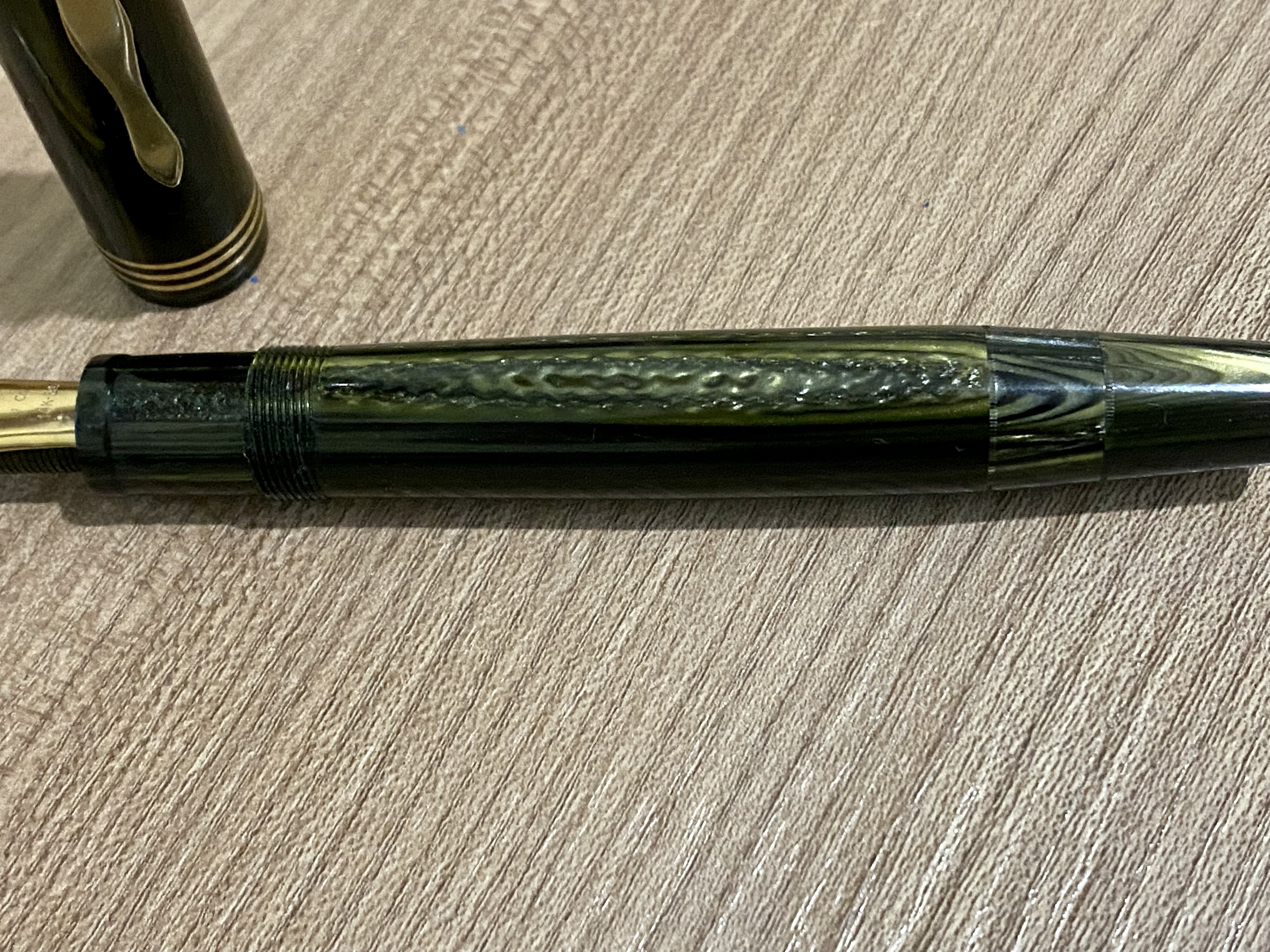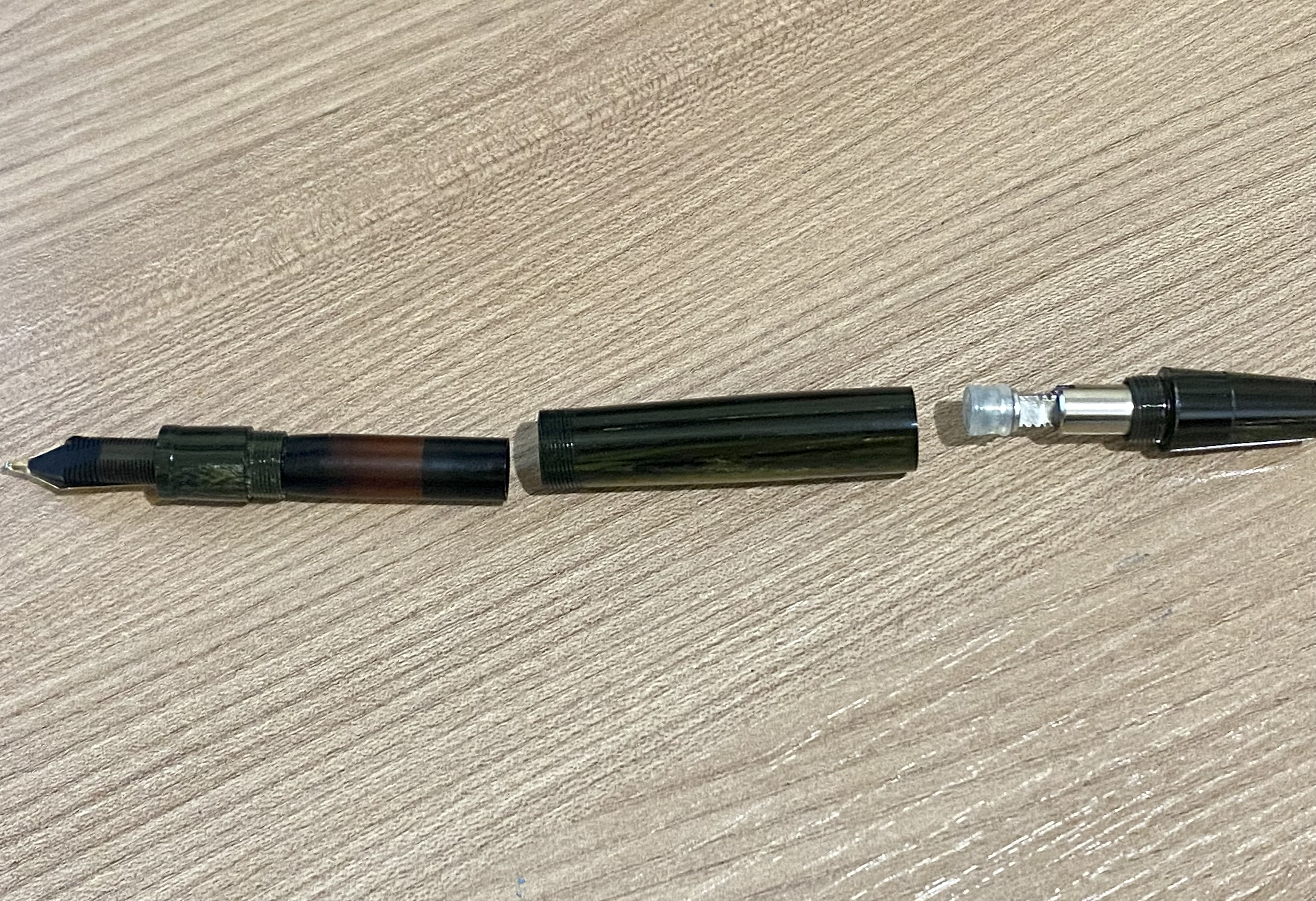 La prima cosa che salta all'occhio guardando questa penna è che è "disordinata", il corpo della penna ha sezione, fusto principale, l'anello che fissa il pistone ed il fondello di ricarica, in nessuna delle quattro parti il motivo della celluloide si allinea, ovviamente neanche il motivo del cappuccio si allinea con il resto della penna.