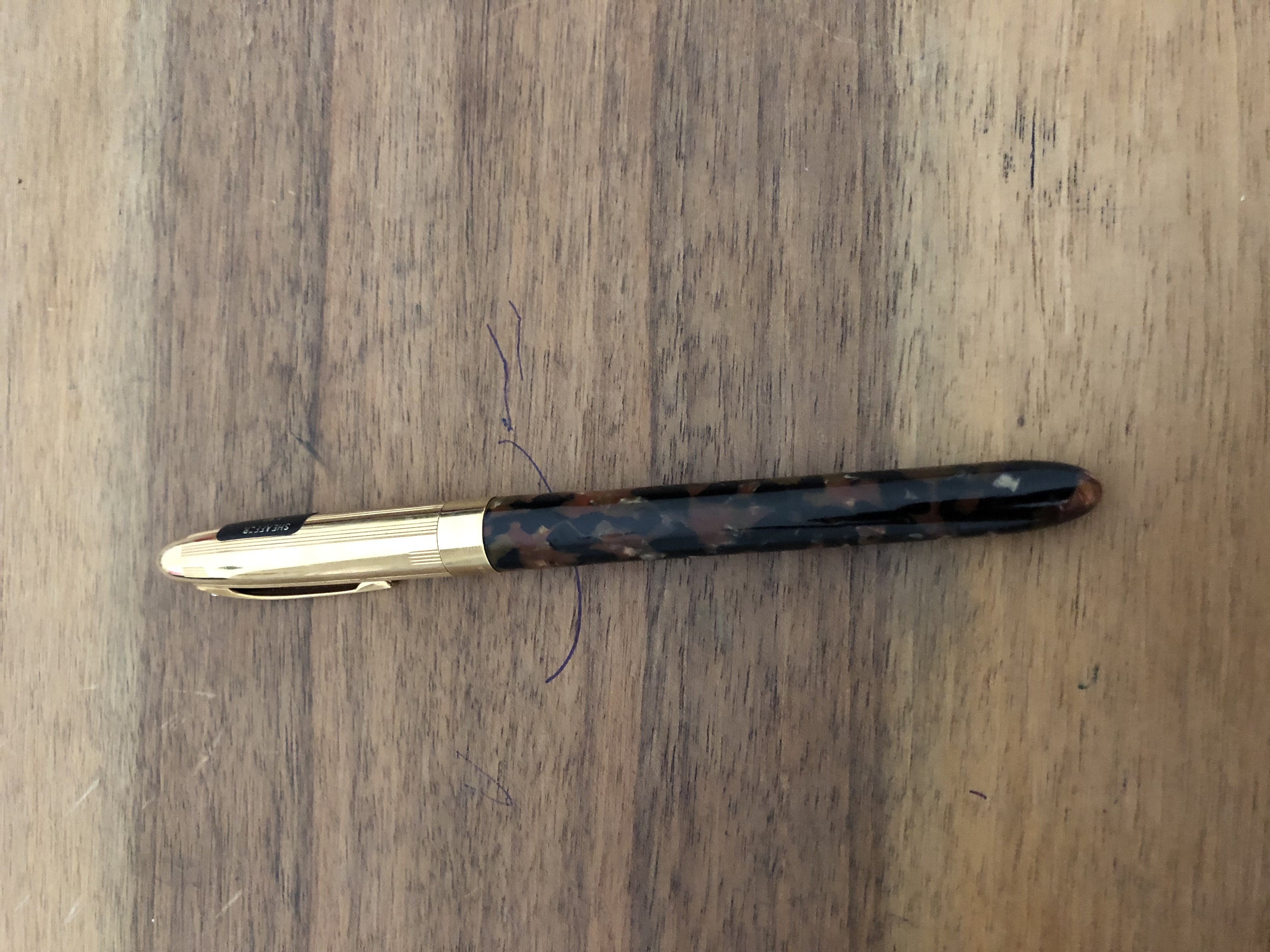 analisi della penna e con mia sorpresa il fusto si è rivelato in celluloide, non sono riuscito a capire se col tempo si è leggermente ‘ristretto’ o se è la molla sul fondo a fare i capricci. Comunque tolto 1mm dal gommino del refill con taglierino ed ora la penna chiude e va come nuova.