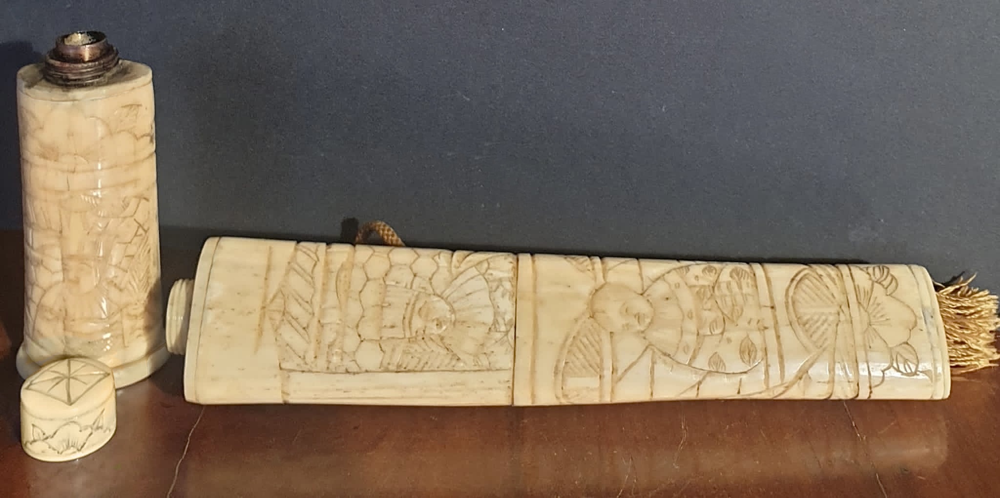 Raro, antico completo scrittorio da cintura (qalamdan, penner, yatate?) orientale in osso con calamaio in rame premuto dal basso con molla. H cm 27,4. Nelle ultime due foto, particolari delle iscrizioni su porta pennelli/calami e porta calamaio. Pennelli non coevi.