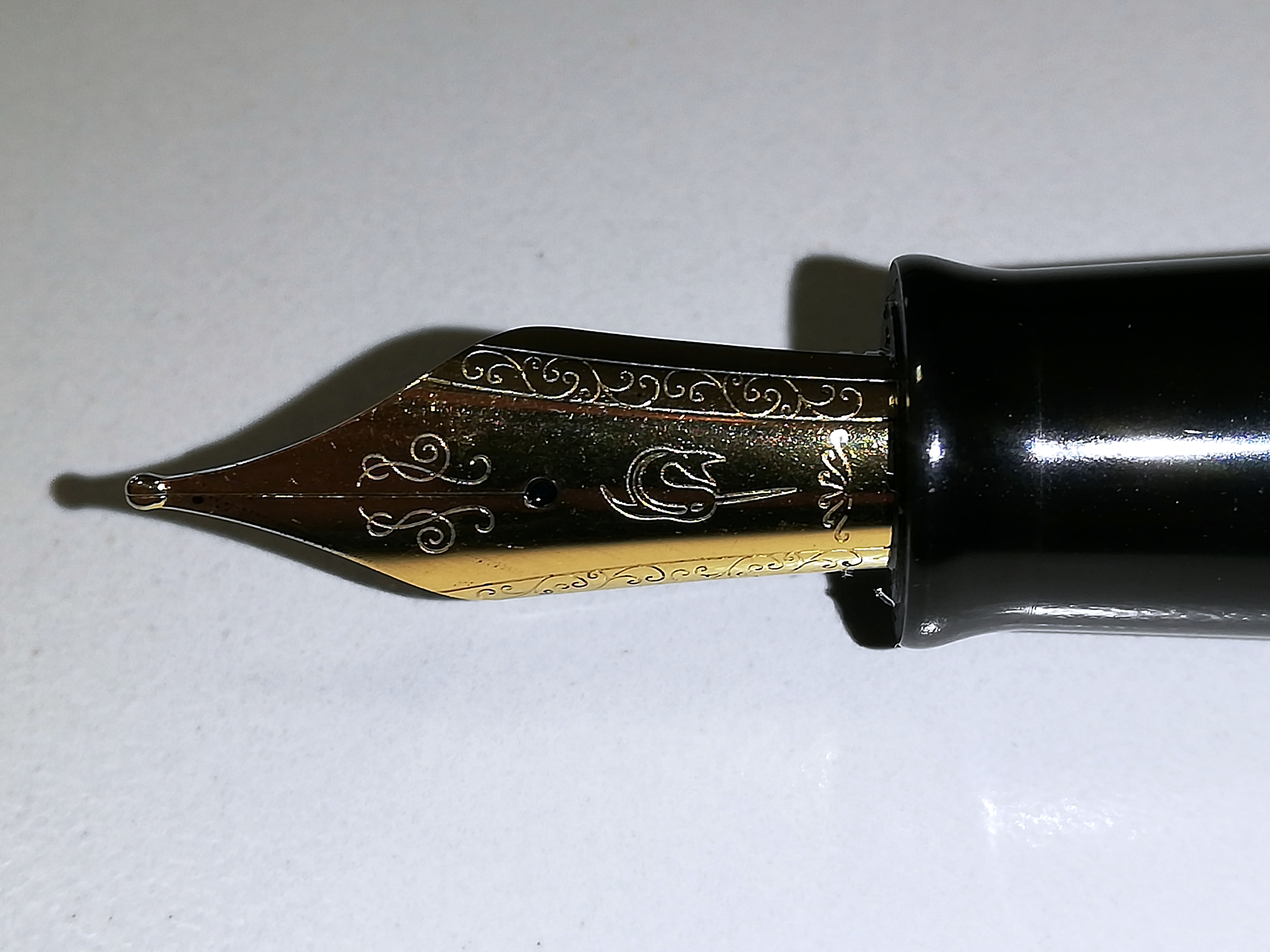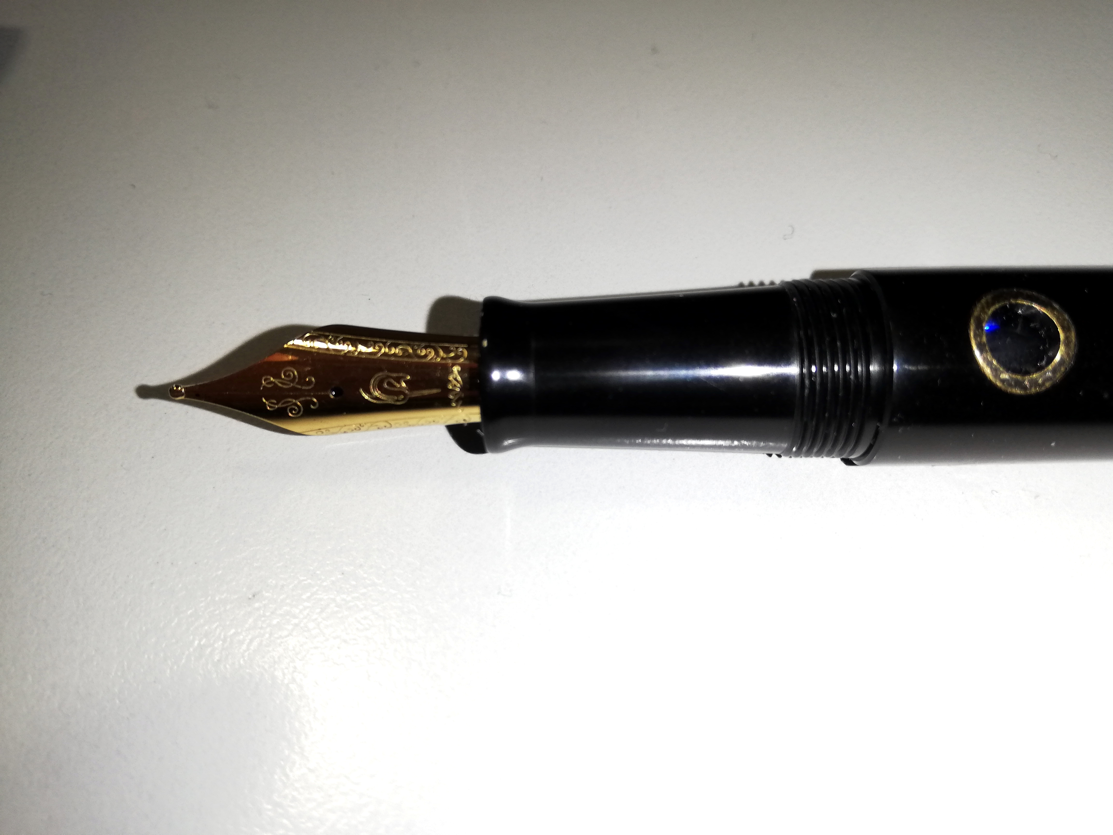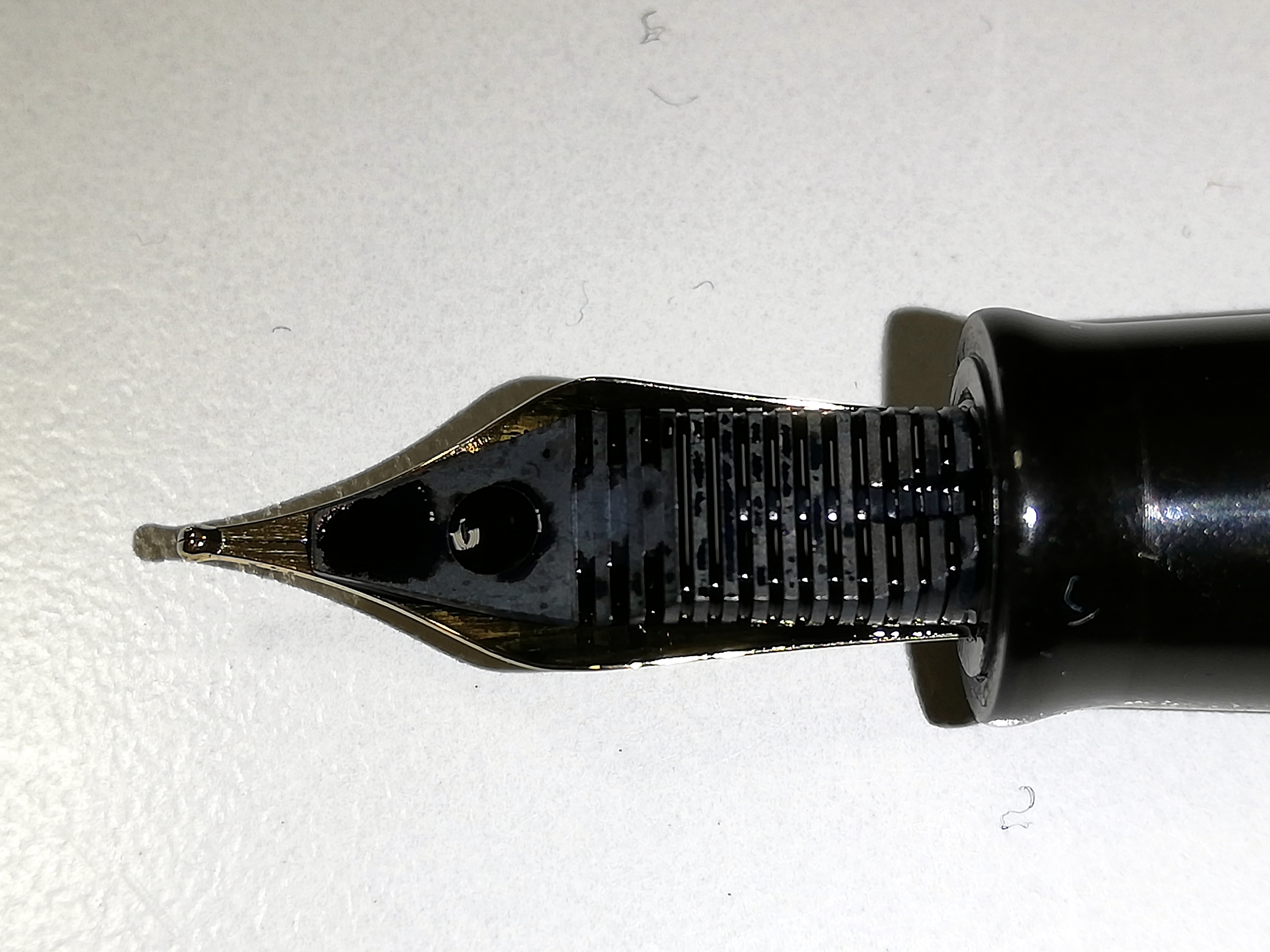 - Come dichiarato dal produttore, il pennino è una versione “in-house”, un #6 in acciaio dorato, con foro di compensazione (di taglia Broad nel mio caso). Per la mia grafia, che è piuttosto piccola, il tratto è un po’ abbondante, ma dovrebbe essere possibile sostituirlo con un Jowo di altra misura. Una volta carica ed a regime, non ho riscontrato salti di tratto e trovo il pennino estremamente scorrevole. Può essere usata con il pennino capovolto ed in questo caso lo spessore del tratto è circa dimezzato, ma si perde buona parte della scorrevolezza e si sente un po’ grattare sulla carta, che sia Rhodia o ordinaria carta da fotocopie.