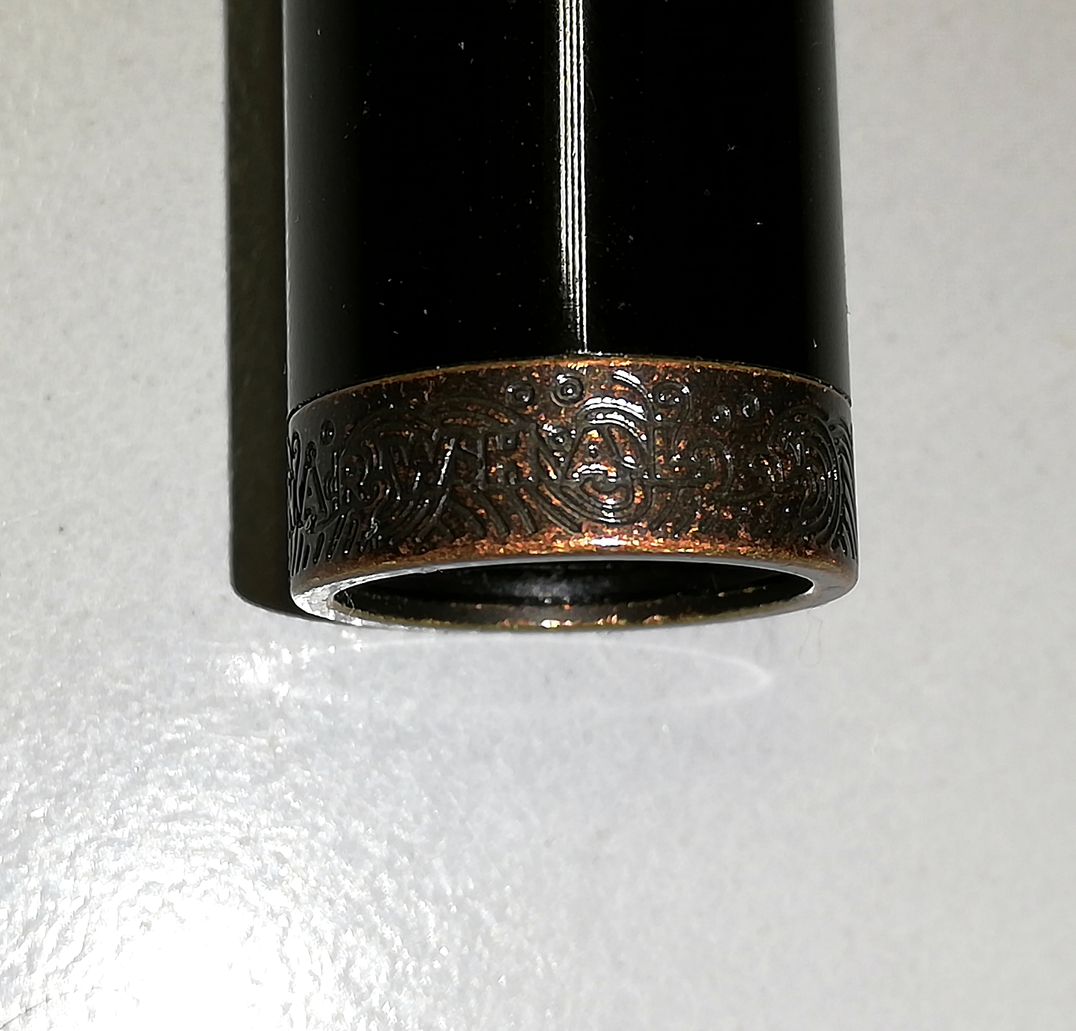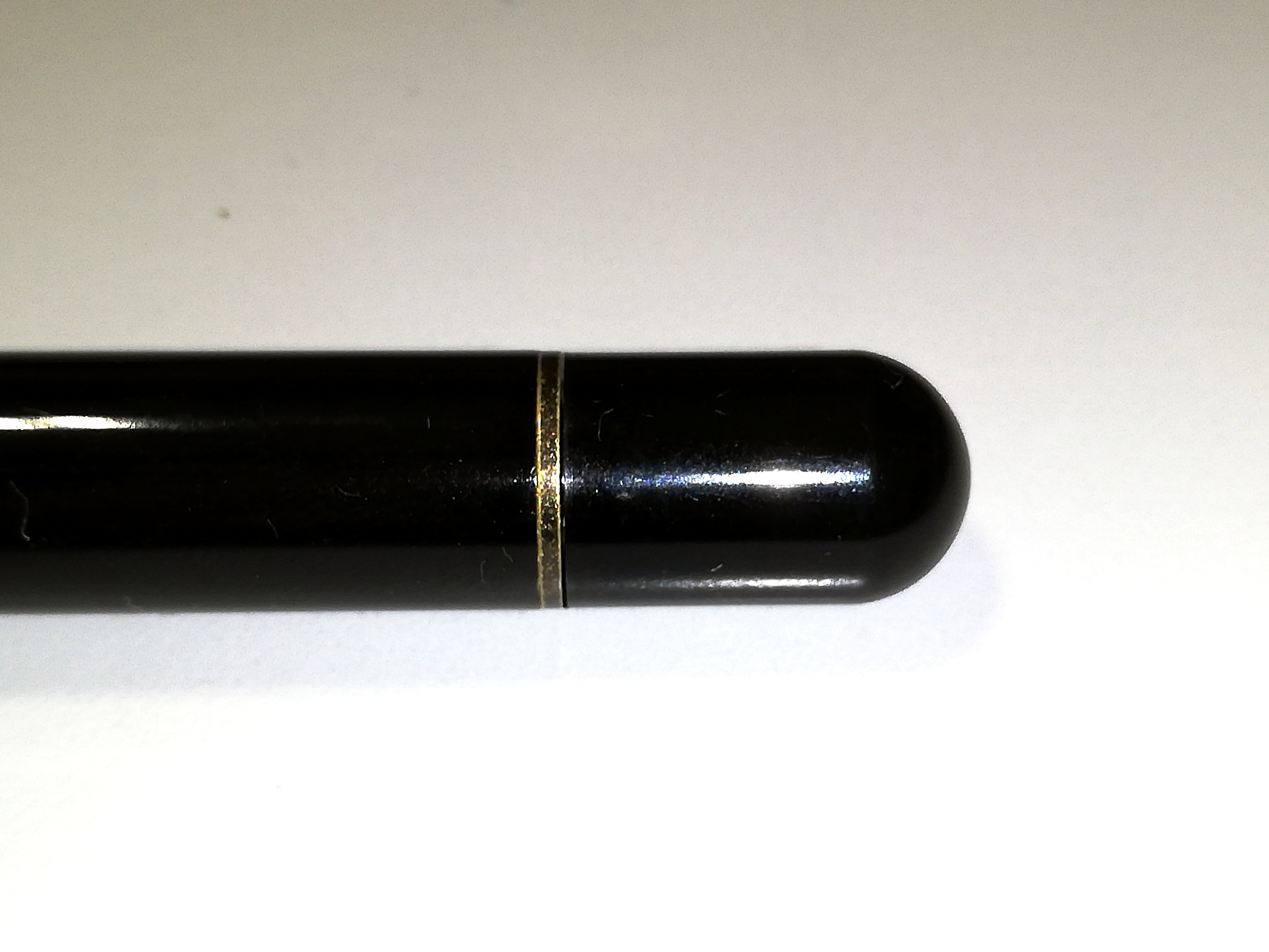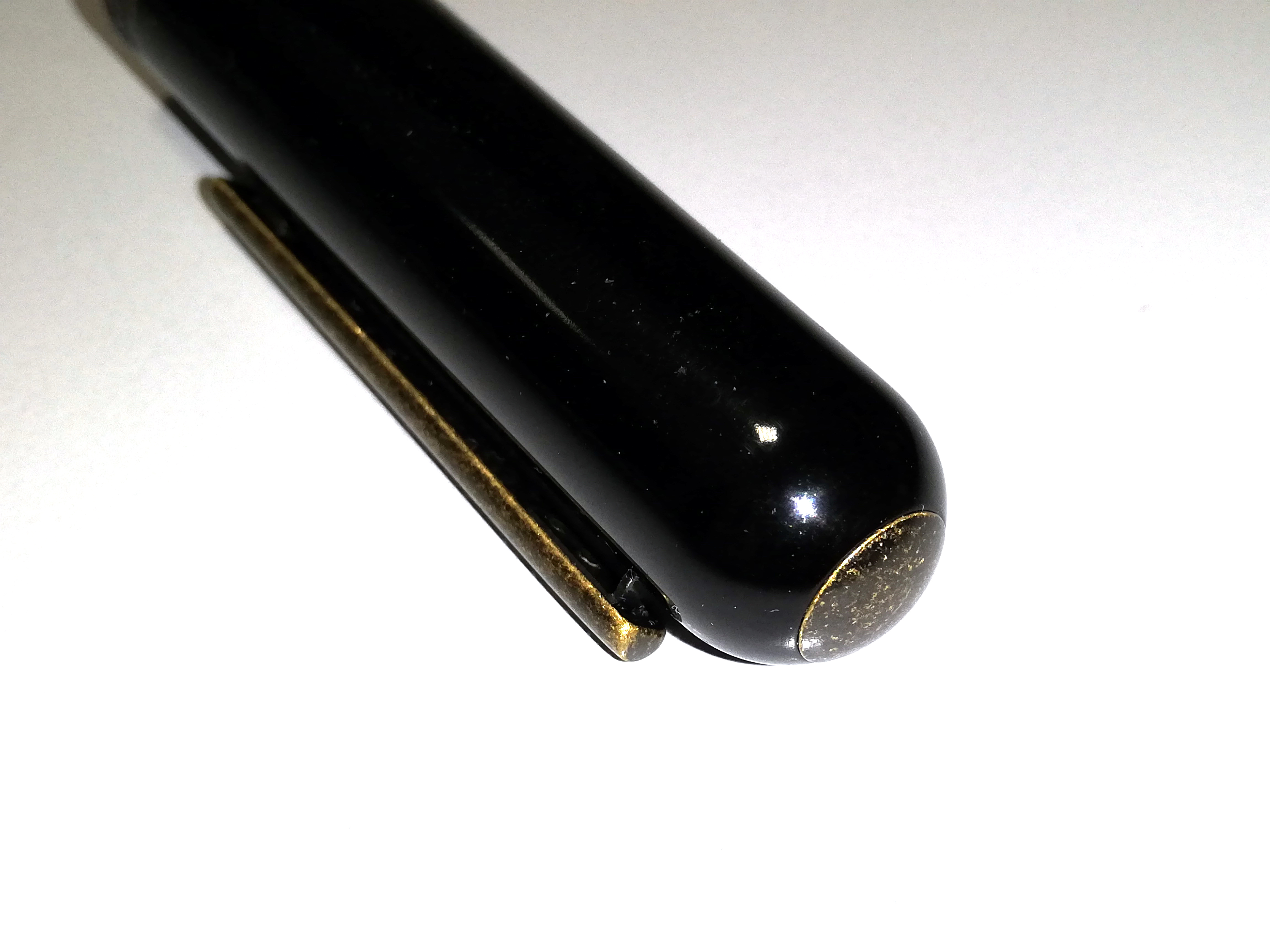 - La penna è realizzata in ebanite, e mi è sembrata piuttosto leggera. Non presenta sbavature né segni di stampo e gli inserti in bronzo sono ben definiti, con colore uniforme su tutta la penna. Incluso il tappo è lunga 14.9 cm, che diventano 13.2 cm quando il tappo è svitato, e larghezza costante pari ad 1.4 cm. La penna pesa 34,2 g (il solo tappo pesa 13 g) e dovrebbe contenere intorno ad un ml di inchiostro (carica pesa 35g esatti). L’estremità alta è arrotondata ed il tappo non può essere calzato.