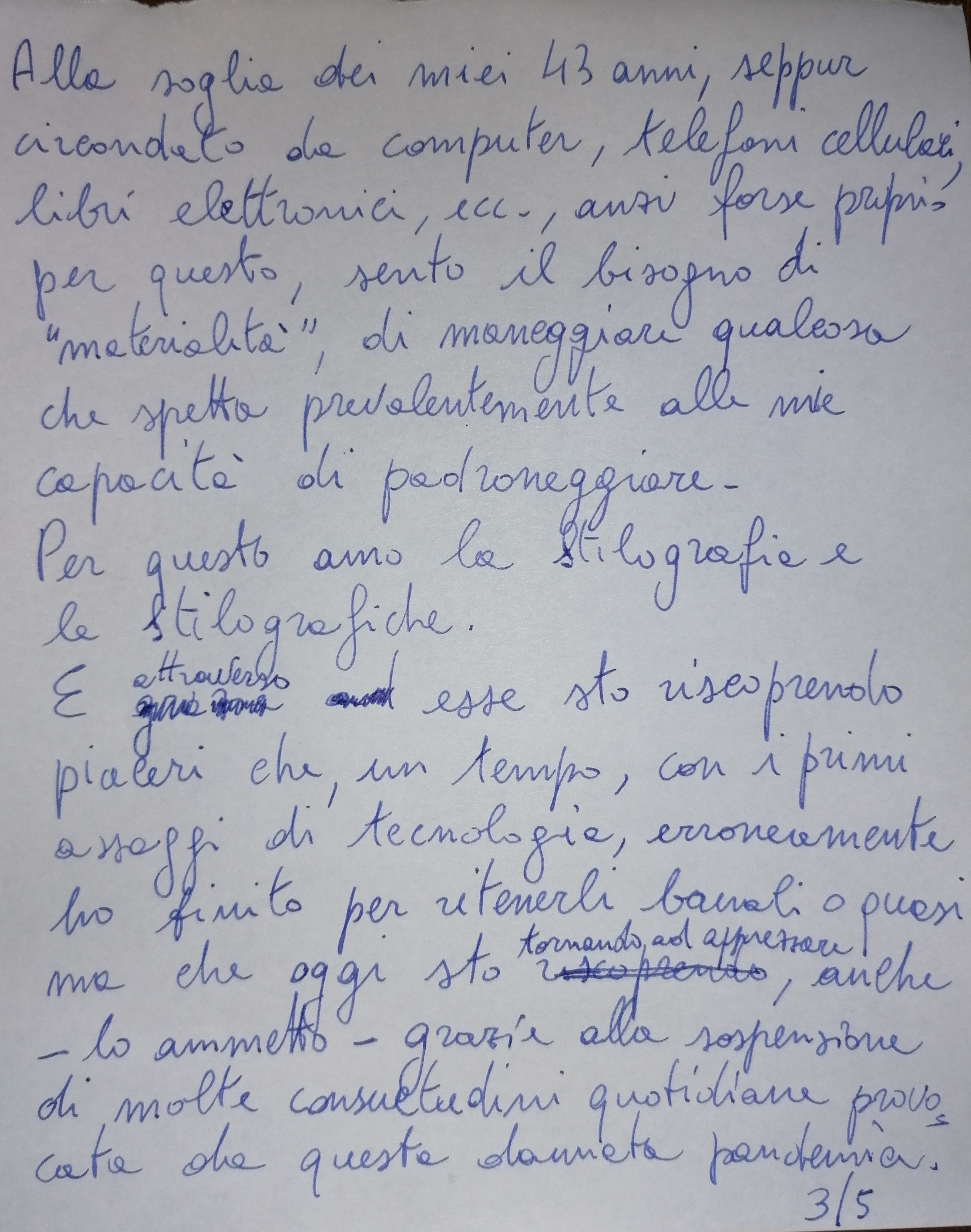 ), alla scrittura stilografica, e a preparami un buon tè a foglie sfuse. Anche se la tecnologia non va demonizzata, ma compresa e usata, senza farci usare da questa.