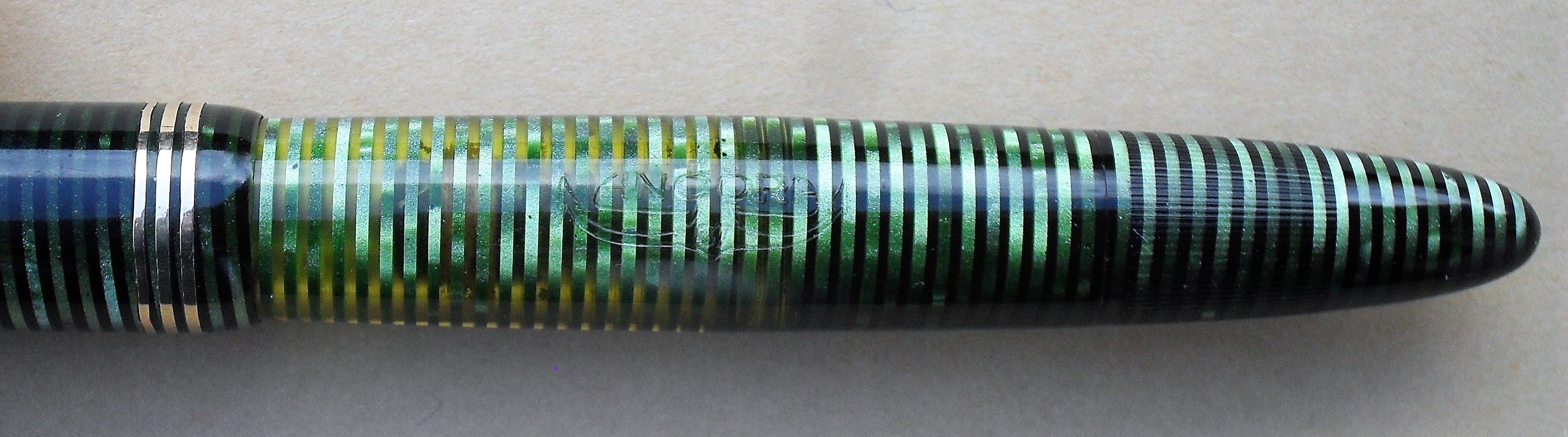 Il serbatoio è verde/giallo trasparente, cappuccio e fondello verde/nero, sono in effetti due barre di celluloide differenti accoppiate per dare l'effetto voluto