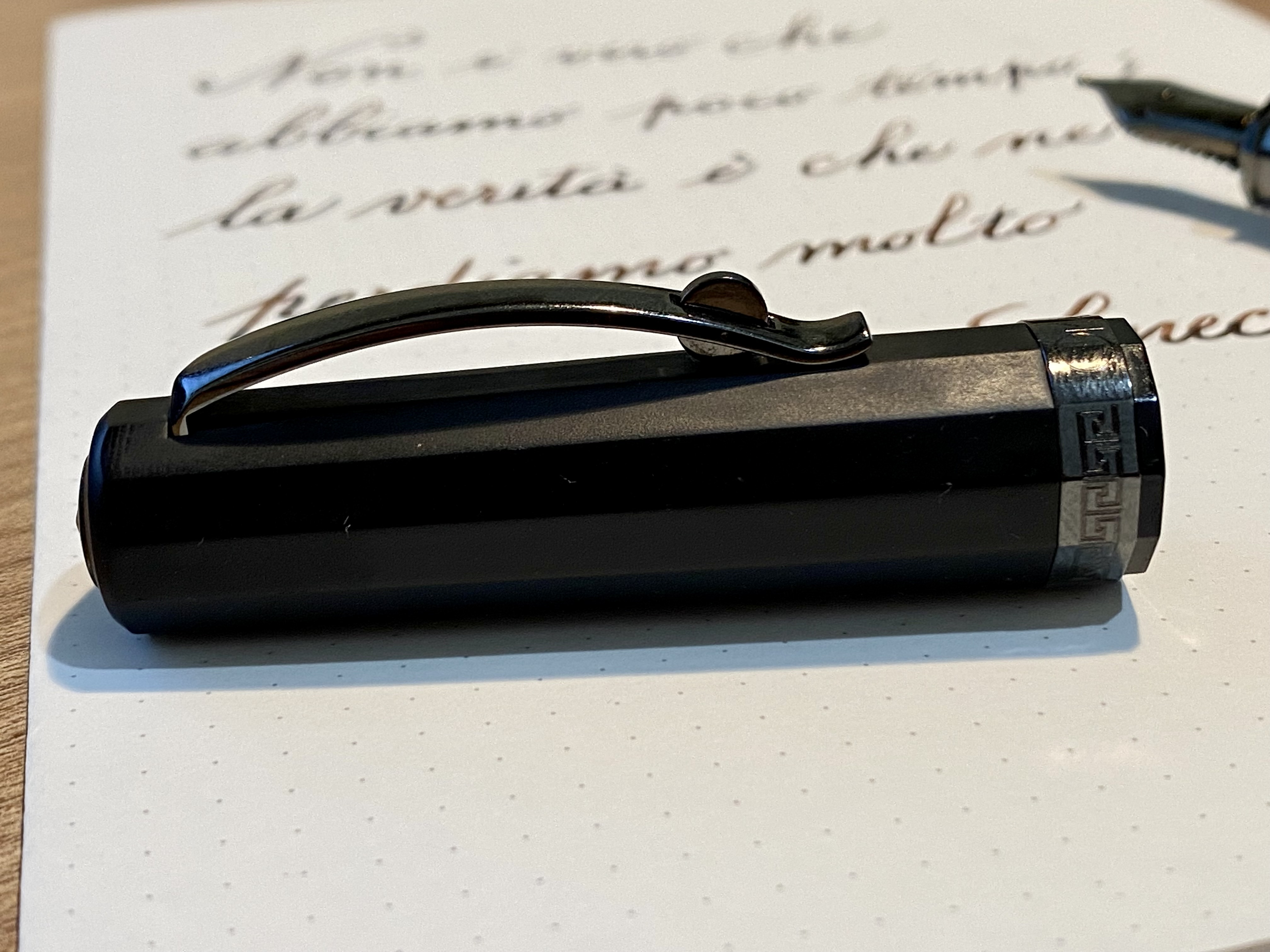 La The Paragon ha avuto la pretesa di essere un termine di paragone, chi più chi meno lo sono state nelle diverse versioni che si sono avvicendate, direi principalmente un termine di paragone stilistico però, sono penne con le loro imperfezioni, ma quale non ne ha. La The Paragon, è grossa, ha una sezione in metallo che non è la più adatta a lunghe sessioni di scrittura, è sbilanciata in avanti ed il pistone non è il top dell'affidabilità, ma la sua eleganza trovo che sia ineguagliabile, specialmente poi vestita di questo look nero opaco con finiture nero lucido.Peccato che questo modello non abbia mai visto la luce, almeno ufficialmente, anche se OMAS ha prodotto una collezione che le assomiglia moltissimo, la Einaudi. La The Paragon della collezione Einaudi si differenzia da questa sostanzialmente per la sezione nera satinata e l'anello sul cappuccio con la firma del maestro in luogo della greca.