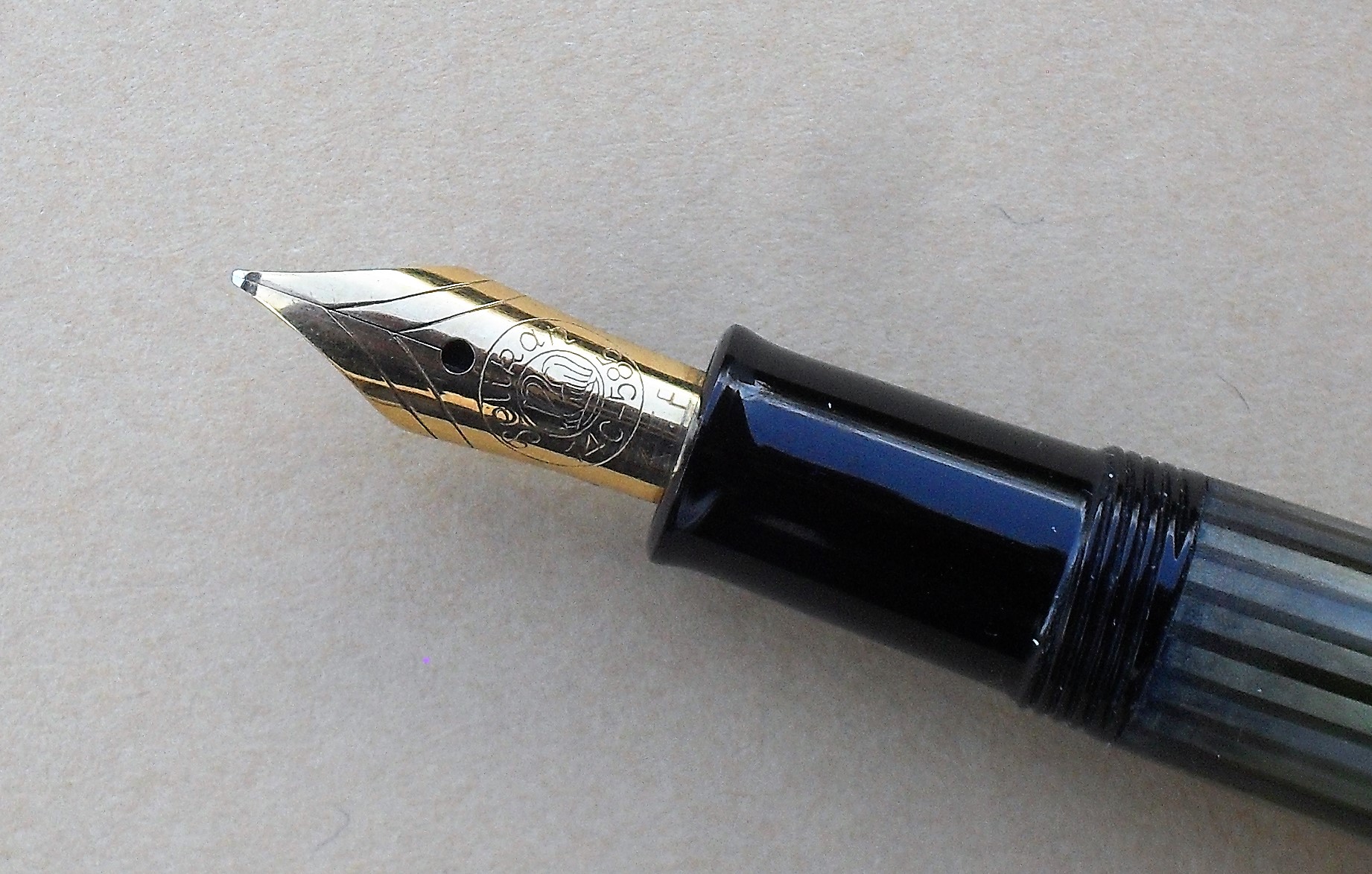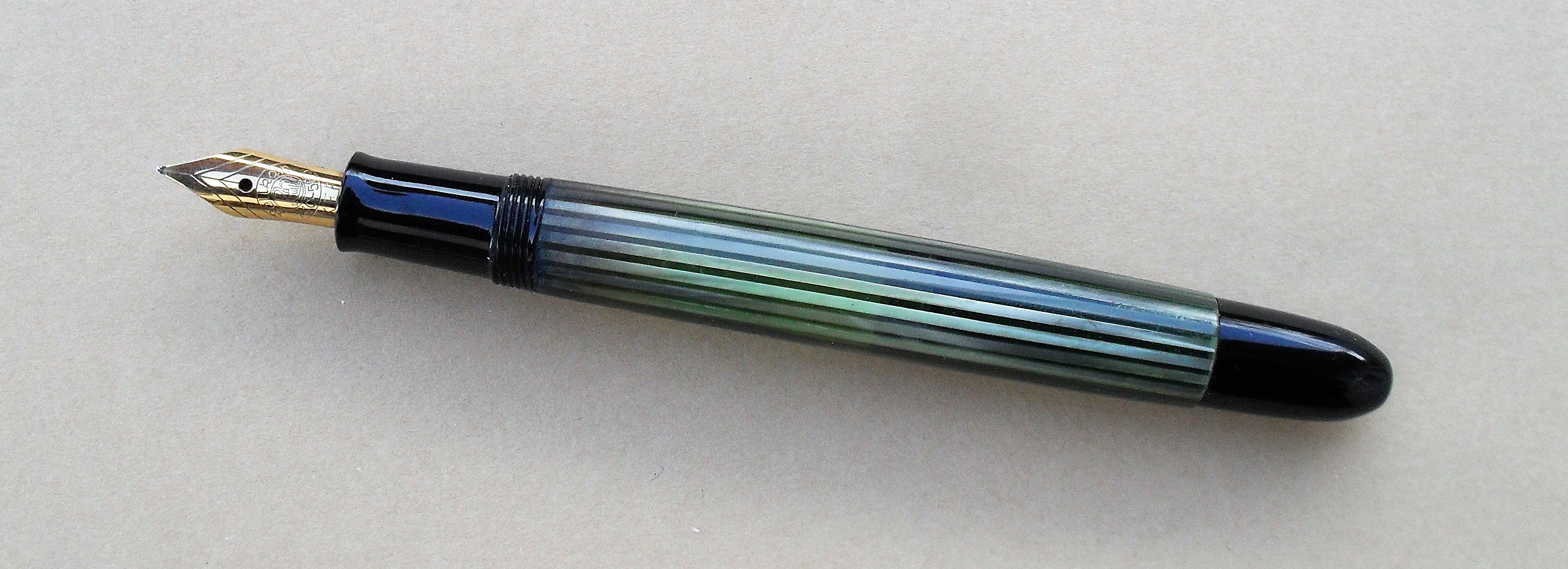 Fra le donazioni che mi sono pervenute recentemente da un fondo di magazzino rientra anche la stilografica che vedete, che mi è stata consegnata con il cappuccio sbagliato (quello di una M400 anni '90, che ho omesso nella fotografia. Poco male, a caval donato...):