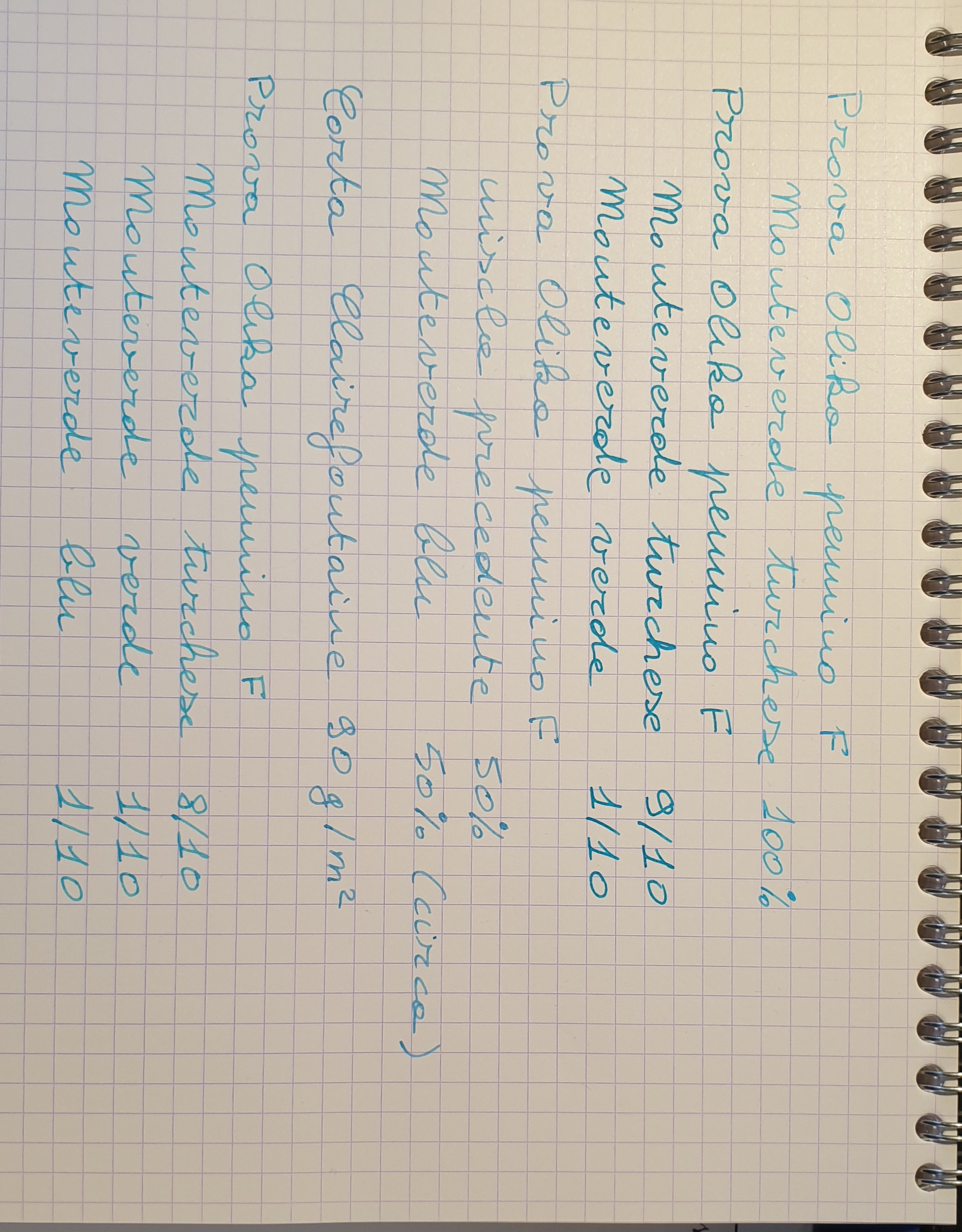 Le penne sono tutte Monami-Olika con pennino F (volevo che il risultato fosse meno influenzato dal tipo di penna/pennino...anche se la quarta utilizzata sembra un po' meno scorrevole delle altre).
