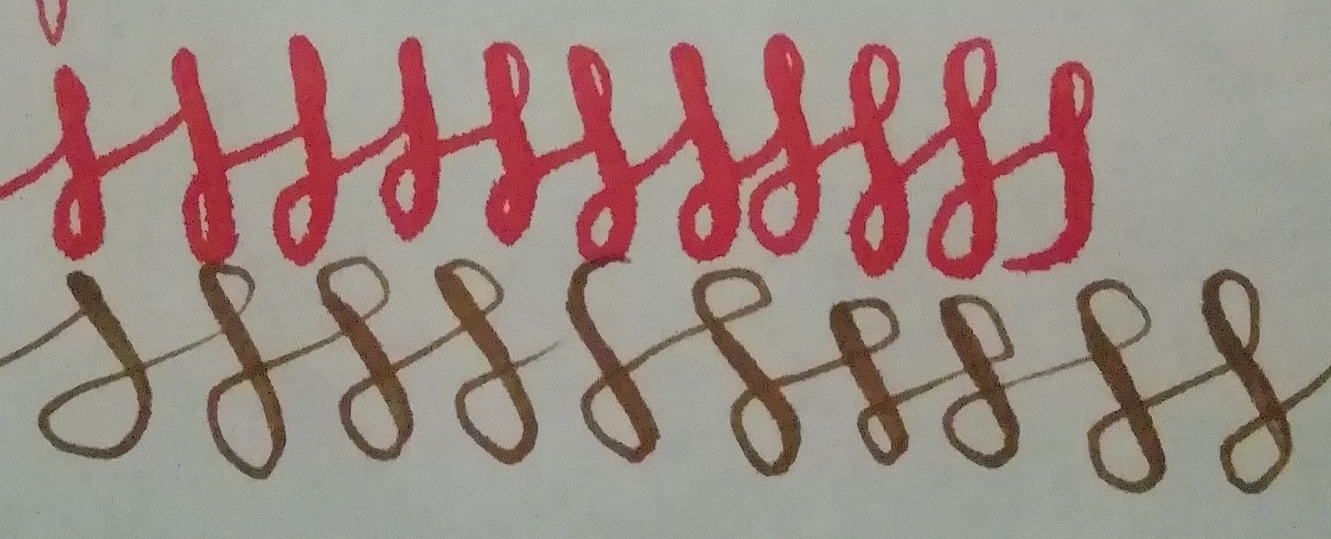 Il bruno è abbastanza simile, giusto un po' più dorato nella realtà forse. La penna è diversa, sempre un pennino molto flessibile ma un po' più fine. Lo spiumaggio è molto ridotto e anche il trapasso.
